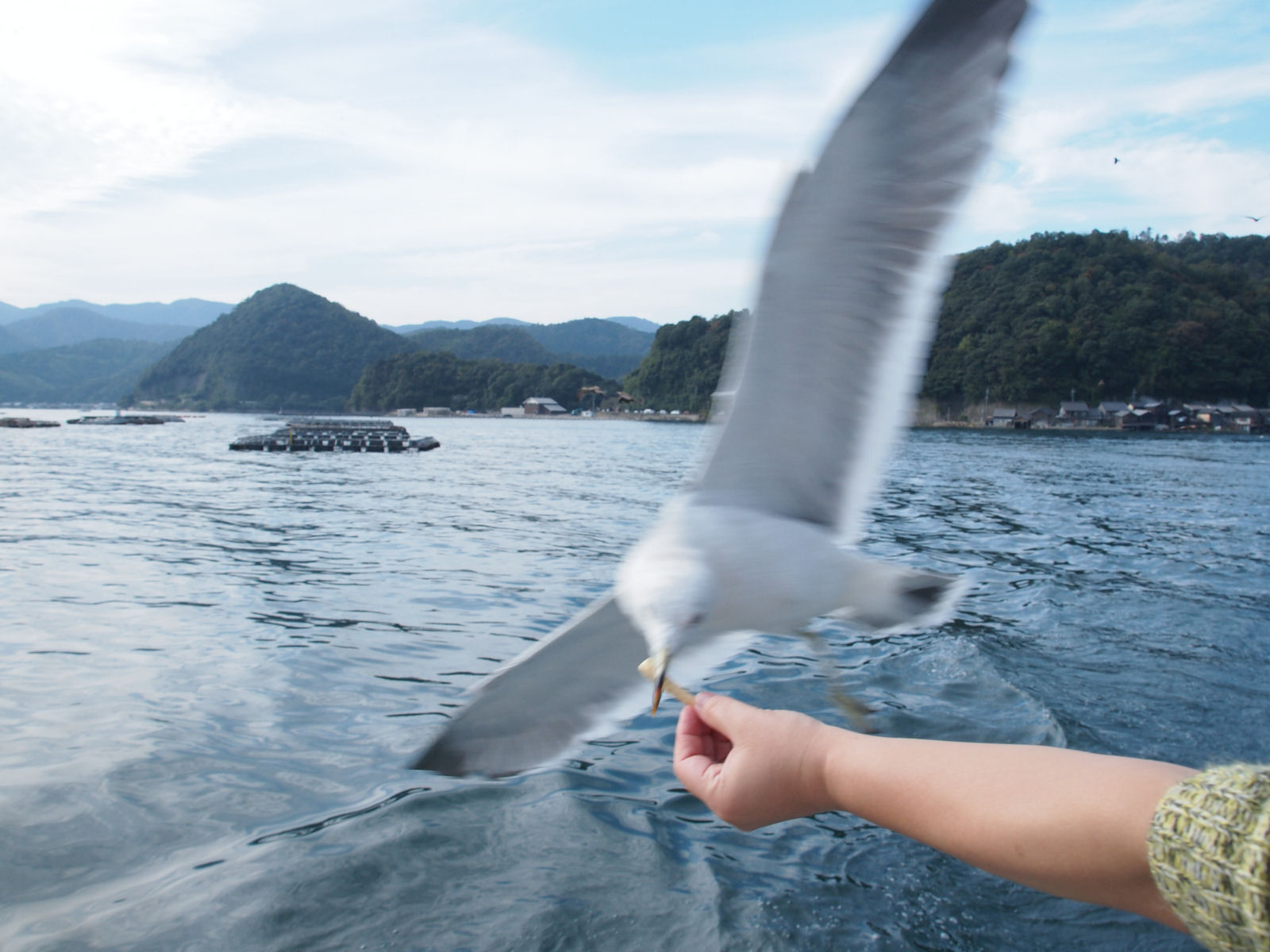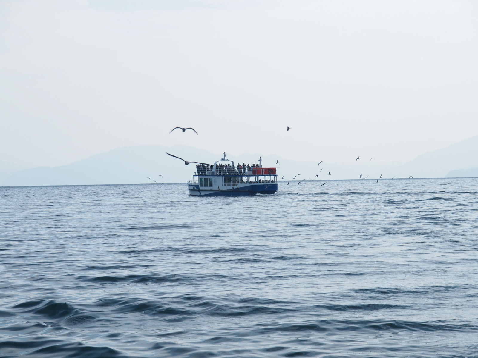 遊覧船が出航すると,観光客のエサ目当てでカモメやウミネコが集まってきました. |
