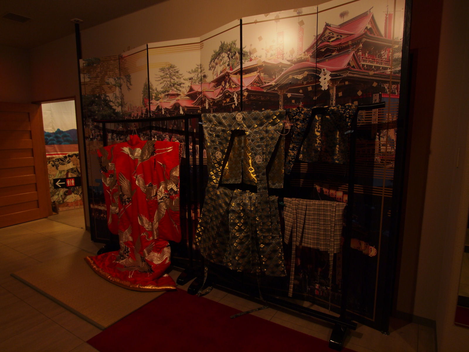 4月に行われる長浜曳山祭で使われる山車(だし)が展示されています.高さ7m,重さ6トンという巨大なものです. 写真は歌舞伎ロードの記念撮影用衣装. |