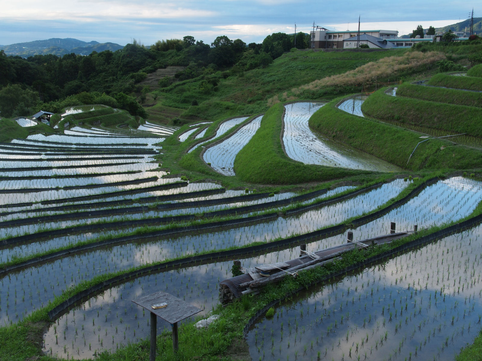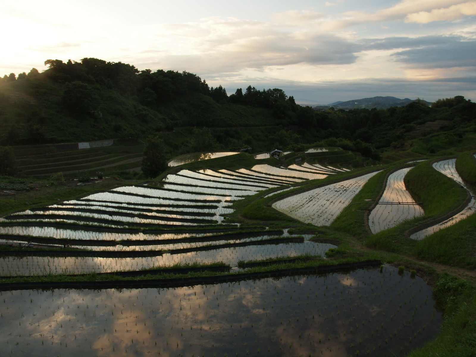 18時半頃の千早赤阪の棚田です. ちなみにこの日の大阪の日没時刻は19時10分と発表されています. 太陽は雲で隠れていましたが,青空が棚田の水面に反射している光景が撮影できました. |
