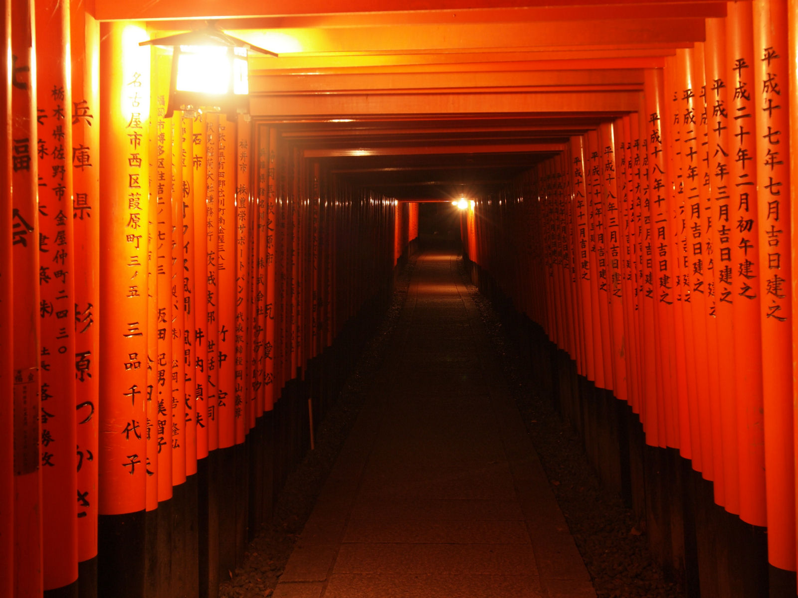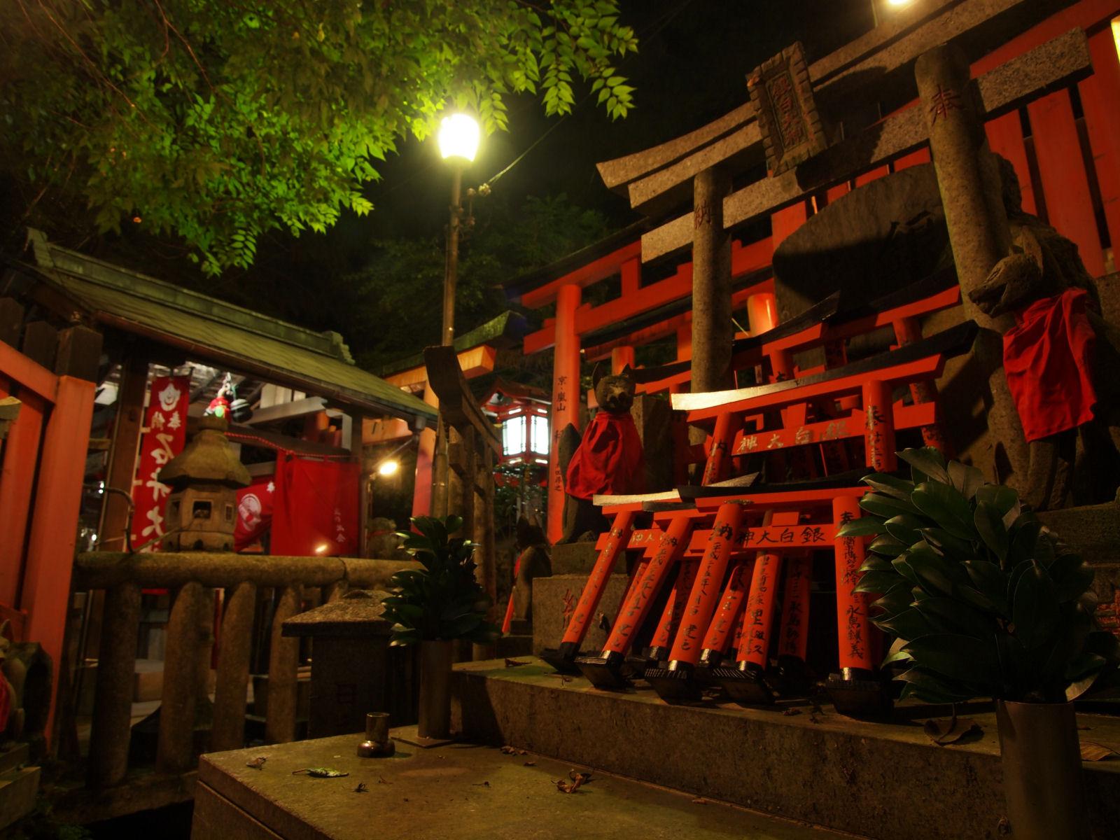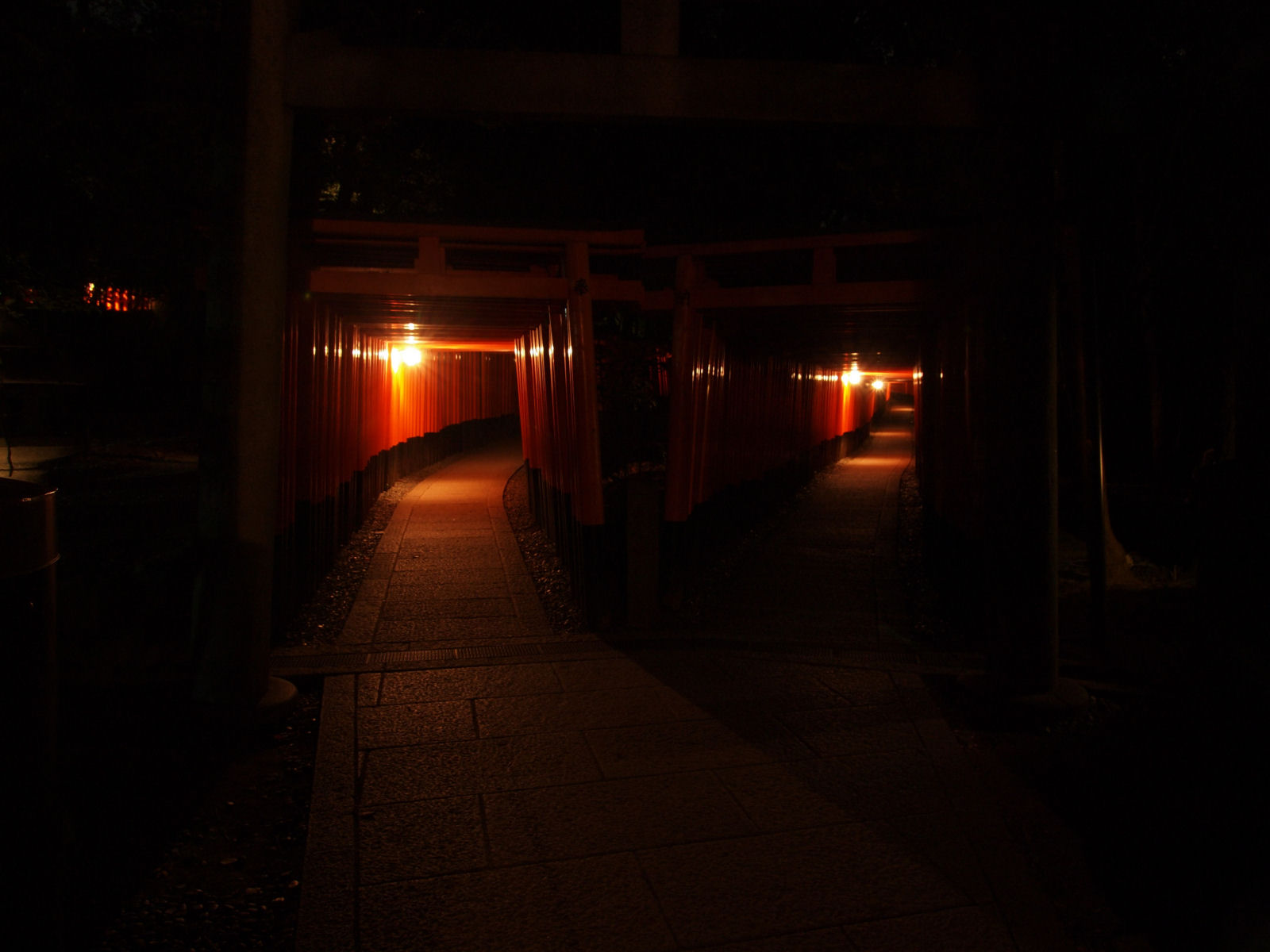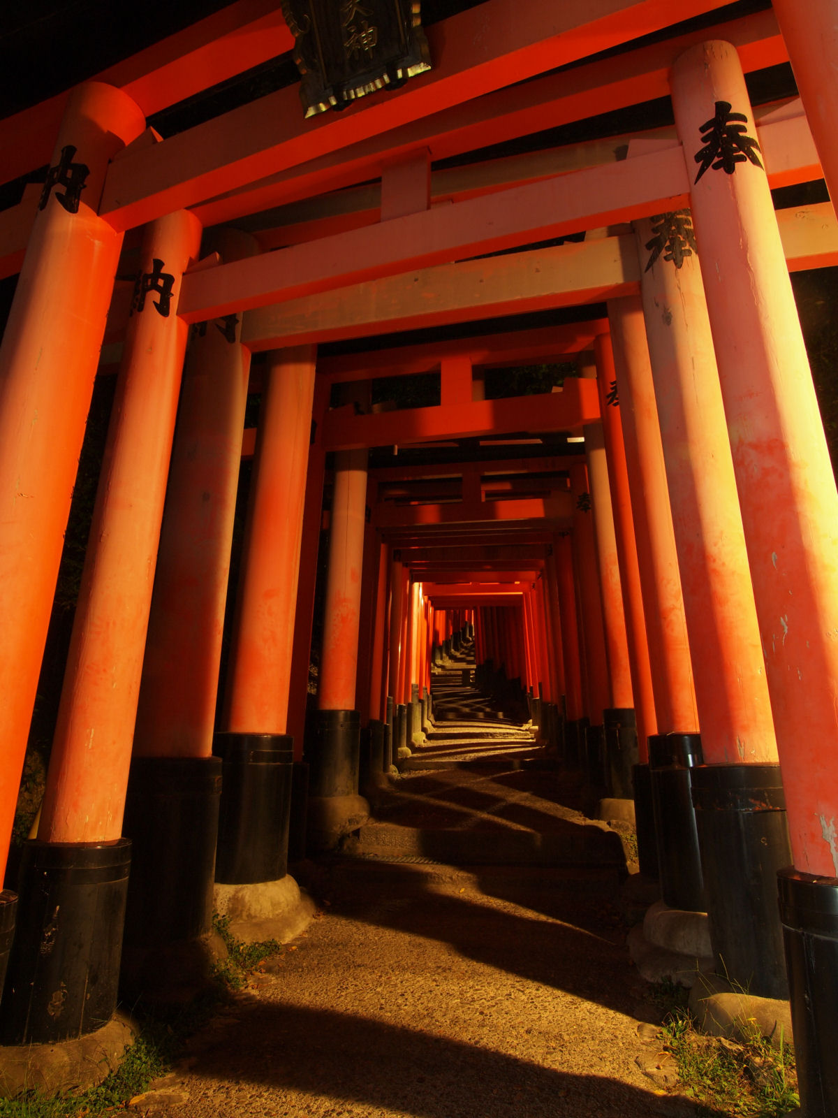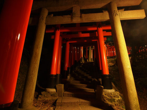 千本鳥居で有名な伏見稲荷大社ですが,ここは夜でも 昼間に比べると人はほとんど見られないものの,本殿から新池辺りまではたびたび人とすれ違いました.肝試し気分の若者グループが多かった気がします. 天気も良く風も少なく,良い写真を撮ることができました. |