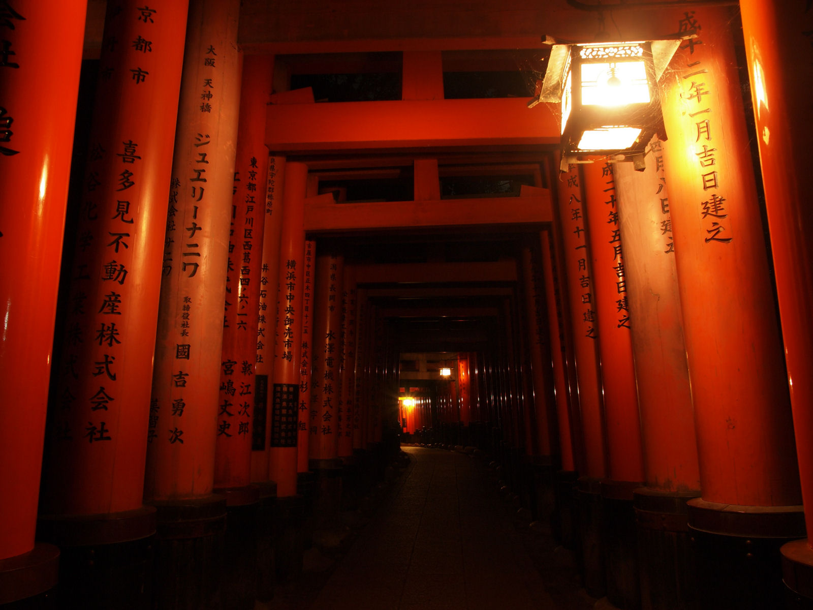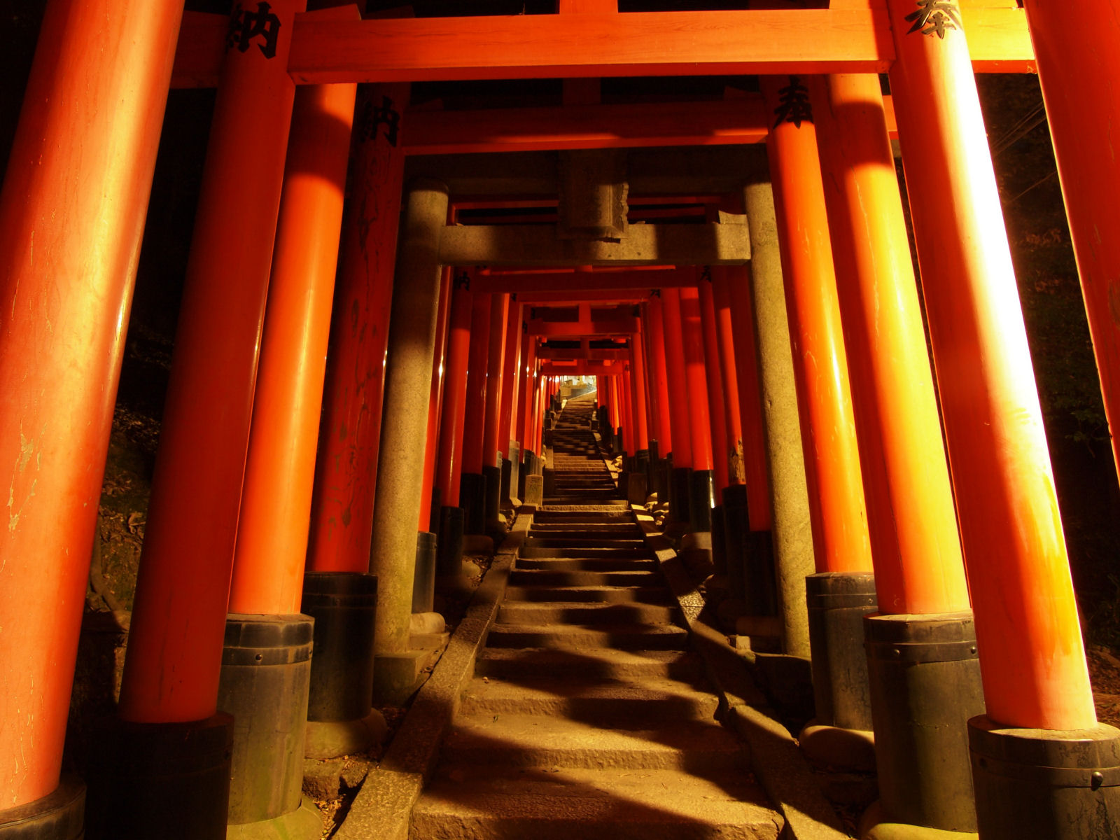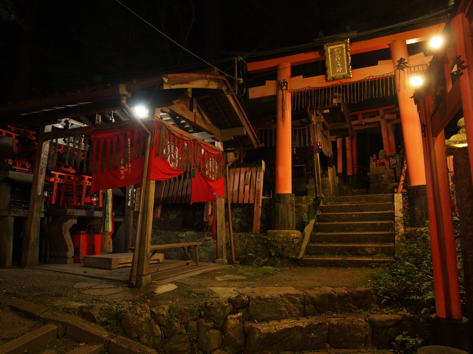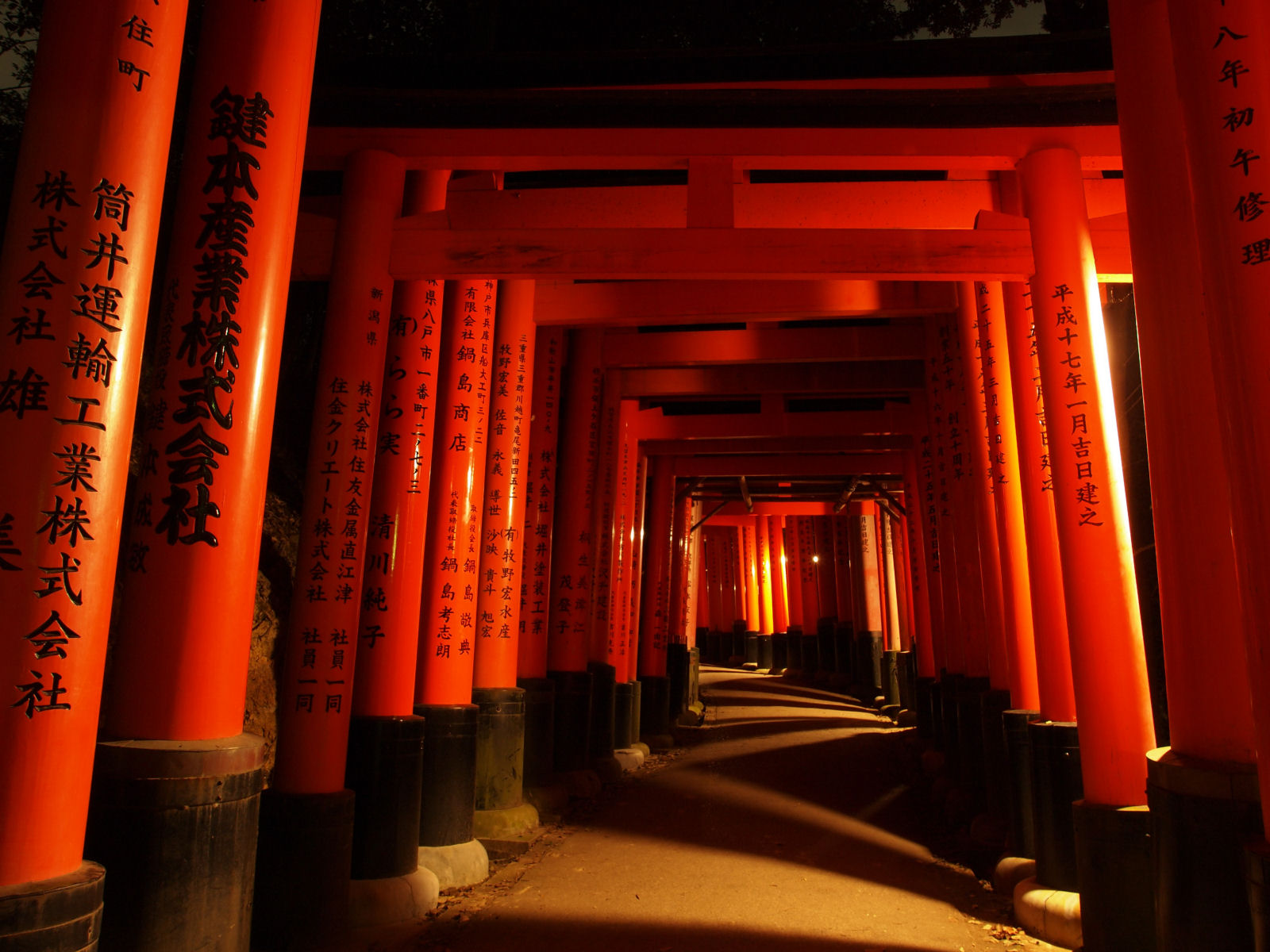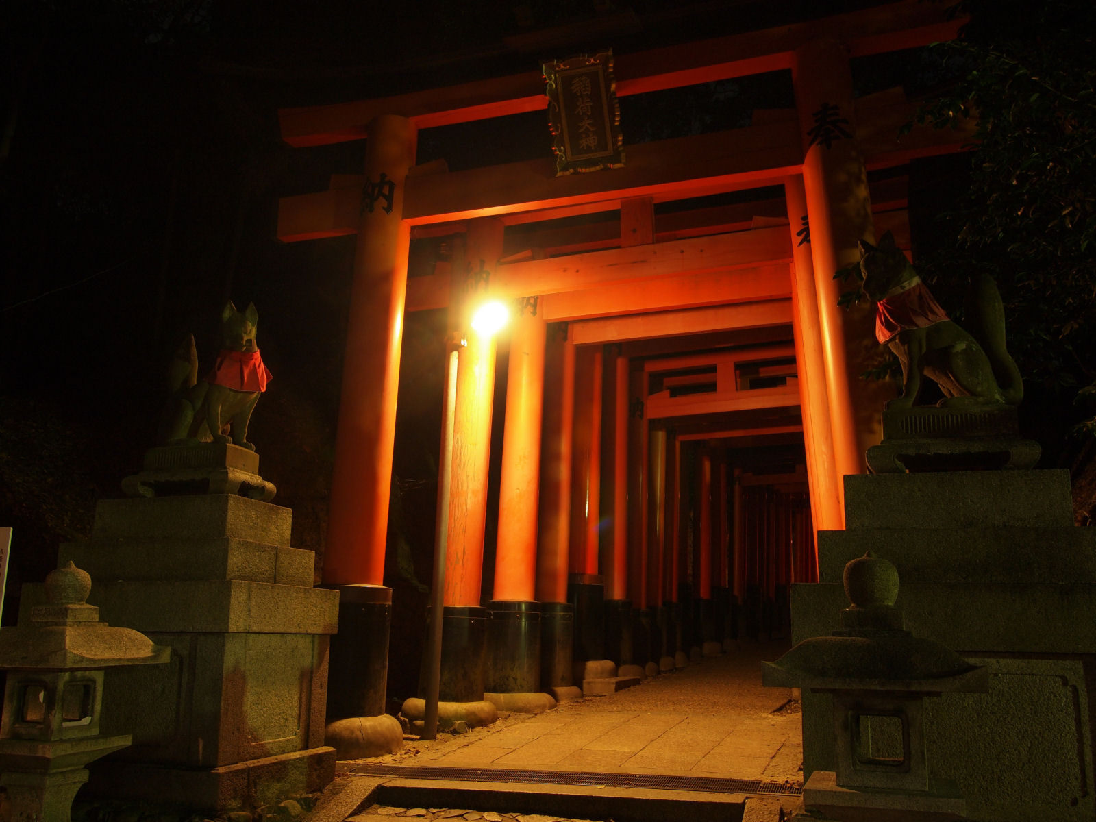 千本鳥居で有名な伏見稲荷大社ですが,ここは夜でも 昼間に比べると人はほとんど見られないものの,本殿から新池辺りまではたびたび人とすれ違いました.肝試し気分の若者グループが多かった気がします. 天気も良く風も少なく,良い写真を撮ることができました. |