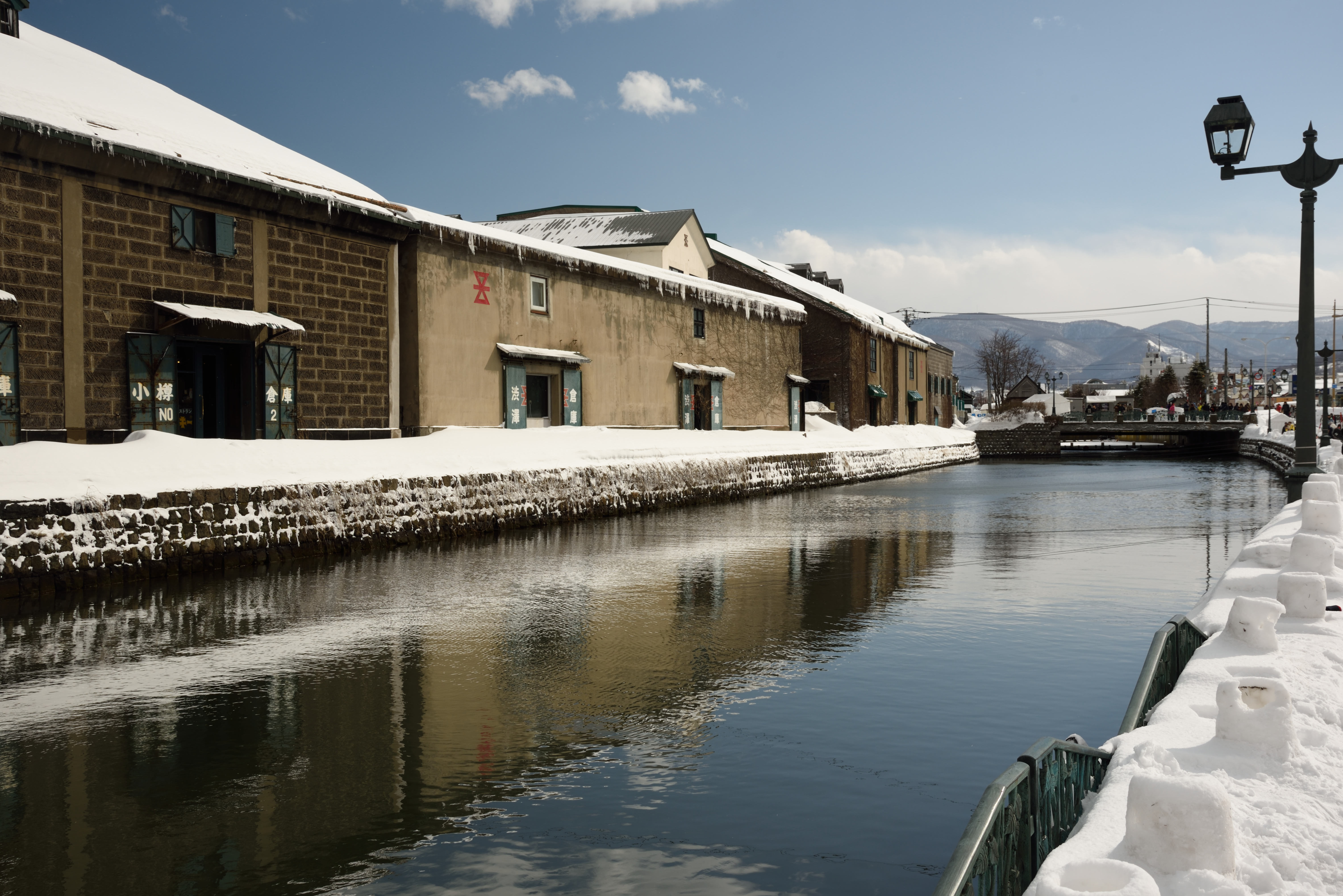札幌で夜の雪まつりを見てから快速電車に乗り込み,小樽には20時ごろに着き,運河や市街で行われているライトアップを撮影しました. その後ホテルに泊まり,次の日に小樽観光をして昼過ぎに小樽を後にしました.朝は吹雪いて視界が悪く外の撮影は絶望的かと思われましたが,昼ごろには幸いにも晴れ,青空の下で小樽運河を撮影することができました. |