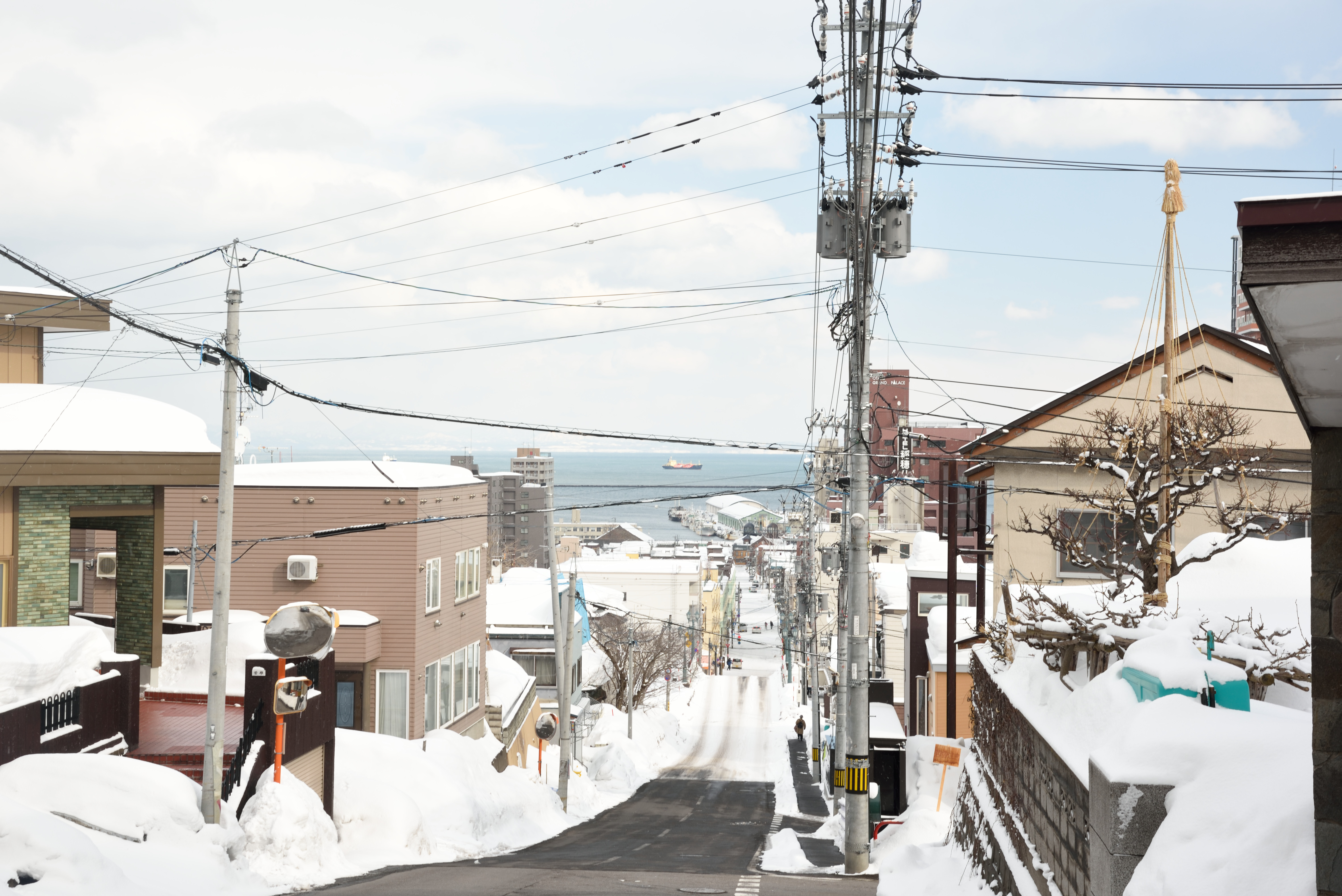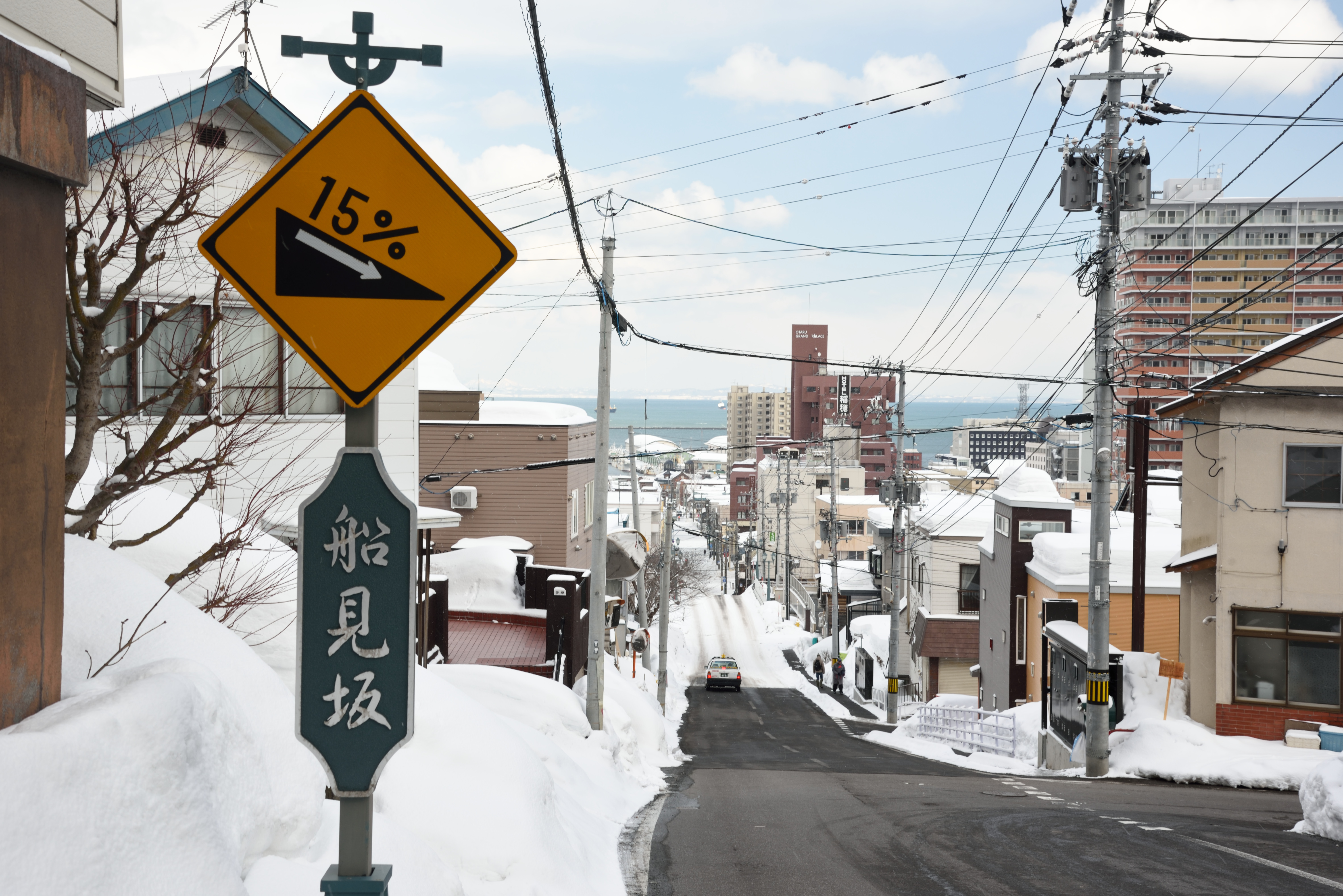 船見坂. 海が見えることで知られています. 朝も1回来ていますが,そのときは吹雪いて海が全く見えませんでした.帰る前に