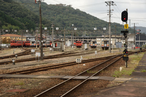 ホームから電車がたくさん停まっているのが見えます.旧津山扇形機関車庫と思われます.