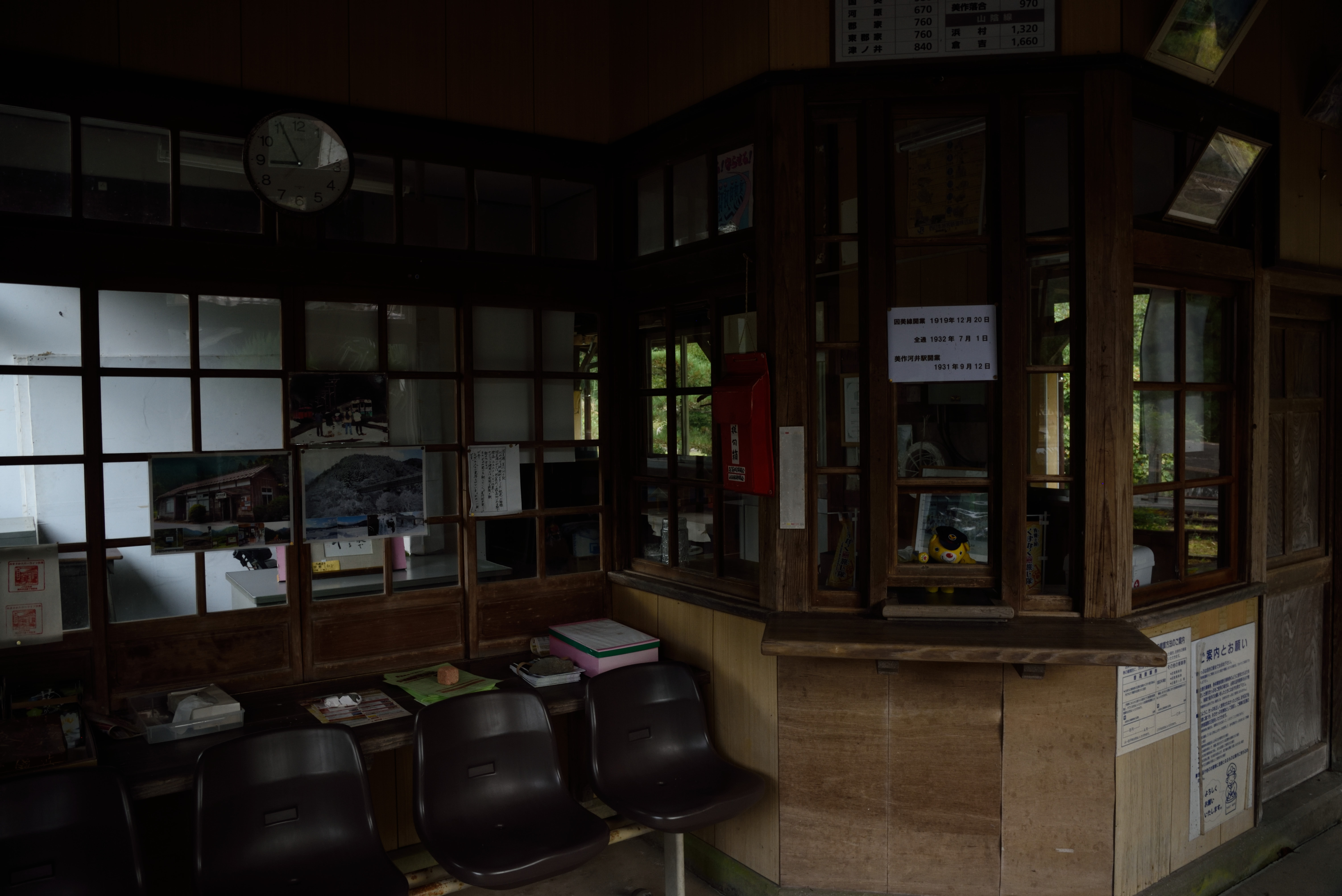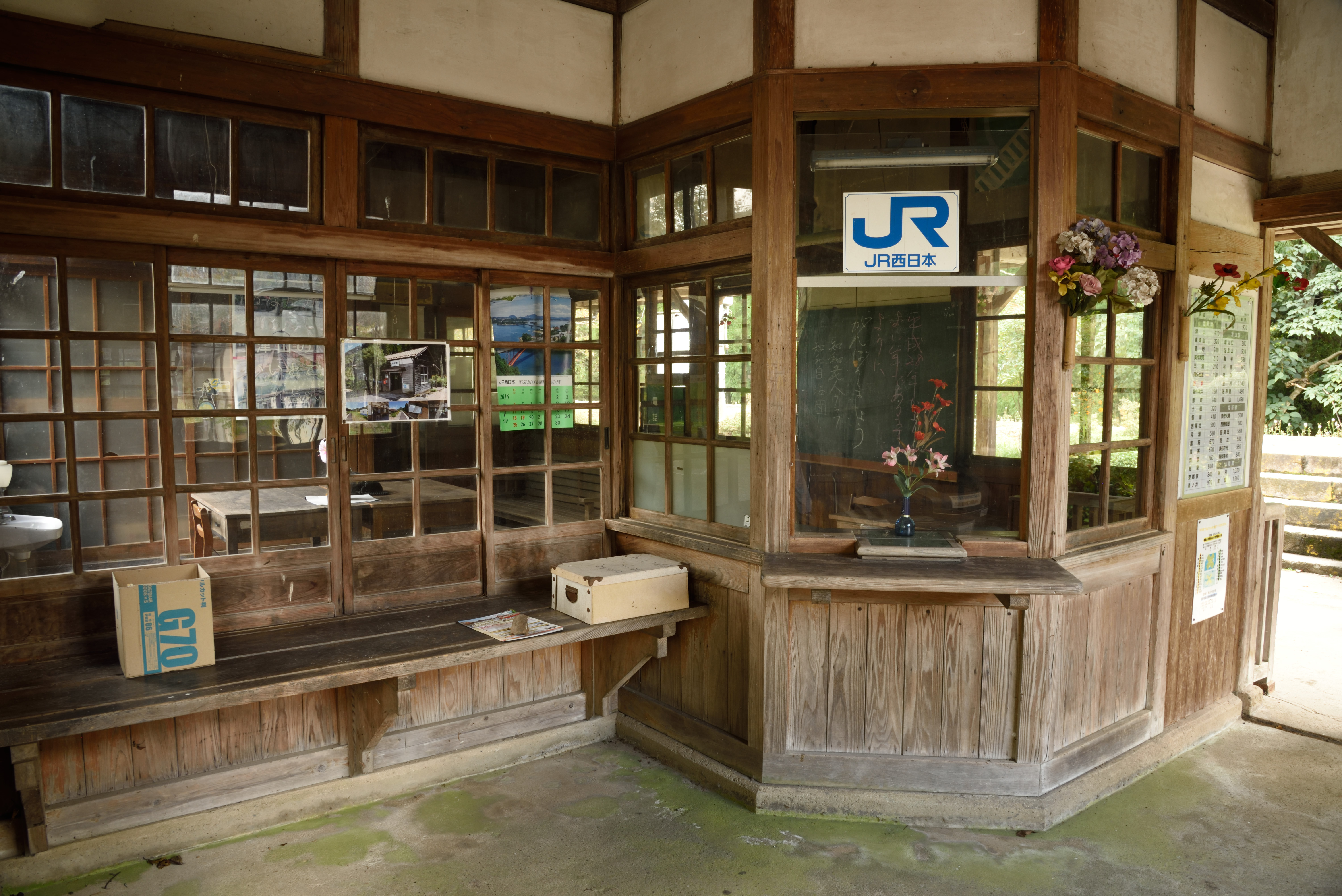 | 駅舎.駅員はいませんが,花瓶があったり黒板に字が書かれたりといった演出があります. |