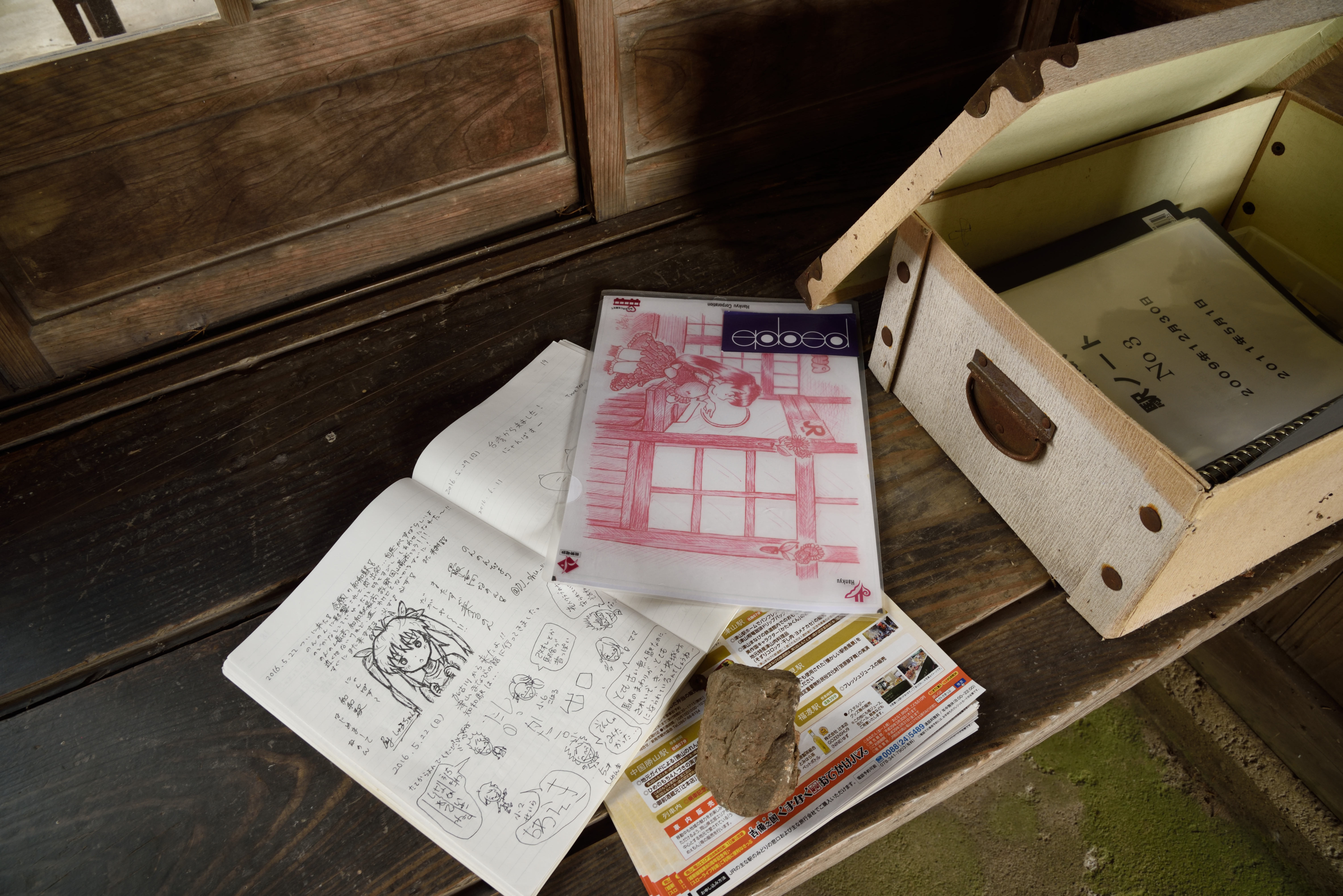 駅ノート.様々な人が訪れています. アニメの舞台になったようで,それ関係の書き込みが多いです. |
