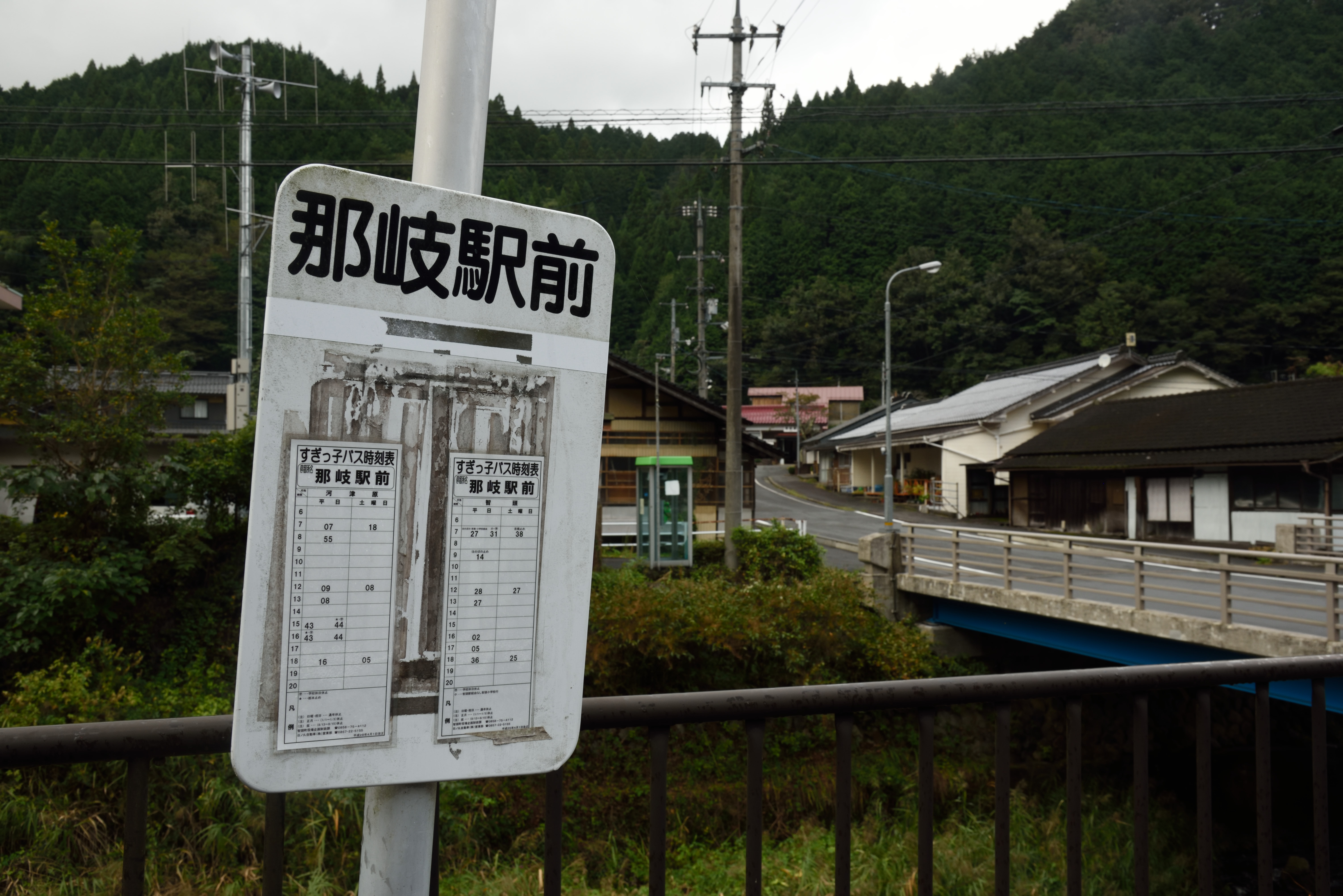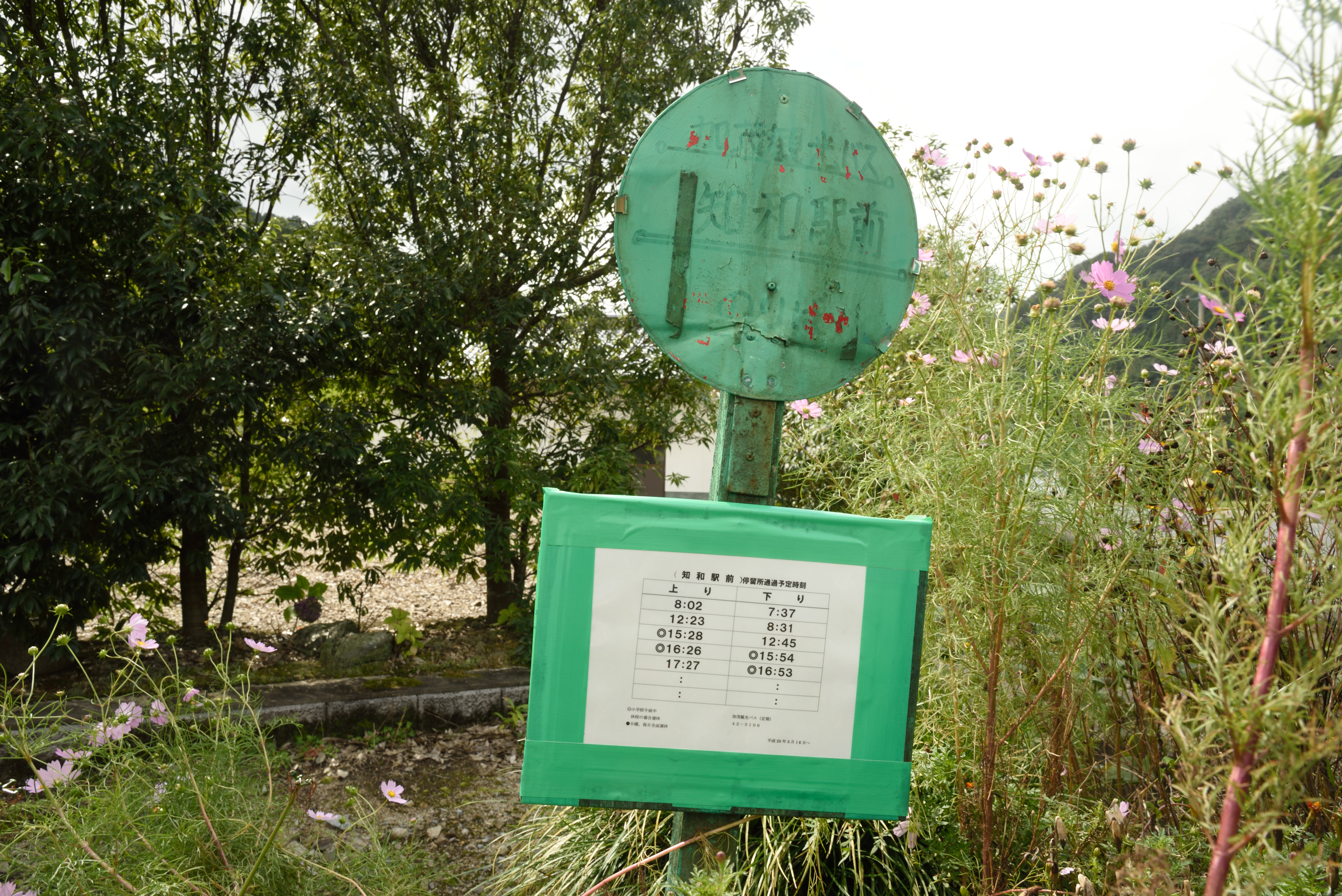 | バス停の時刻表.本数は極めて少なく,さらに日祝日は運休です. |