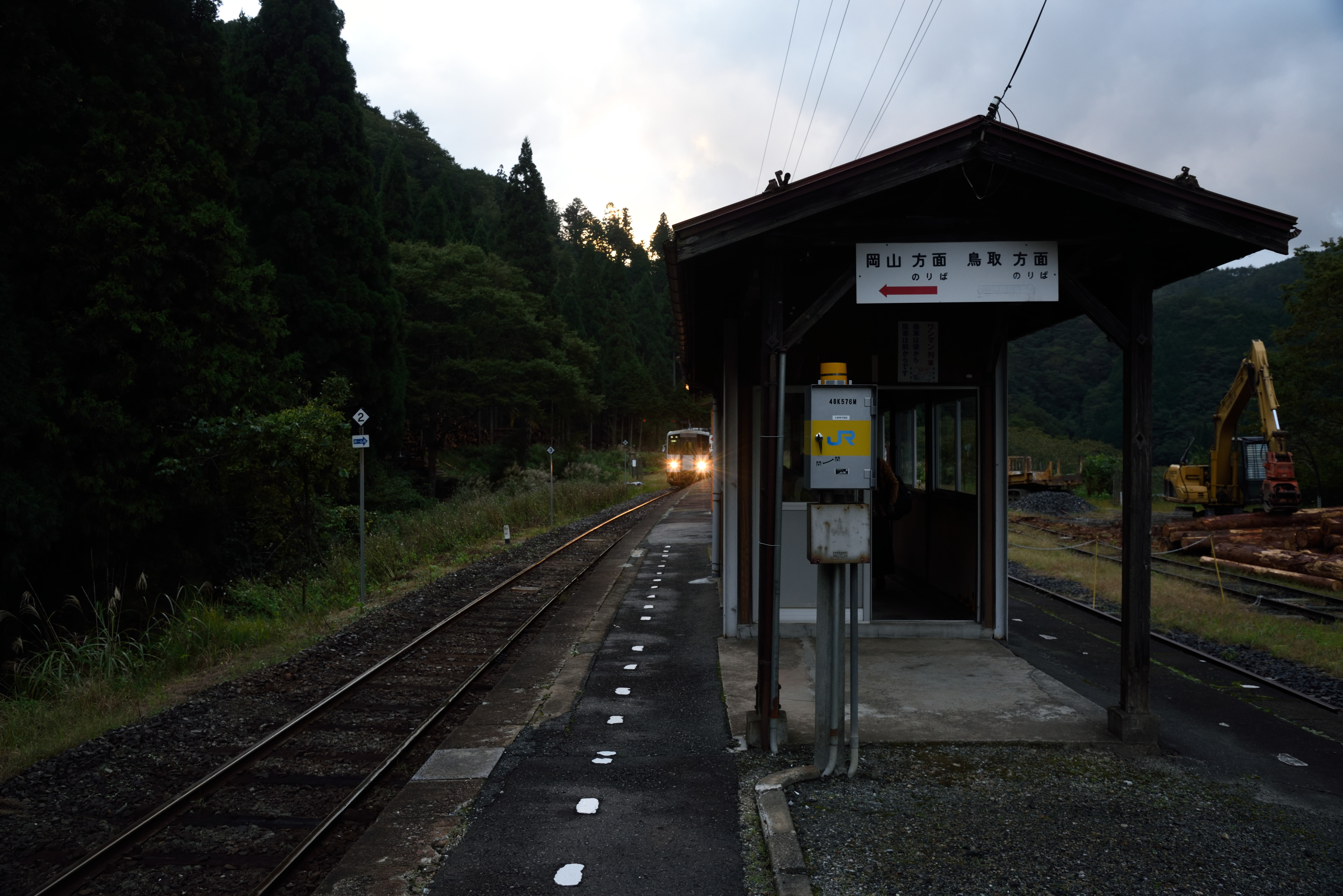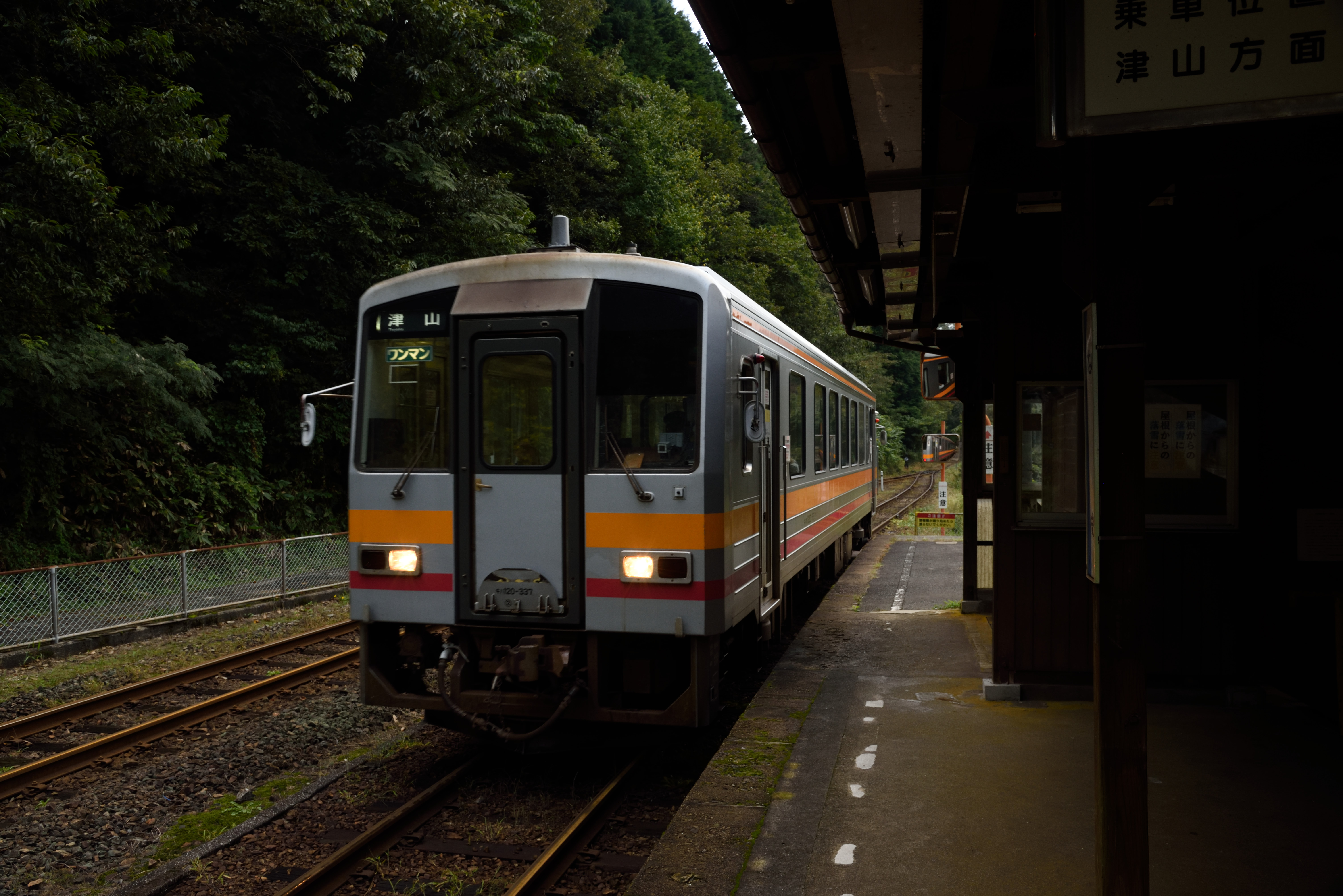 | この日最後に訪れた駅は,美作河井駅です.天気は引き続き降ったりやんだりです. |