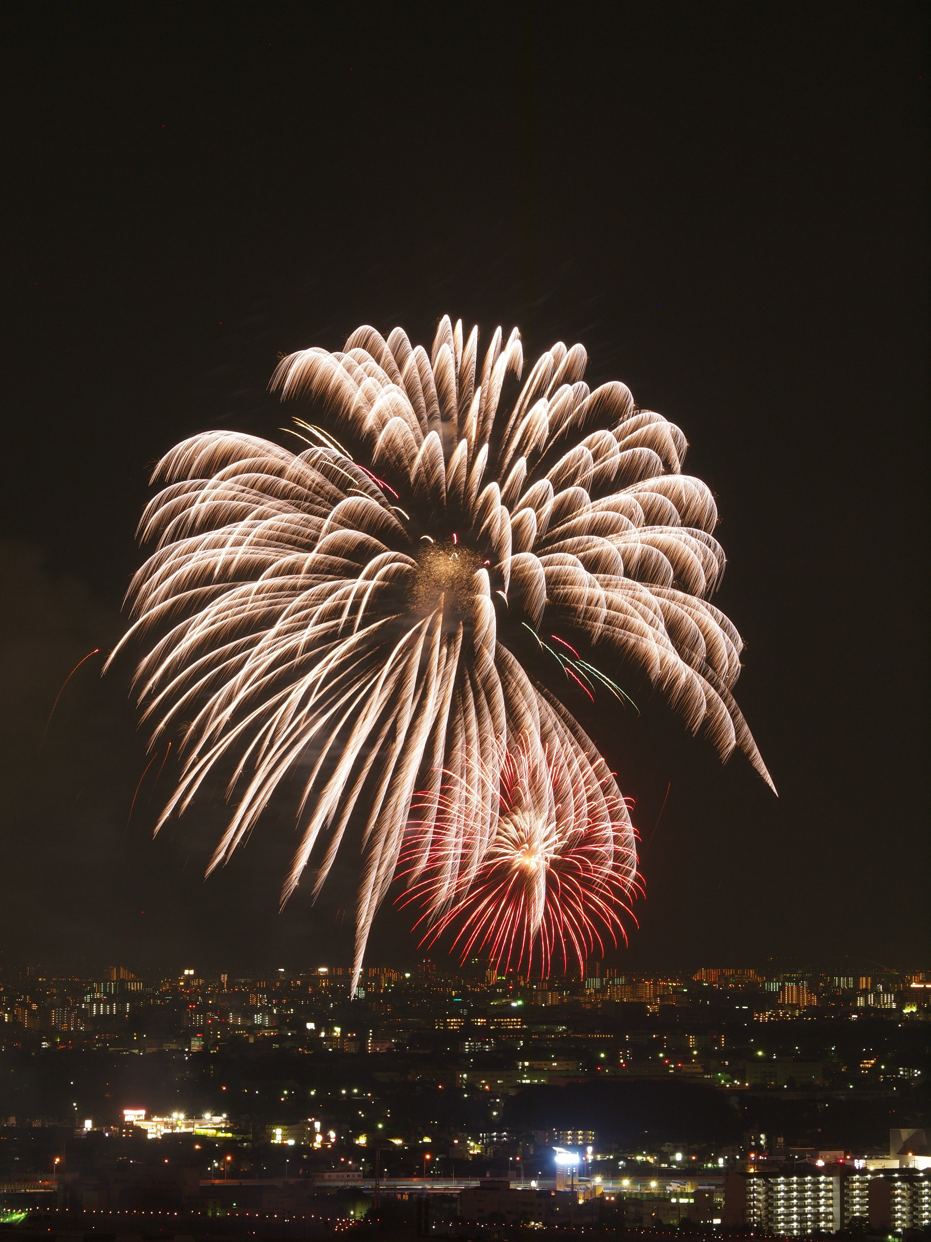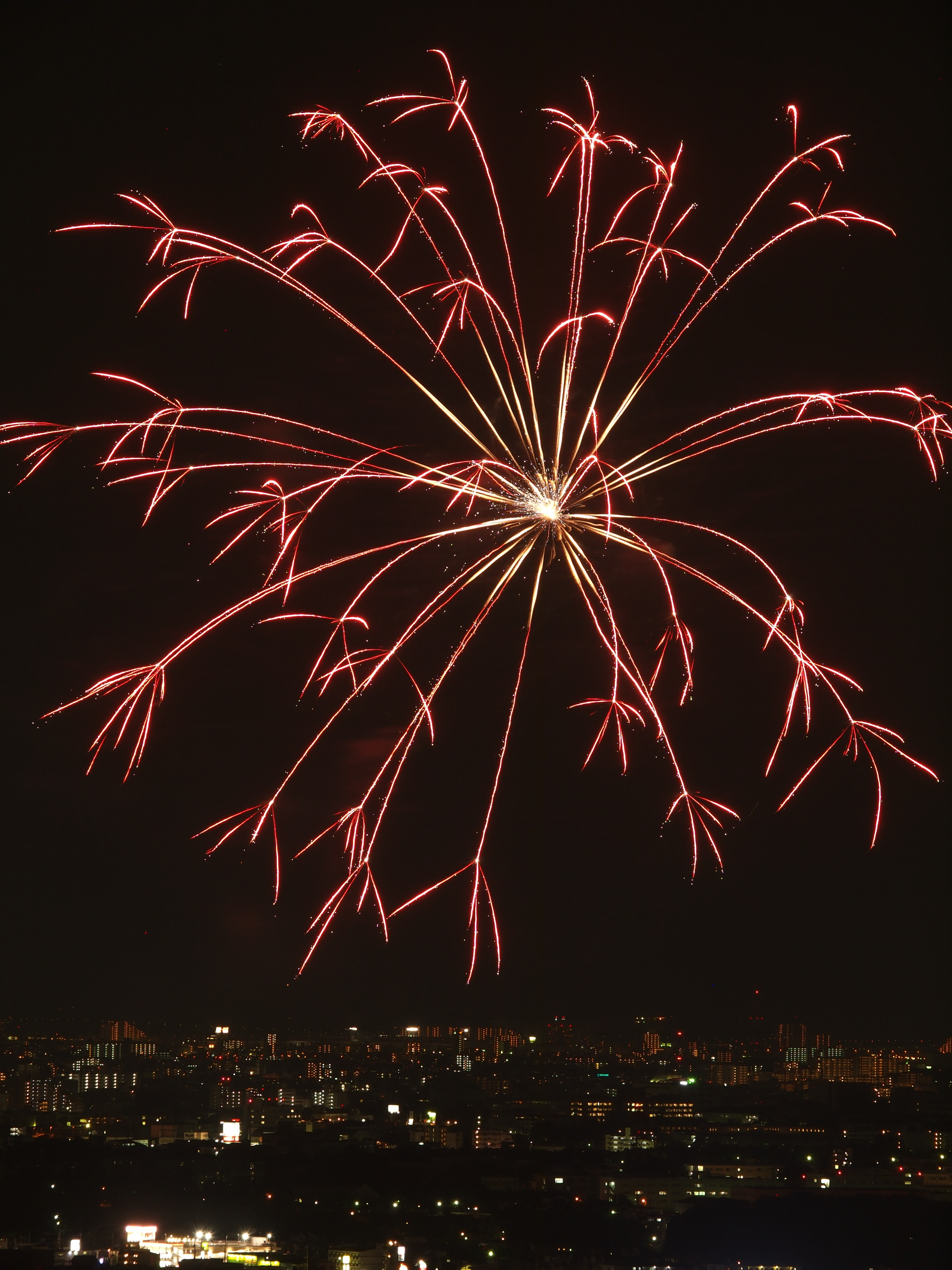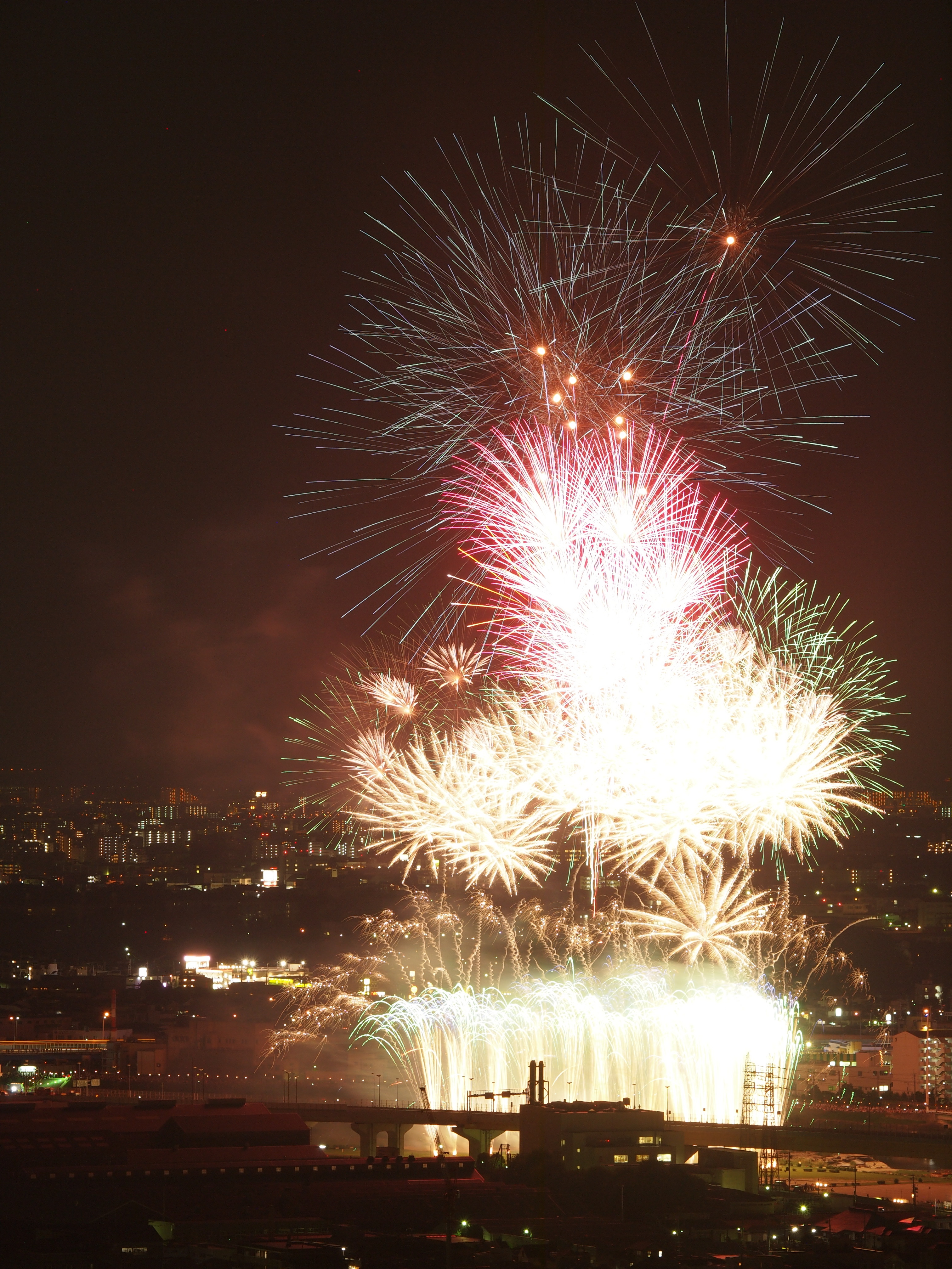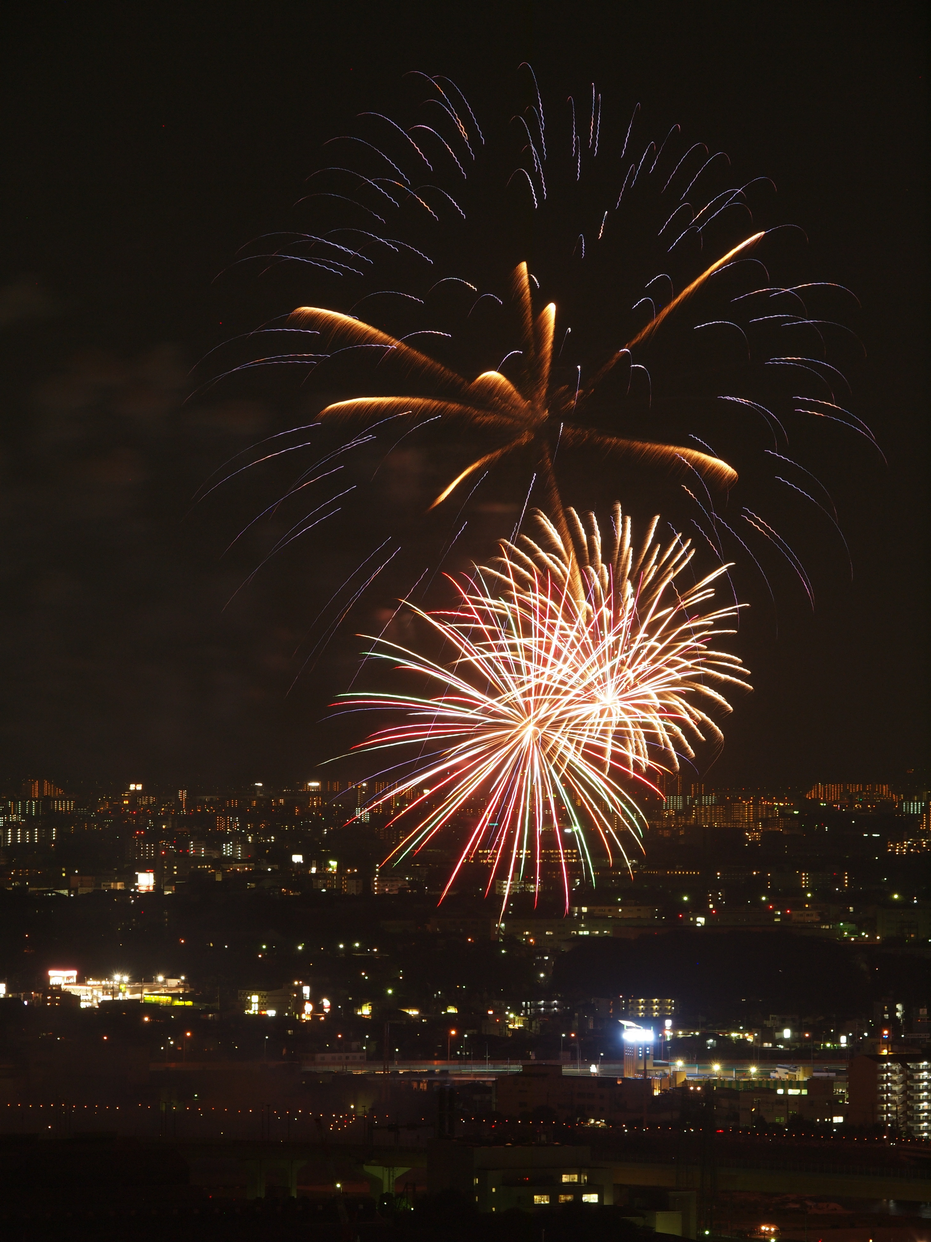 猪名川花火大会 from 五月山 2015/8/15(11年前) 猪名川花火大会に行ってきました.花火を撮影するのは9年ぶりです. 撮影場所は五月山の秀望台.会場から2kmほど離れた展望台です. 花火が行われる前の写真. 1時間以上前に着きましたが,人は結構いました. 上の写真はその頃のものです.会場に人が集まっています.手前の端(呉服橋)は車は渋滞気味ですが,人はまださほどいません. 下の写真は開始予定時間のものです.呉服橋にも人が集まっています. 予定よりも20分以上遅れましたが,始まりました. ポートレートに切り替えました. カメラを寝かせたため不安定になったのか,よくよく写真を見るとブレと思われるものが見られます.レリーズを使っていたのですが,望遠ということもあり,なかなかシビアです.