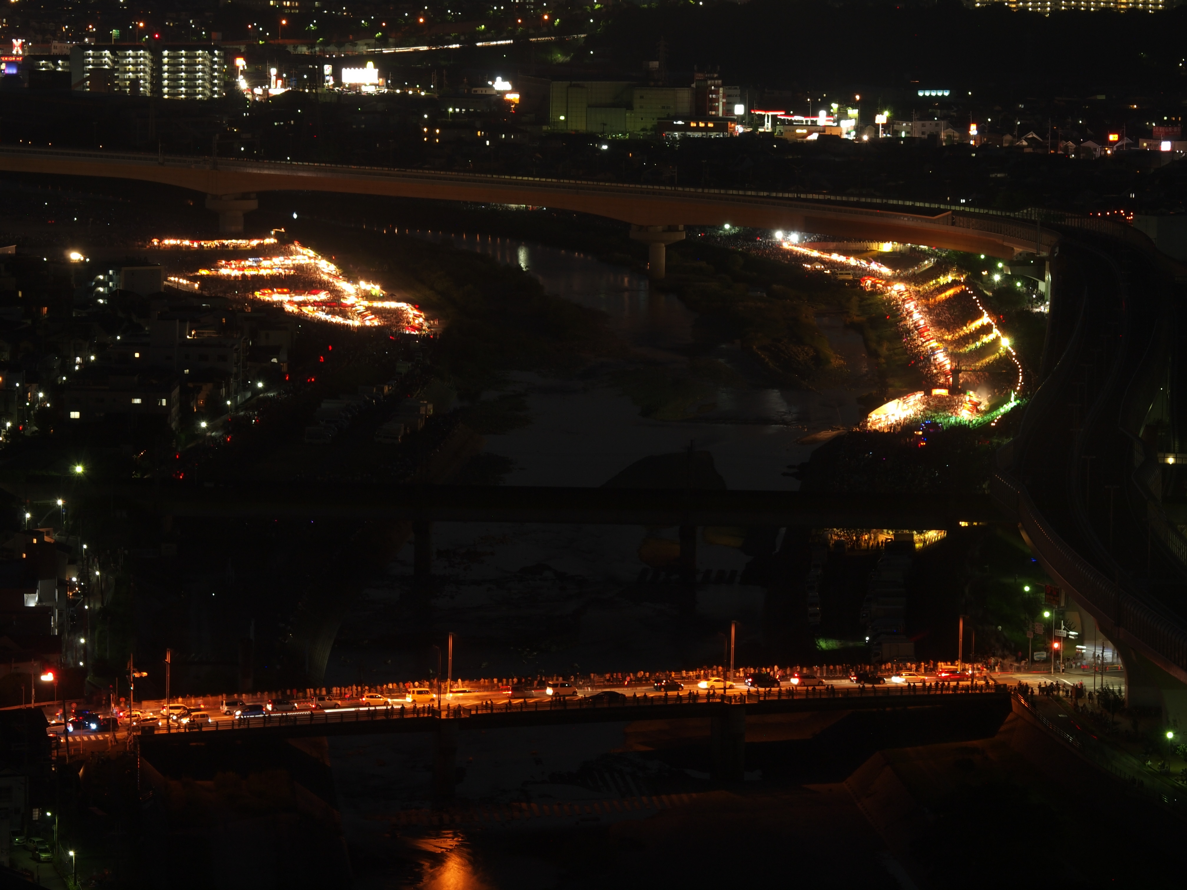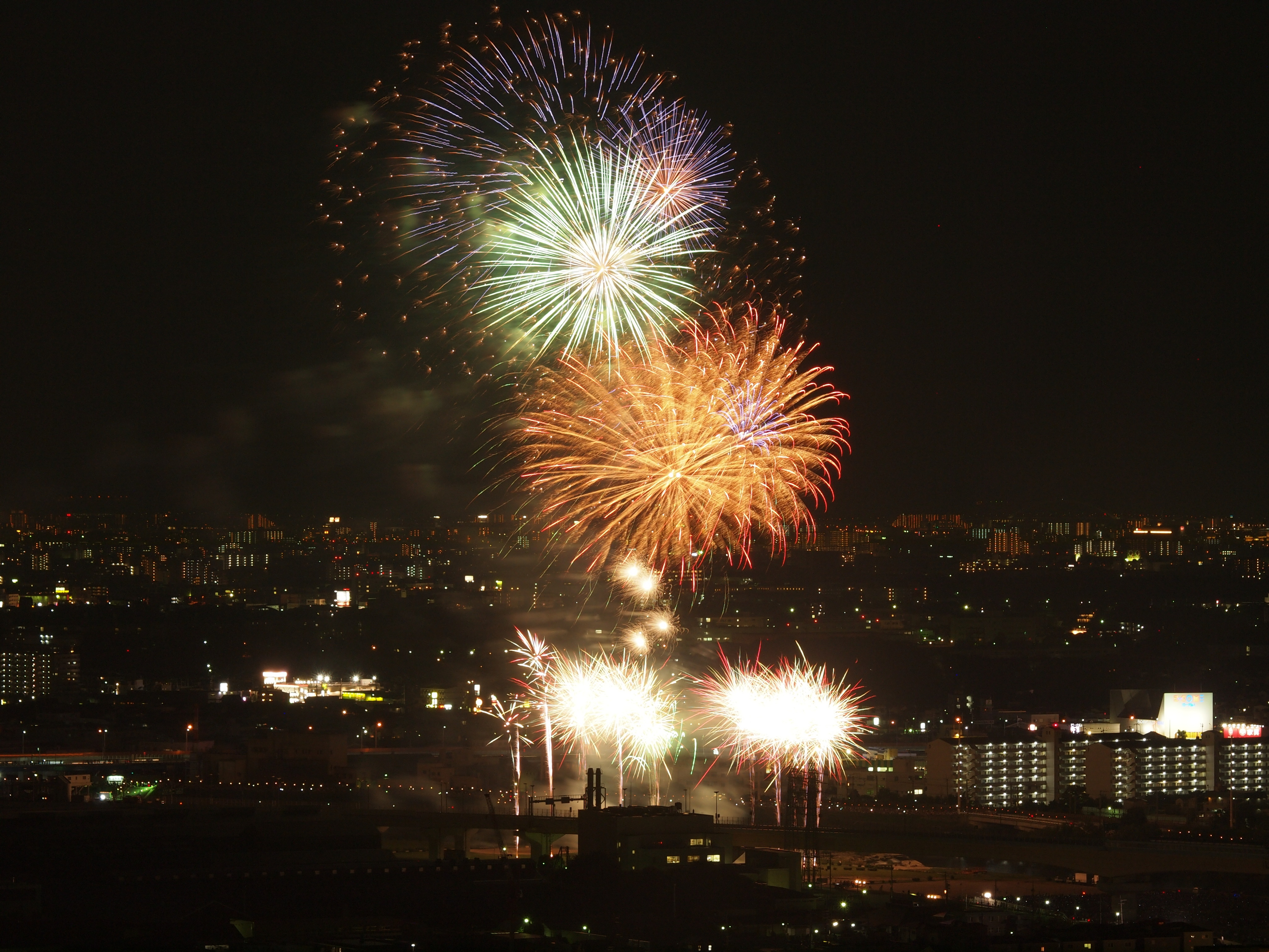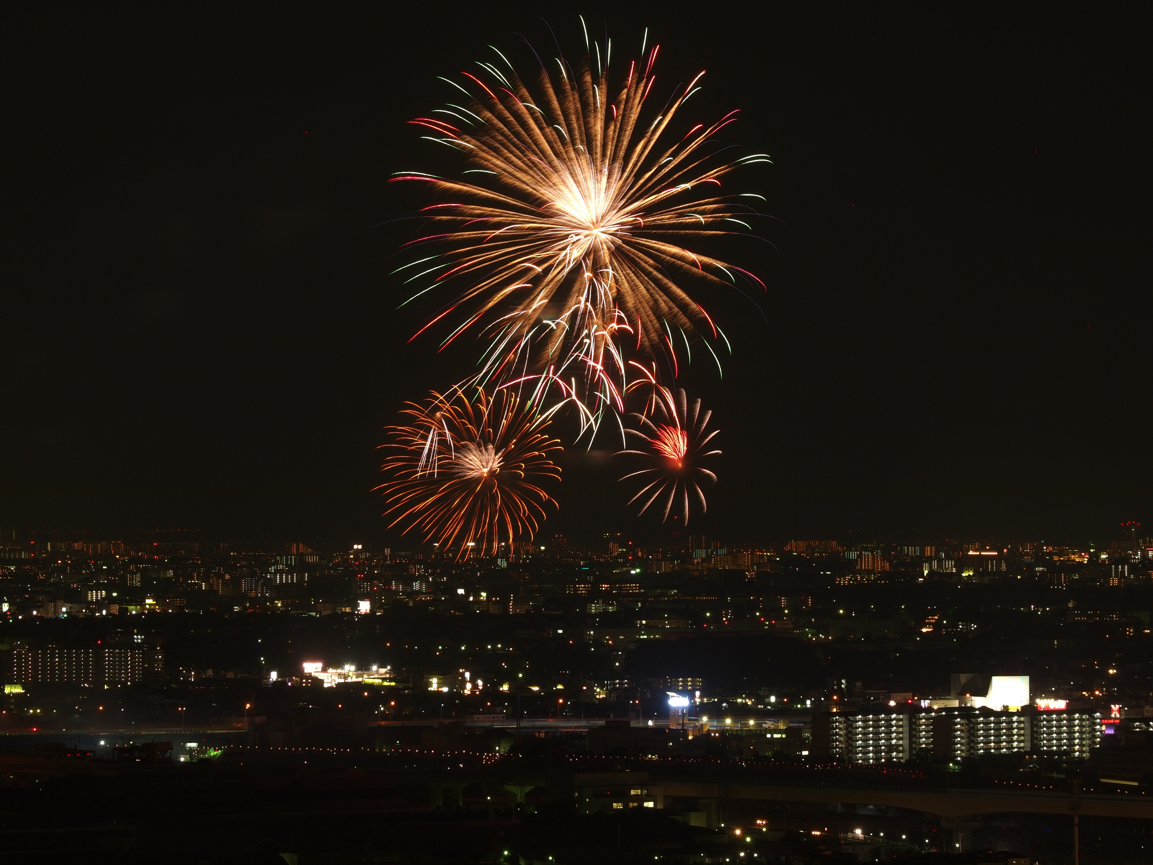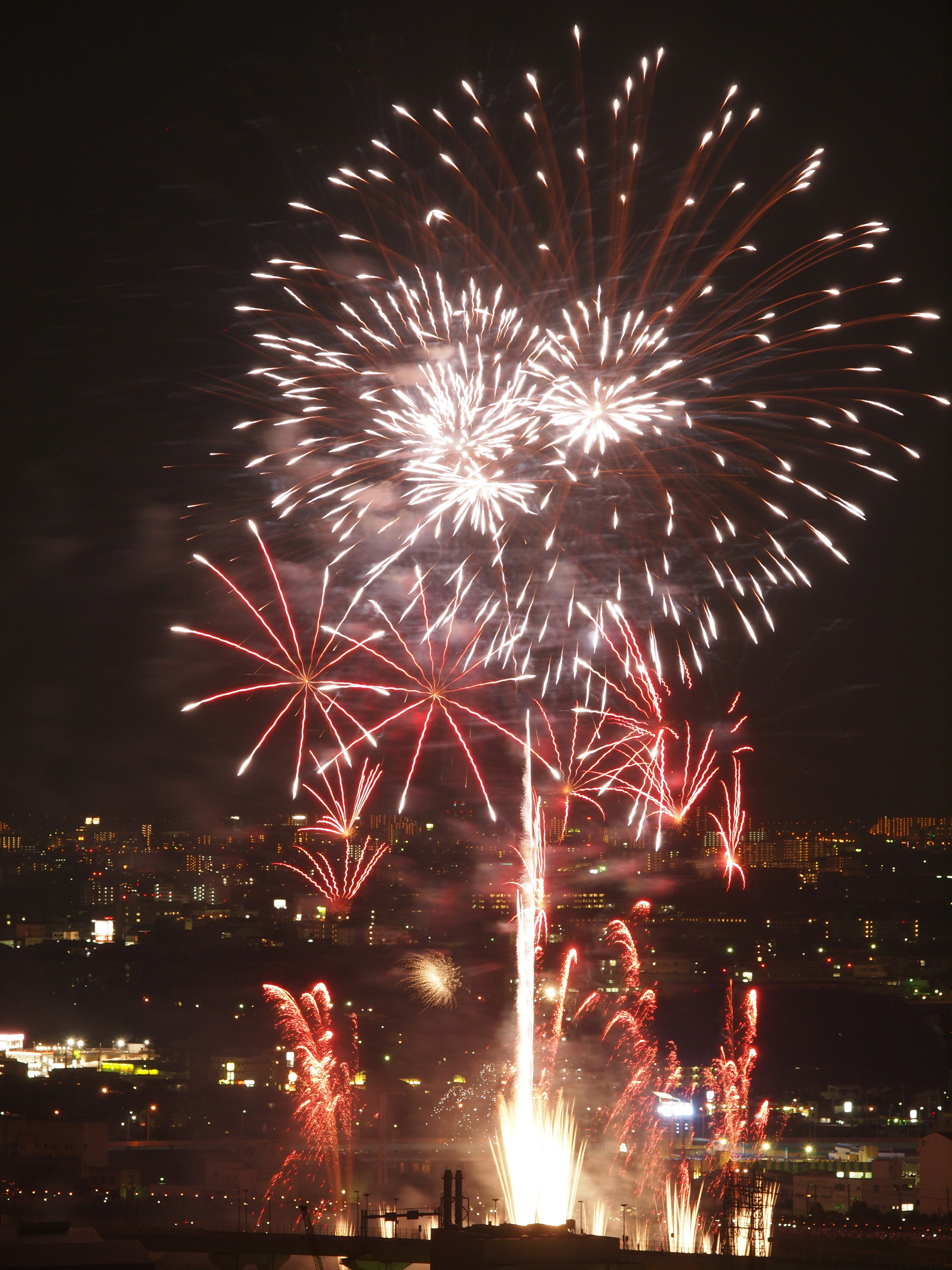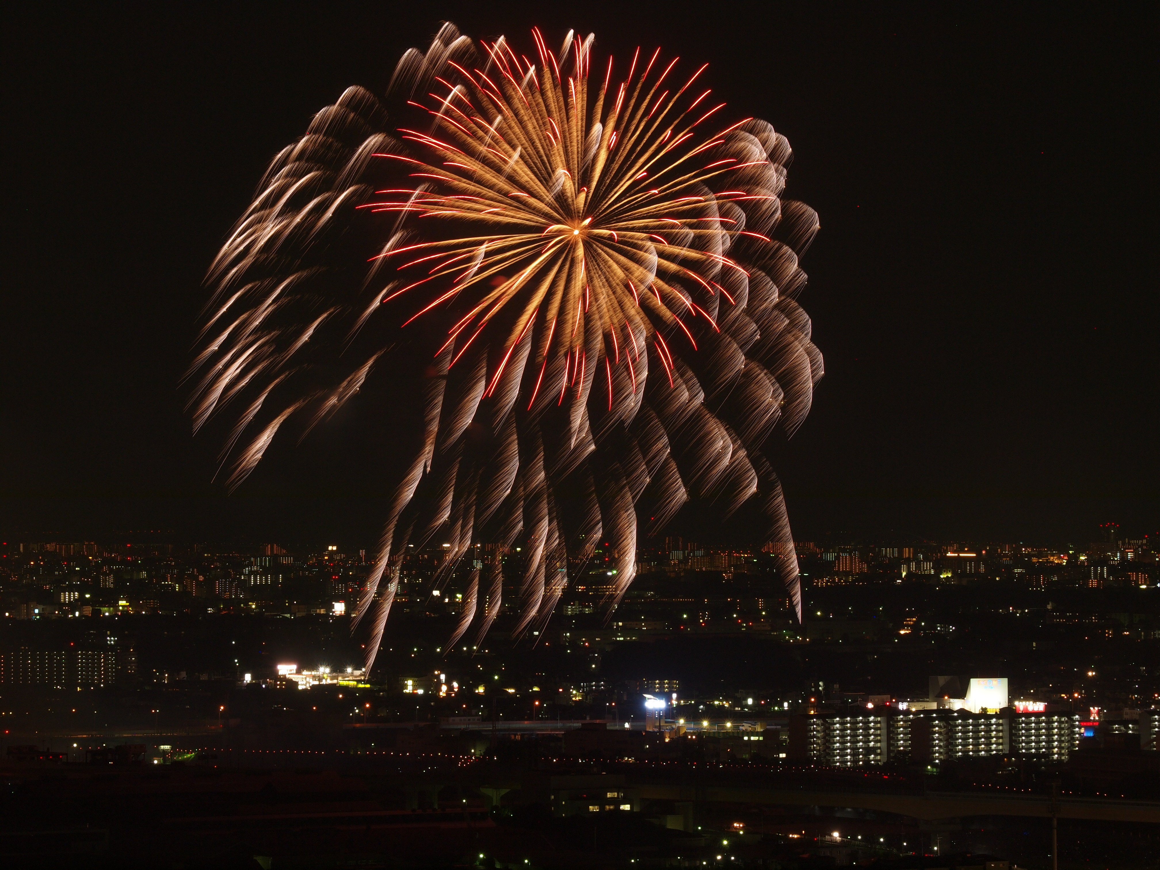 猪名川花火大会 from 五月山 2015/8/15(11年前) 猪名川花火大会に行ってきました.花火を撮影するのは9年ぶりです. 撮影場所は五月山の秀望台.会場から2kmほど離れた展望台です. 花火が行われる前の写真. 1時間以上前に着きましたが,人は結構いました. 上の写真はその頃のものです.会場に人が集まっています.手前の端(呉服橋)は車は渋滞気味ですが,人はまださほどいません. 下の写真は開始予定時間のものです.呉服橋にも人が集まっています. 予定よりも20分以上遅れましたが,始まりました. ポートレートに切り替えました. カメラを寝かせたため不安定になったのか,よくよく写真を見るとブレと思われるものが見られます.レリーズを使っていたのですが,望遠ということもあり,なかなかシビアです.