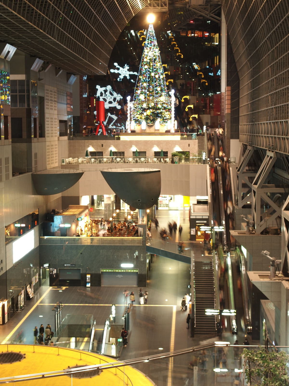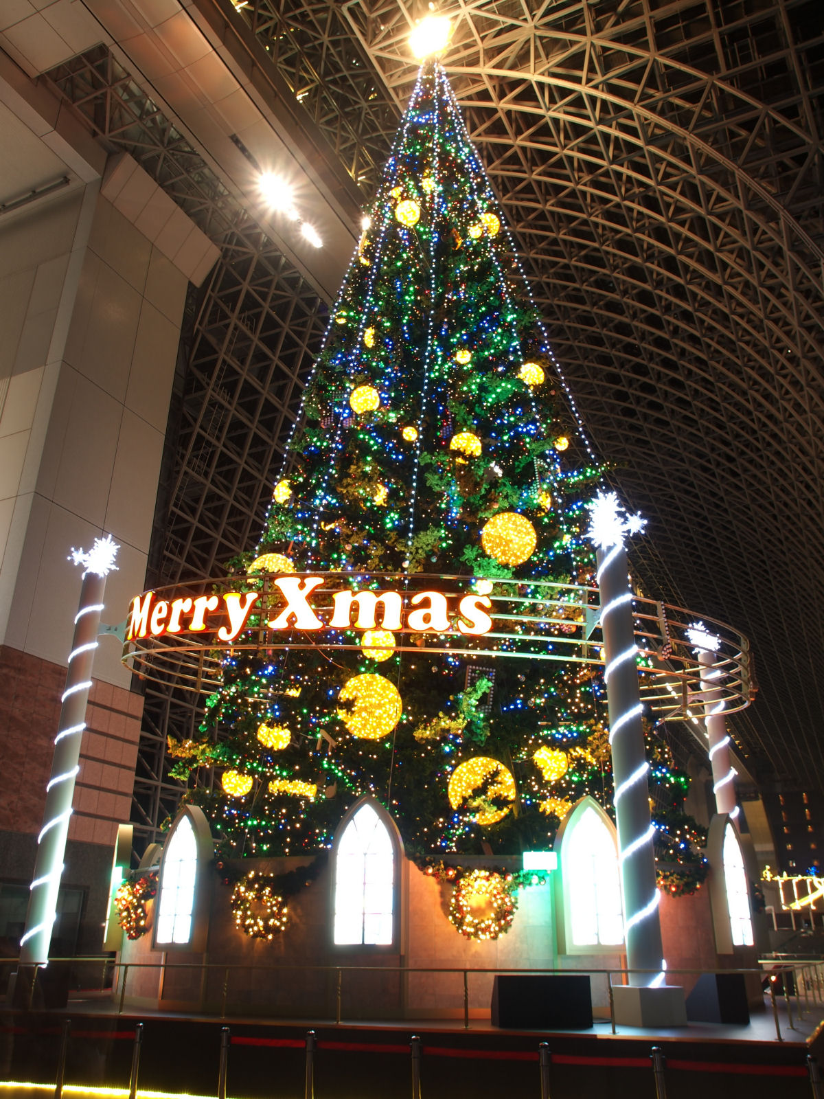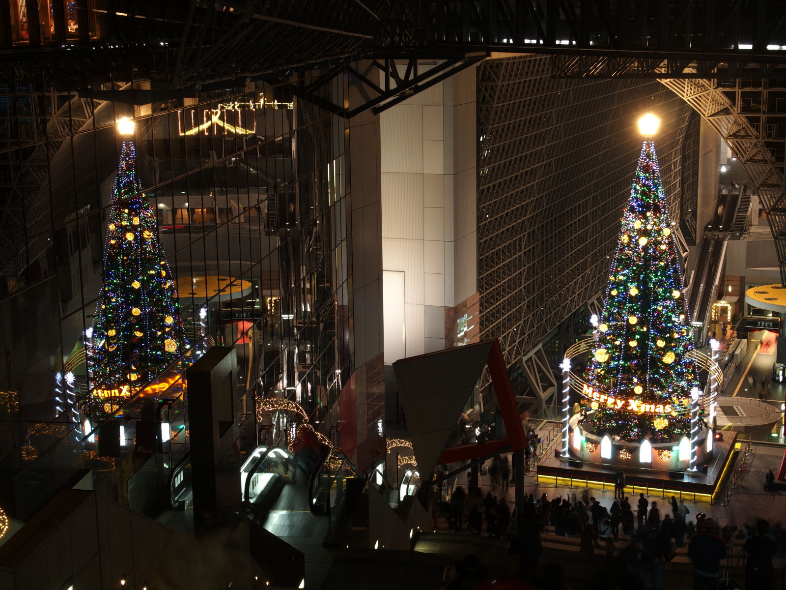 毎年京都駅ビルではクリスマスにイルミネーションが行われていて,過去にも何回か撮影に行っていますが,今年は京都駅ビル開業15周年を記念していつもよりすごいとのことなので,行ってみました. イルミネーションは22時までで,その1時間前の21時に到着しました. |
