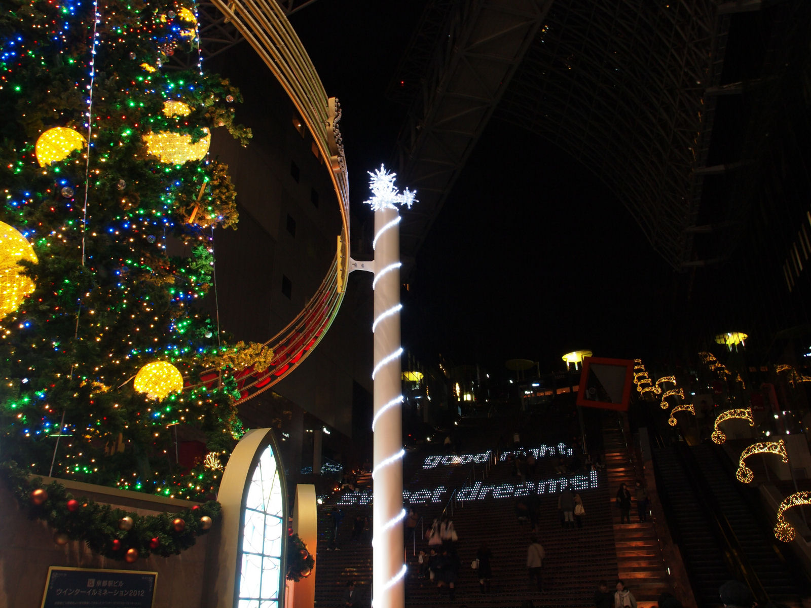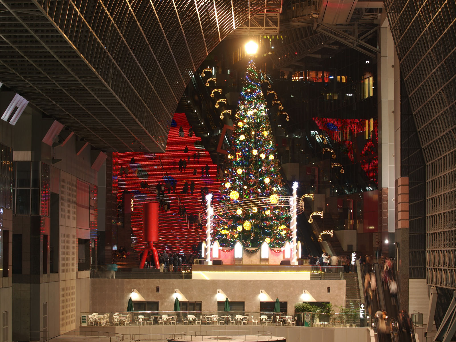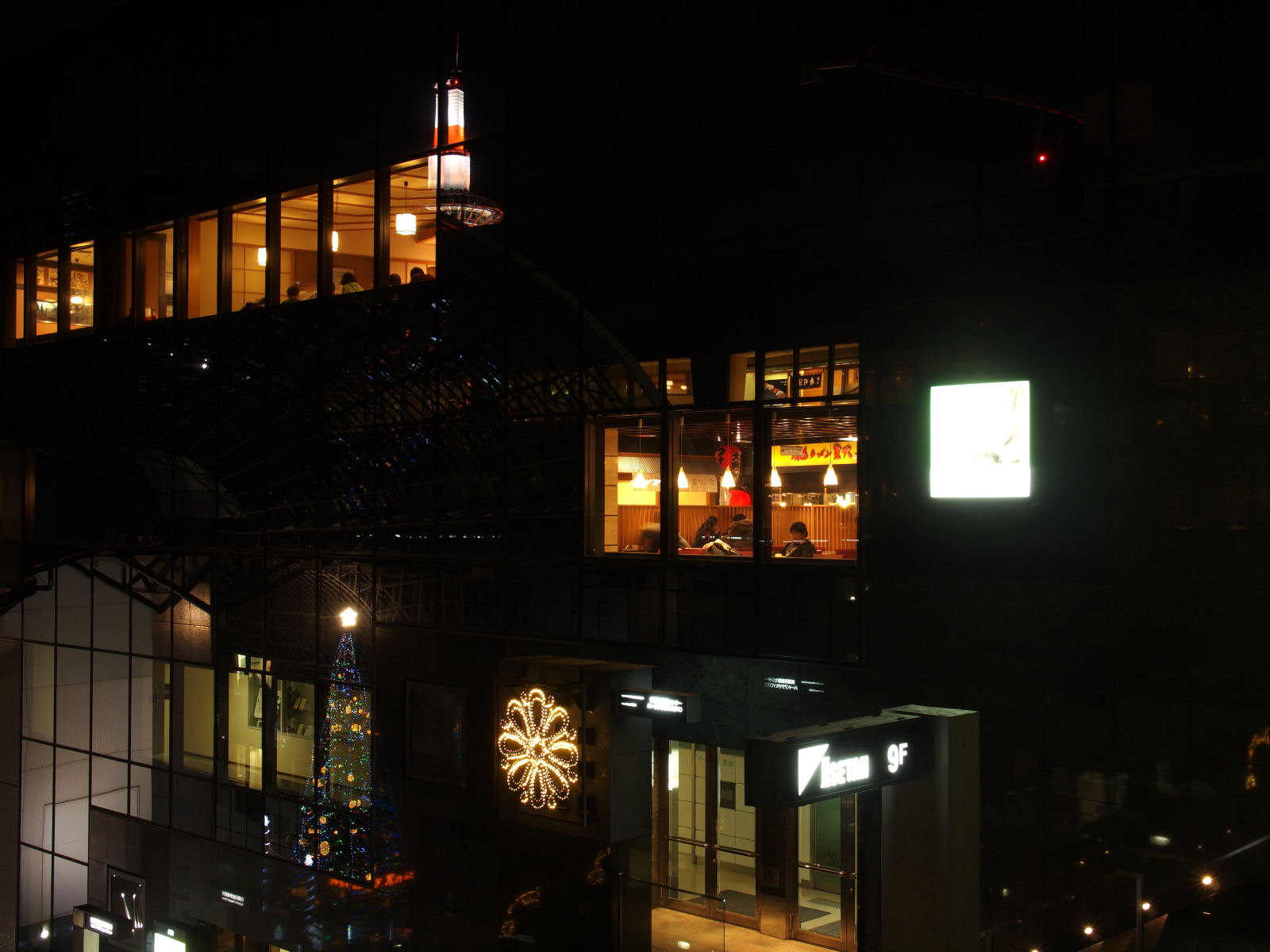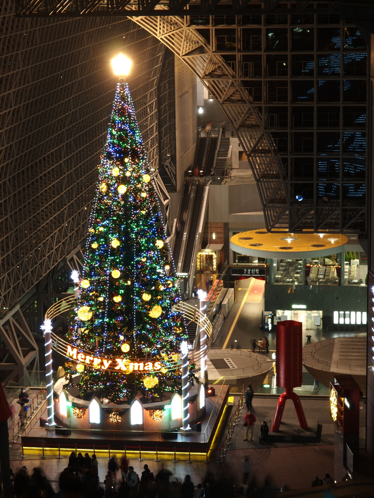 毎年京都駅ビルではクリスマスにイルミネーションが行われていて,過去にも何回か撮影に行っていますが,今年は京都駅ビル開業15周年を記念していつもよりすごいとのことなので,行ってみました. イルミネーションは22時までで,その1時間前の21時に到着しました. |