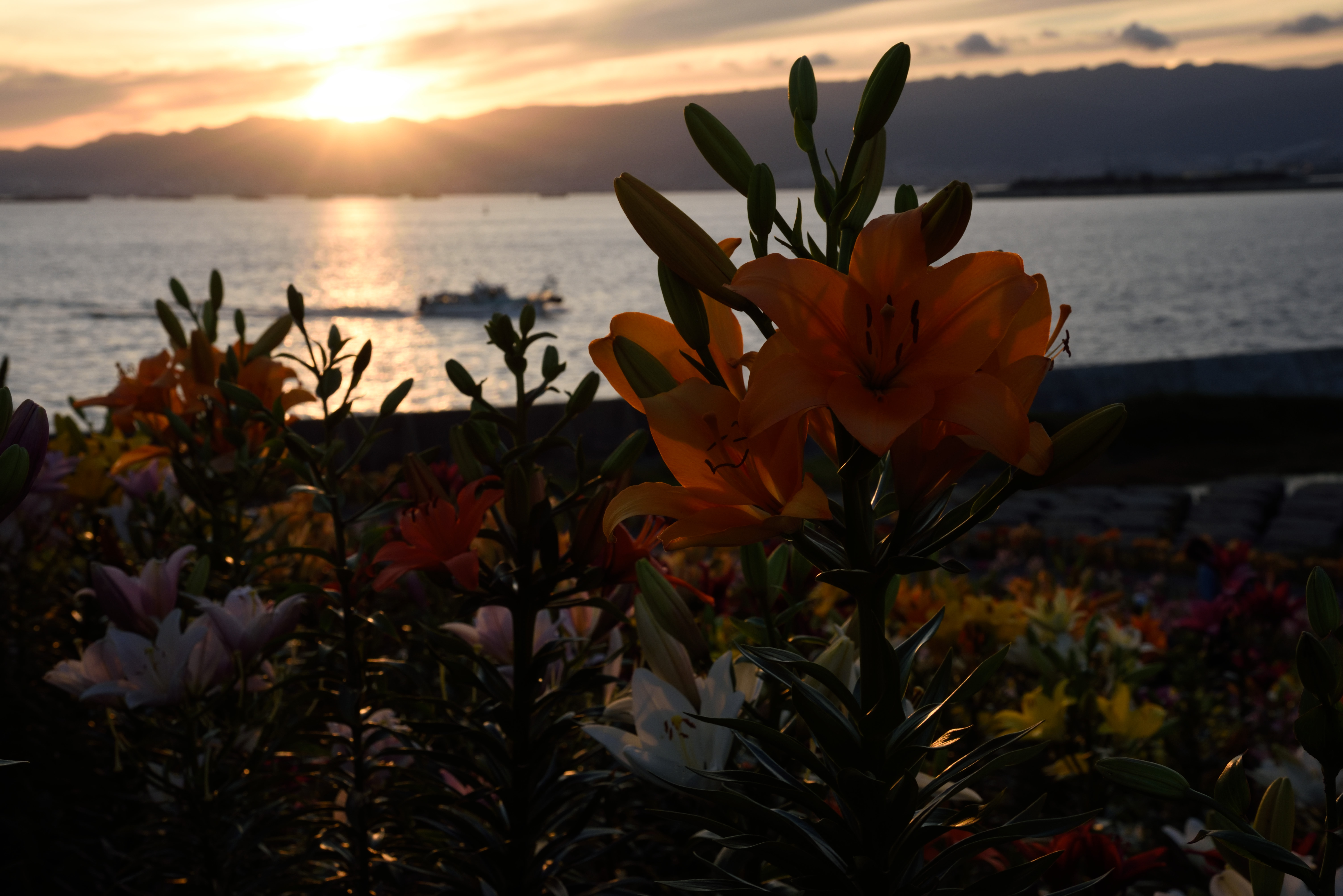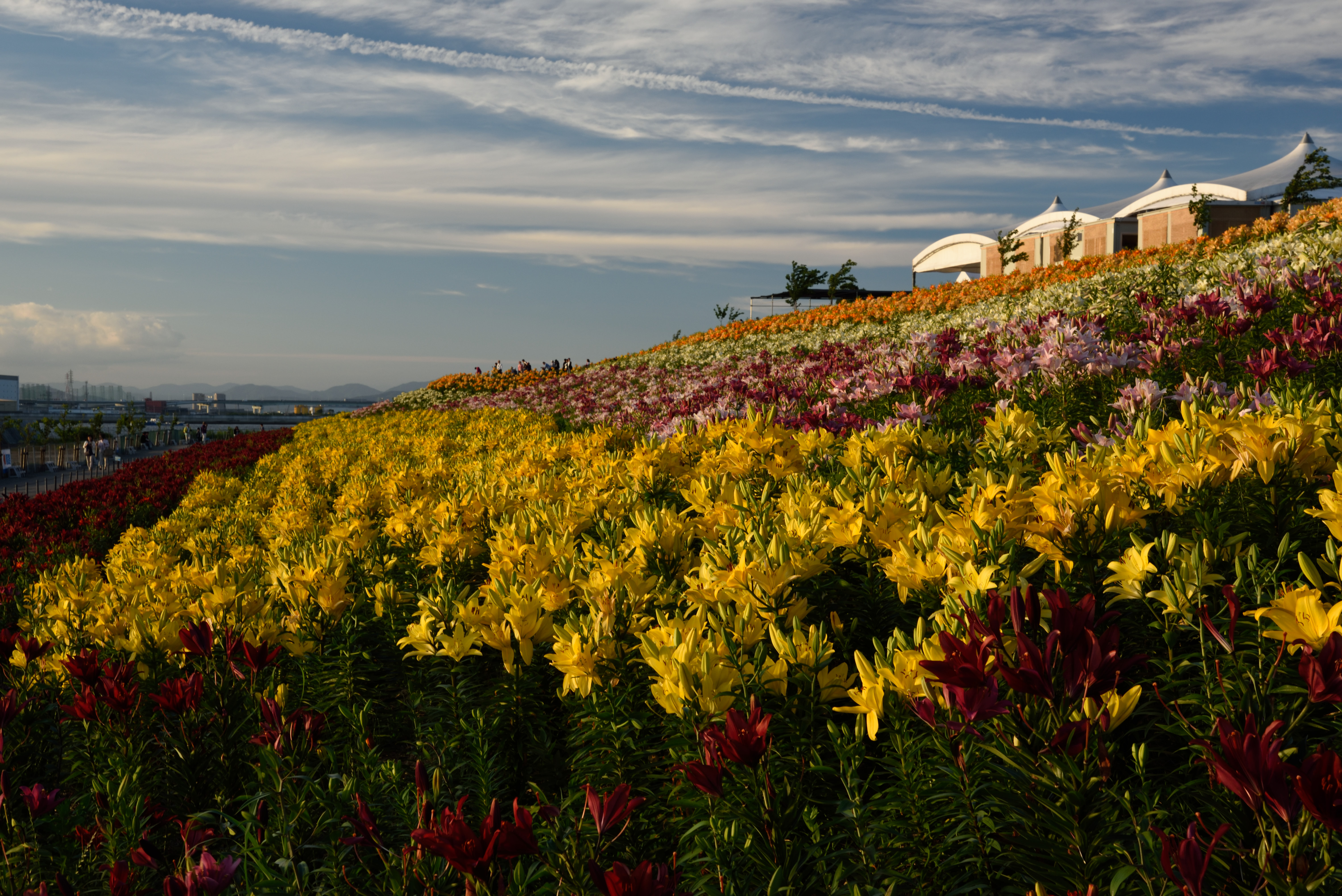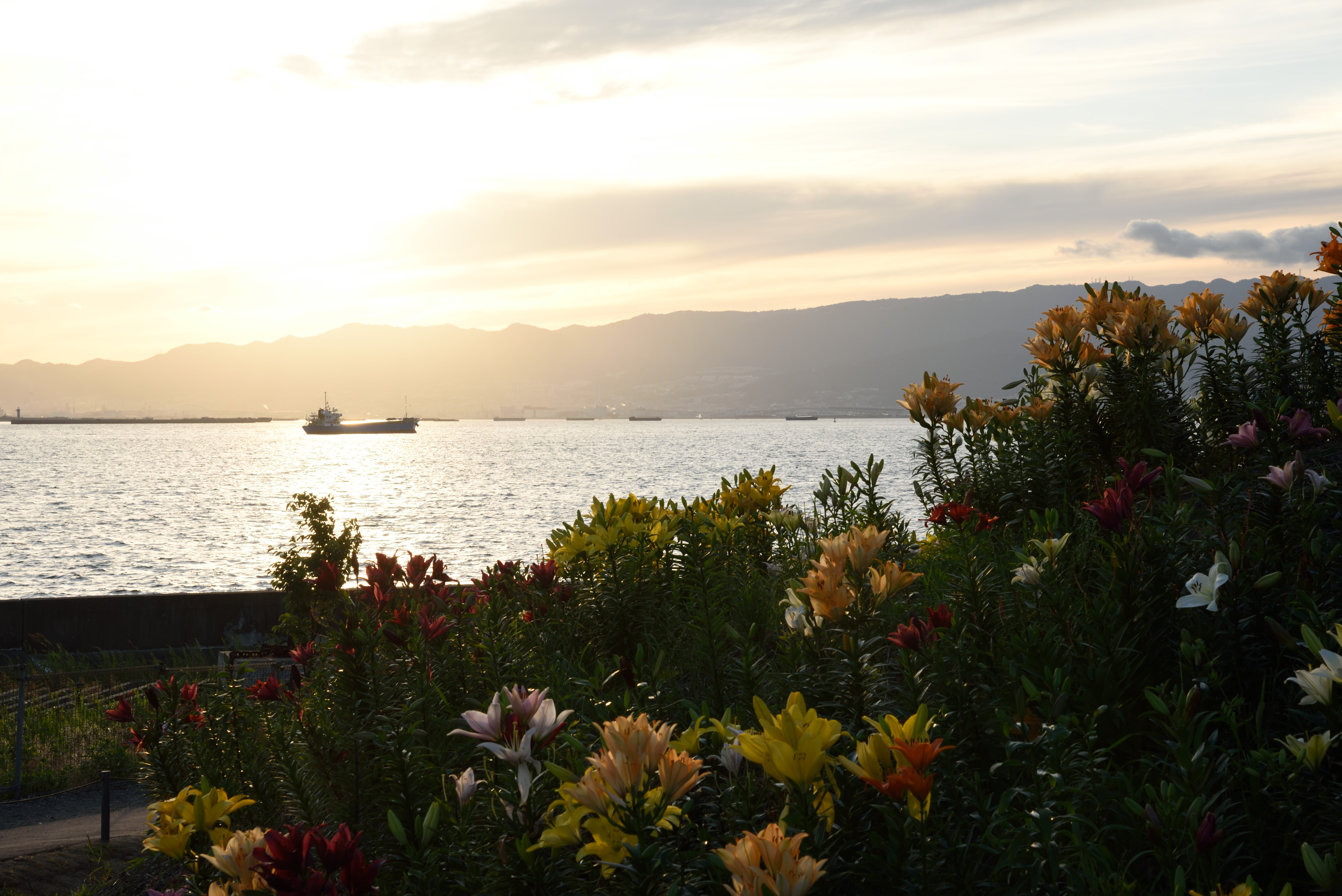 大阪舞洲ゆり園 2015/6/6(11年前) この日は貴重な梅雨晴れ間だったので,大阪舞洲ゆり園に行ってきました. 開花状況は早咲きと普通咲きが見頃で,例年より開花が早いそうです. 入園してすぐ,順路に沿って右の方に向かったときの写真. 海をバックに咲くゆりがいい感じです. 海側から先ほどと反対方向に歩いた時の写真です. ゆりが延々と咲いています. 逆光の写真. 夕日とゆりを撮ろうとしました写真です. 明るさが合っていませんね.夕日が雲に隠れたらちょうどいいのかもしれません. 下の写真はフラッシュを焚いていますが,これはこれでわざとらしいです.