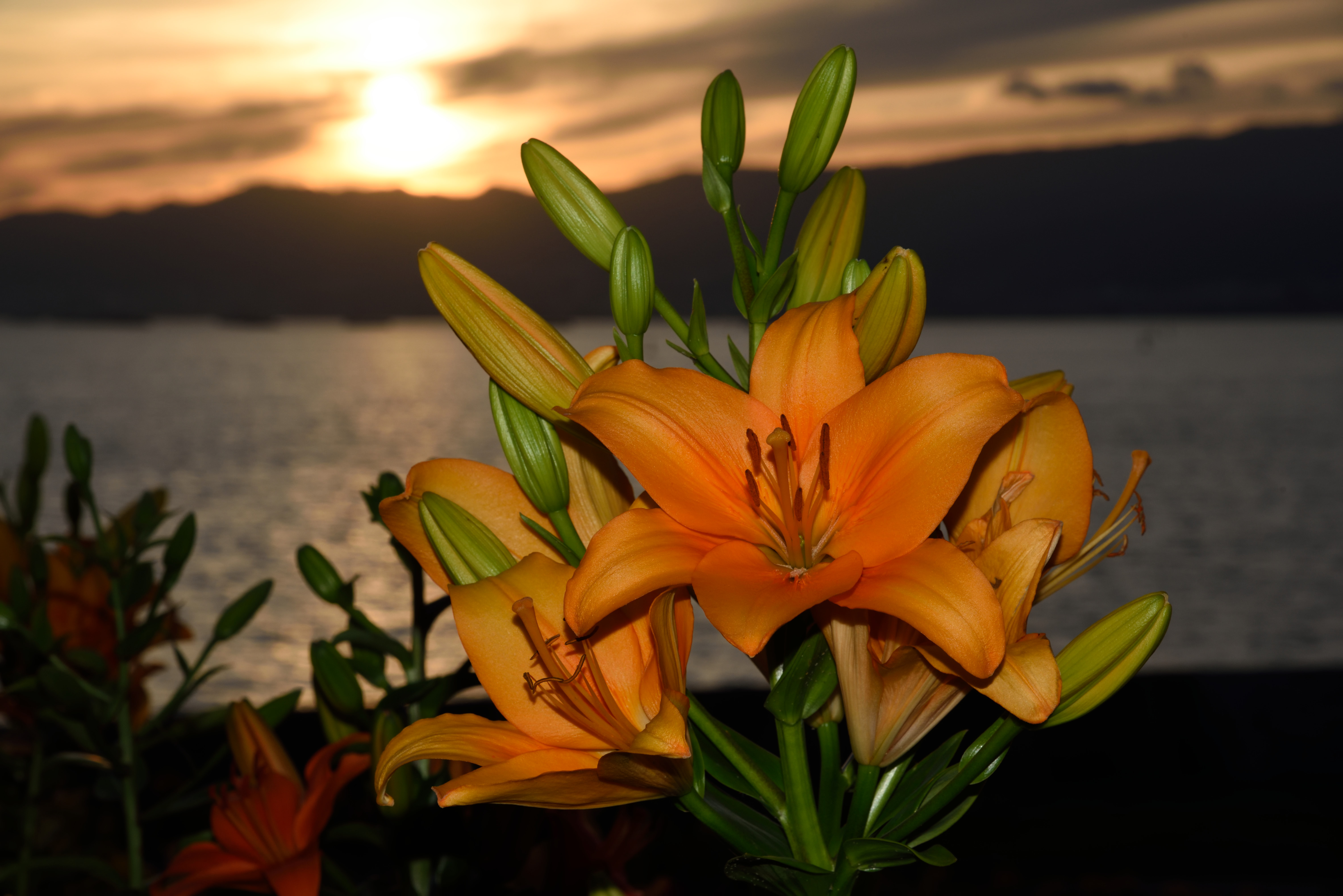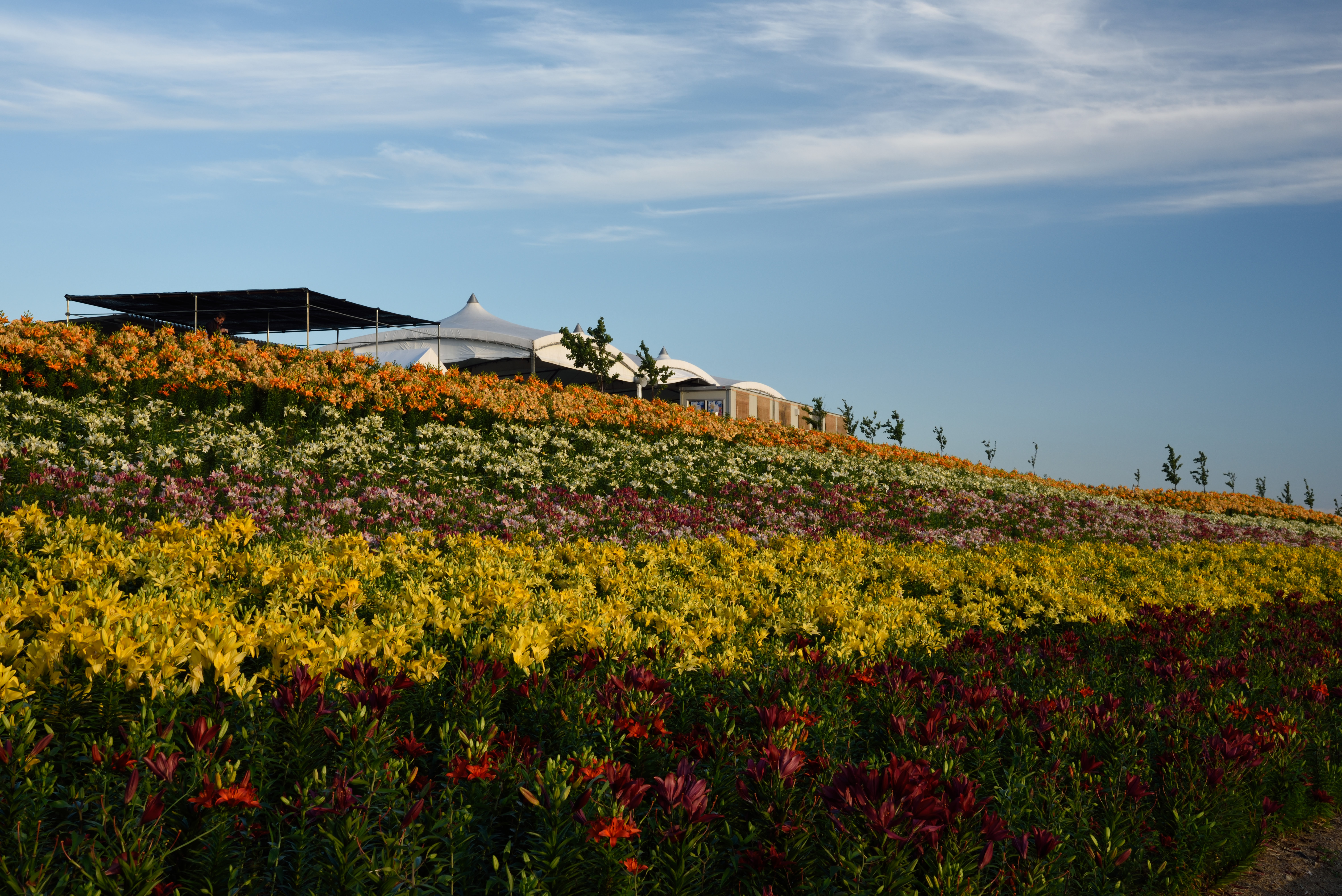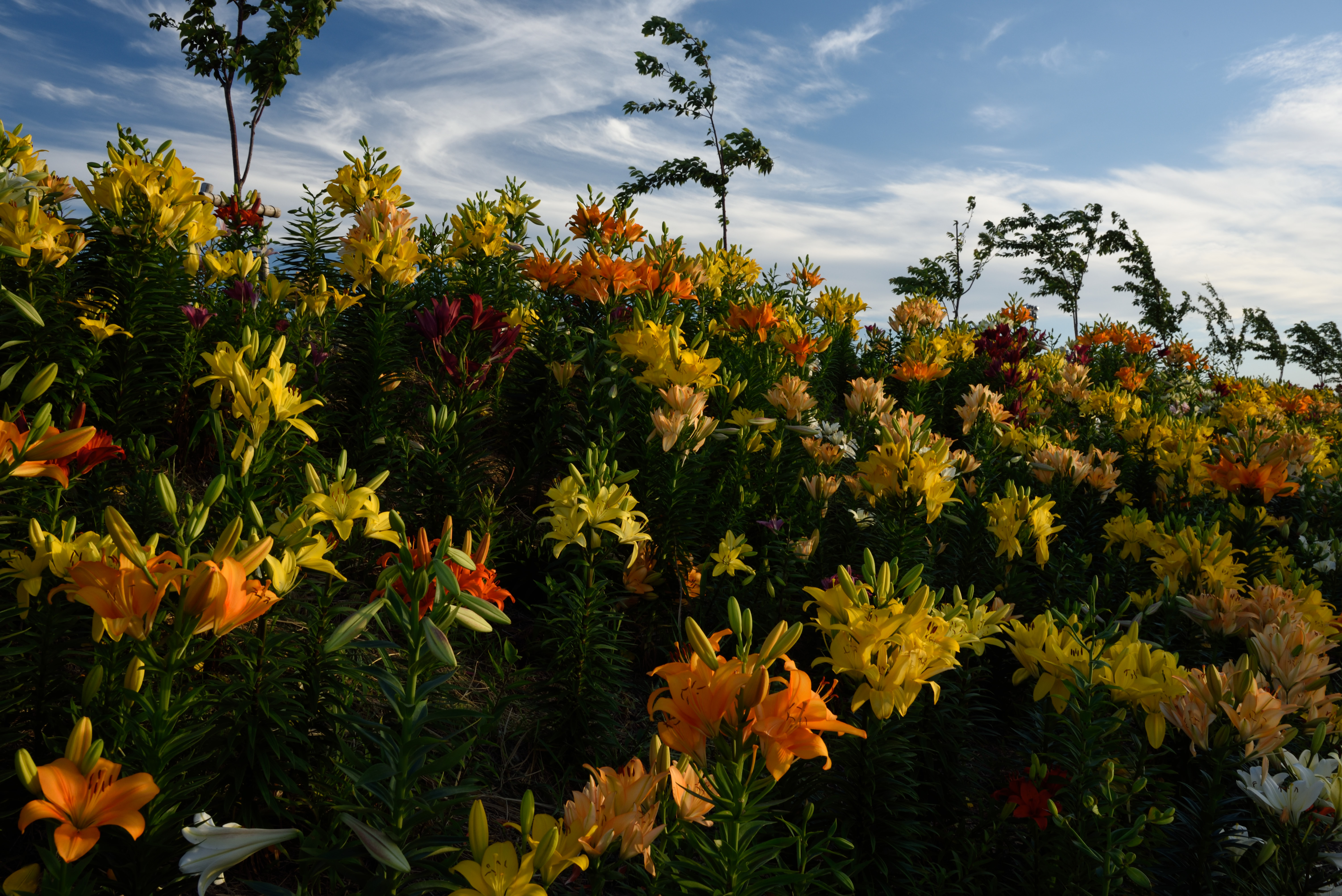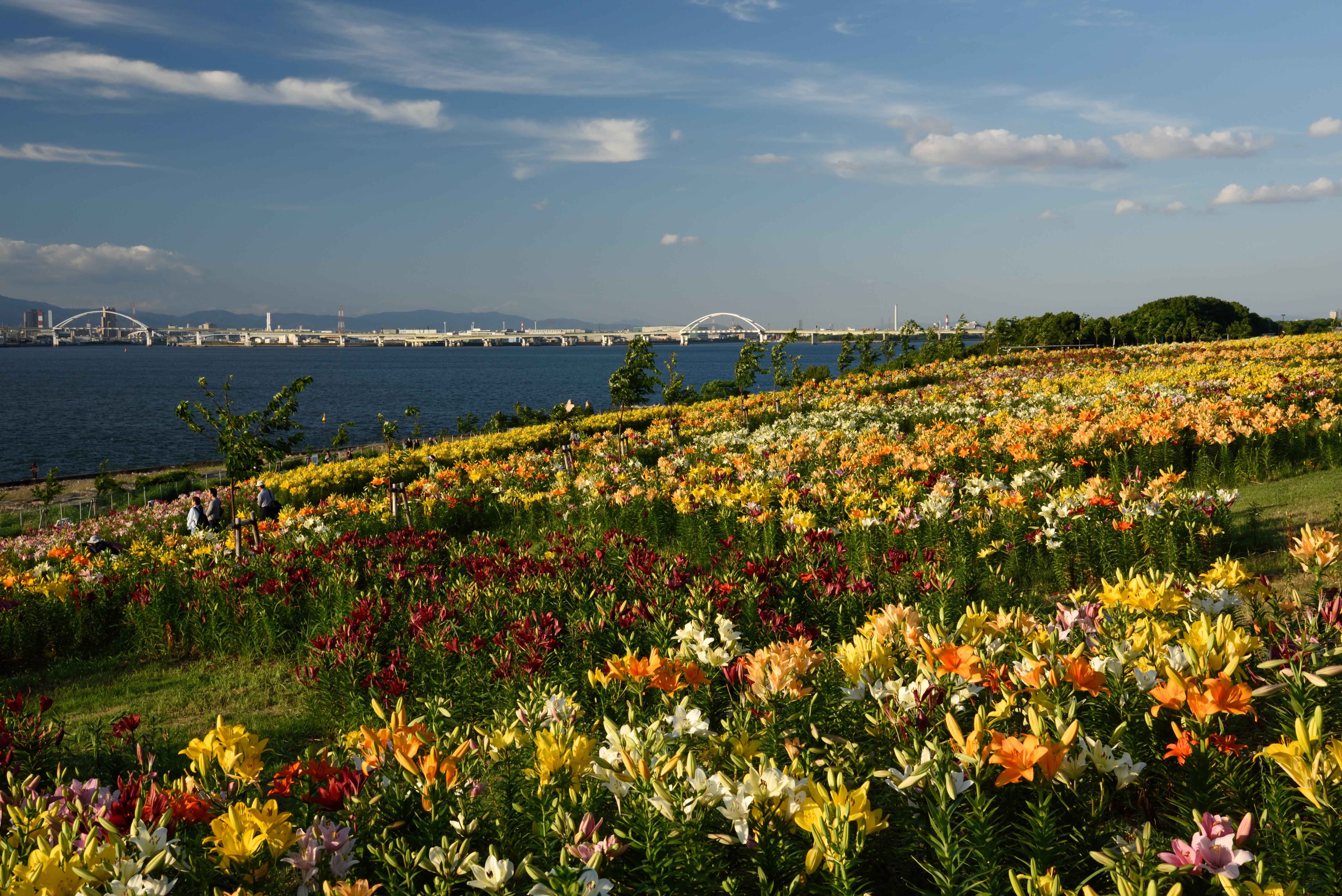 大阪舞洲ゆり園 2015/6/6(11年前) この日は貴重な梅雨晴れ間だったので,大阪舞洲ゆり園に行ってきました. 開花状況は早咲きと普通咲きが見頃で,例年より開花が早いそうです. 入園してすぐ,順路に沿って右の方に向かったときの写真. 海をバックに咲くゆりがいい感じです. 海側から先ほどと反対方向に歩いた時の写真です. ゆりが延々と咲いています. 逆光の写真. 夕日とゆりを撮ろうとしました写真です. 明るさが合っていませんね.夕日が雲に隠れたらちょうどいいのかもしれません. 下の写真はフラッシュを焚いていますが,これはこれでわざとらしいです.
