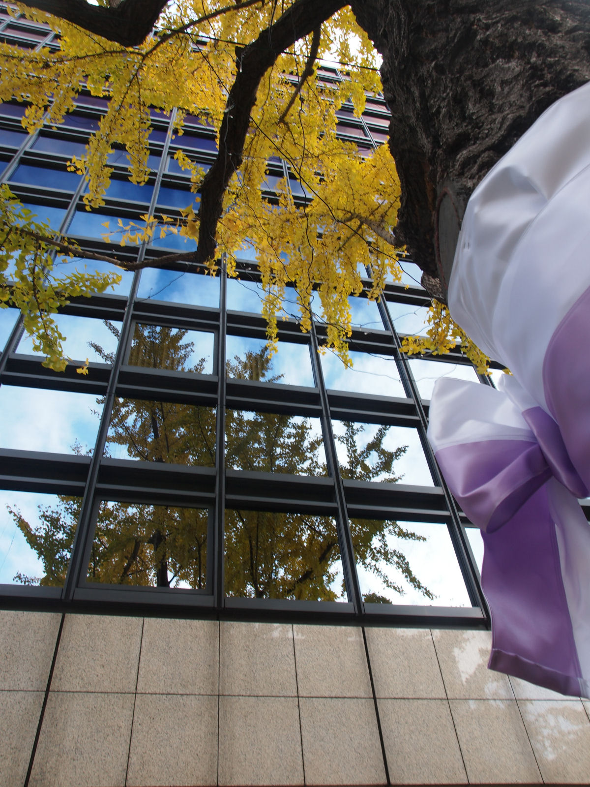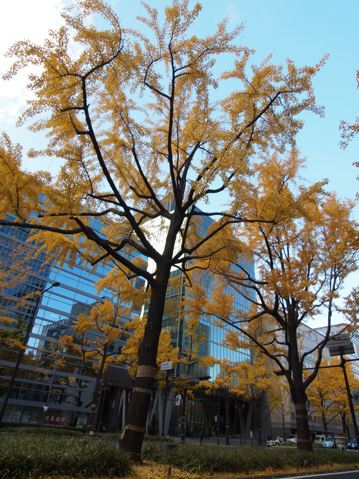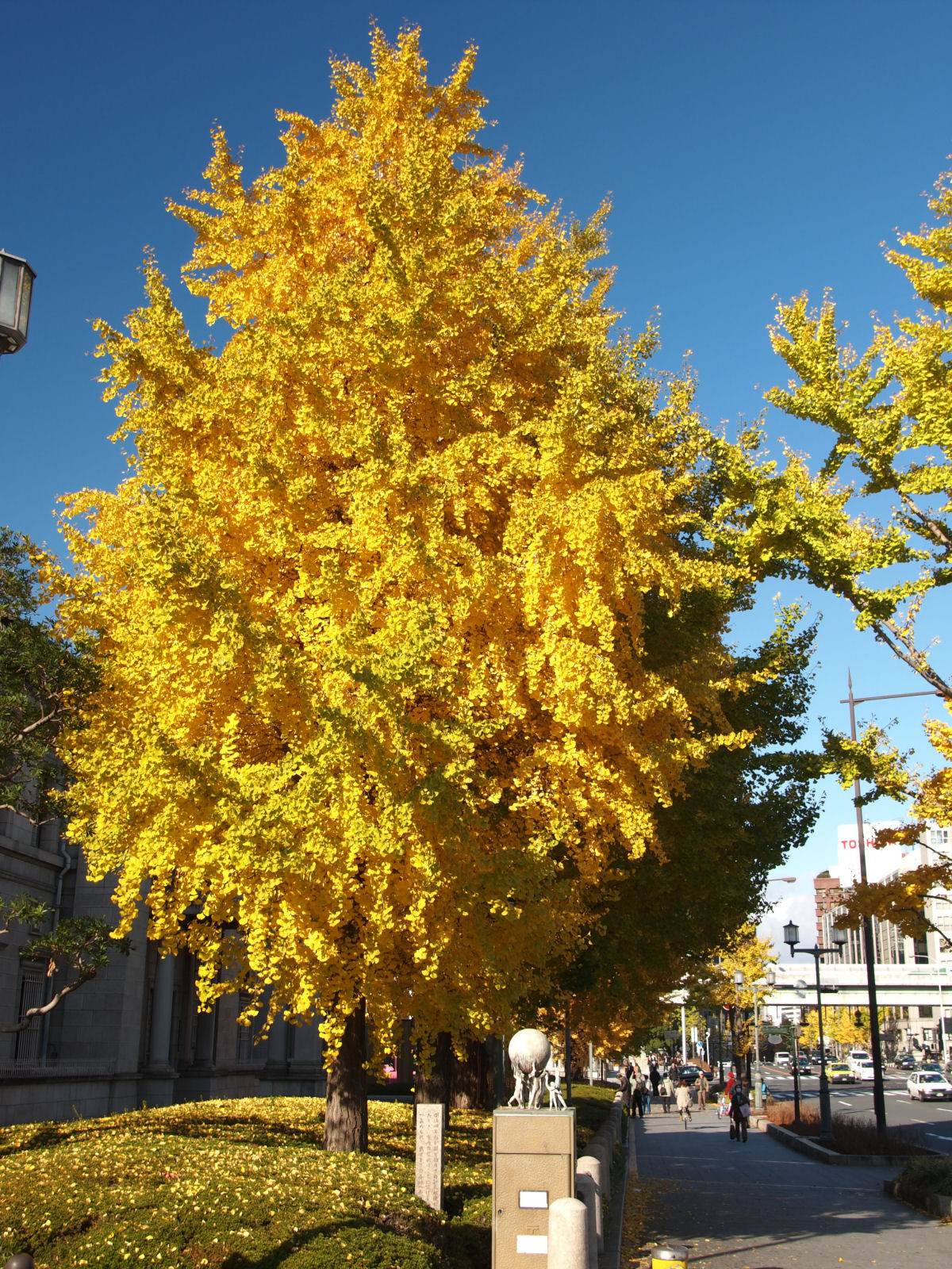 淀屋橋を渡った先にある中之島には大阪市役所がありますが,その道路を挟んだ向かいの日本銀行大阪支店前に大きなイチョウがありました.
