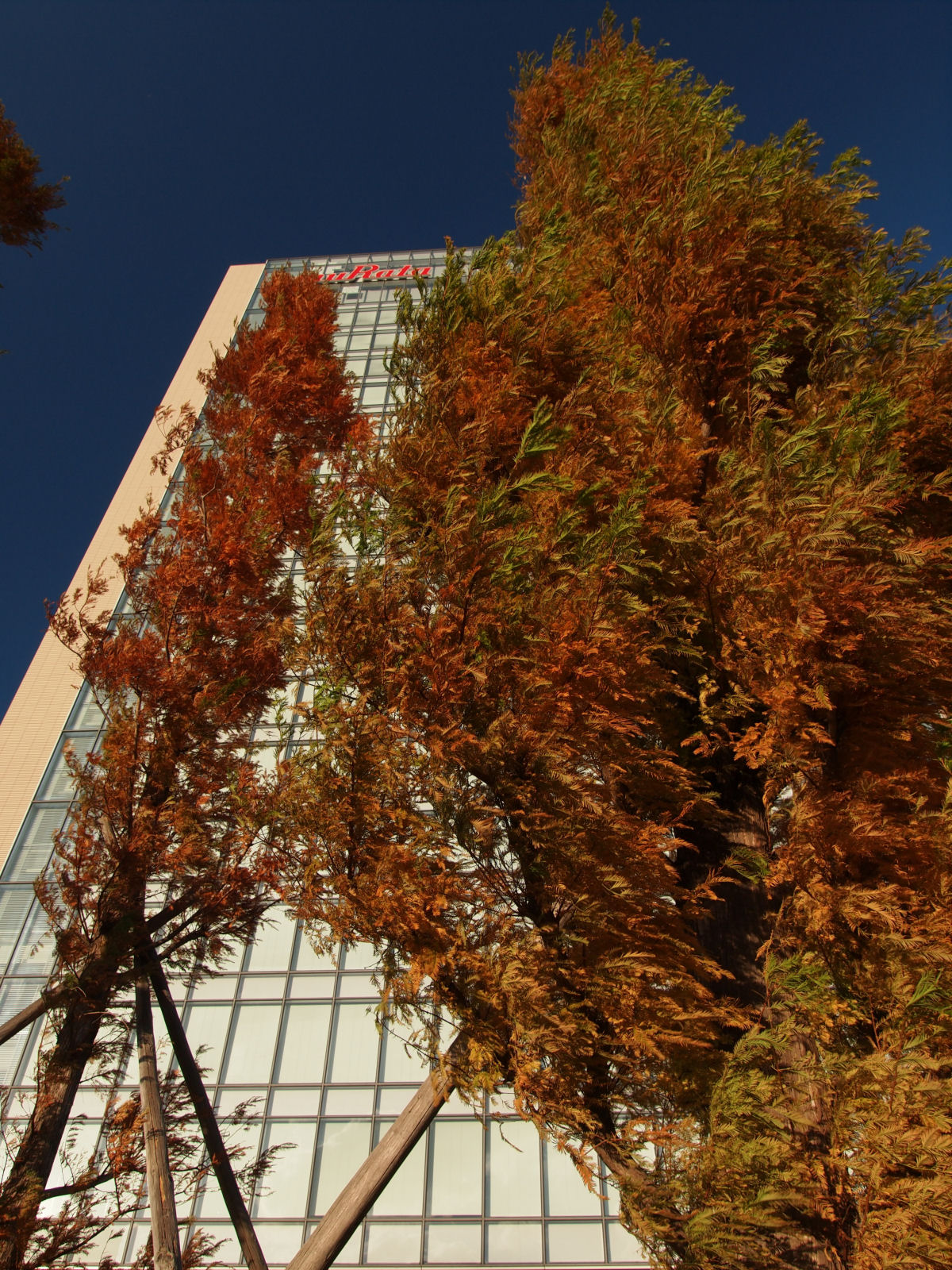 長岡京駅前の杉が紅葉しているのが見えたので,撮影を試みました.