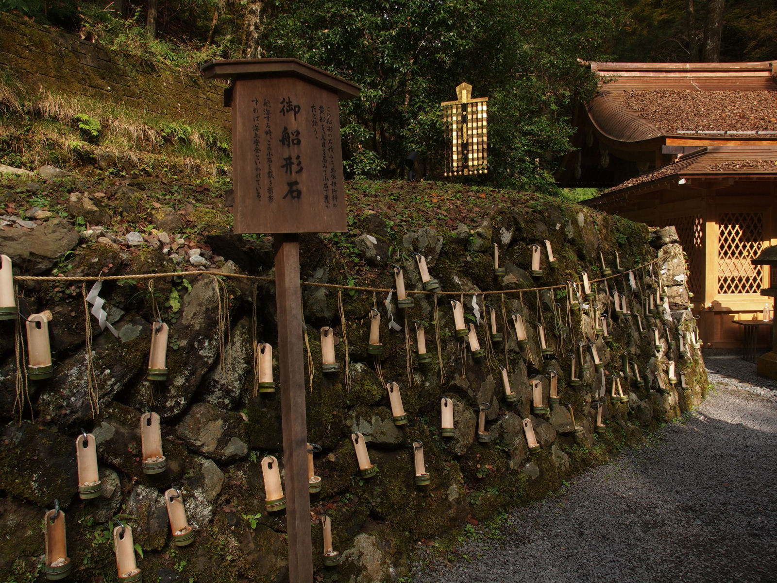 奥宮まで訪れました. 奥宮は去年末に改修しましたが,それからはじめてきました. 隣の船形石には,竹の行燈が下がっていました. |