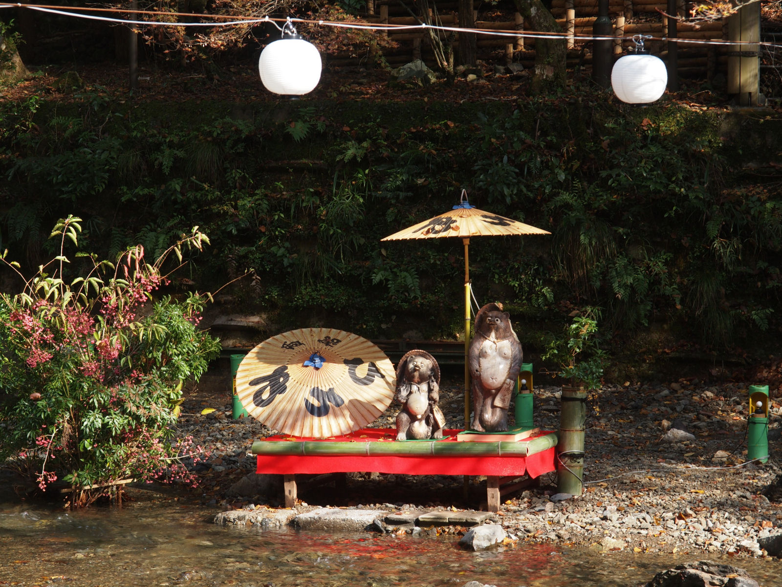 「ひろや」と書かれた番傘と狸の置物.