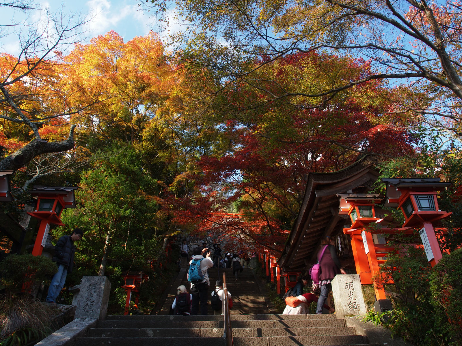 東福寺から京阪に乗って出町柳へ行き,そこから叡山電鉄に乗って貴船に来ました. 叡山電鉄では二ノ瀬の手前辺りにもみじのトンネルという部分があり電車もスピードを落としますが,電車は満員で立って乗車していたため,その辺の写真はないです. こちらは本宮前. |