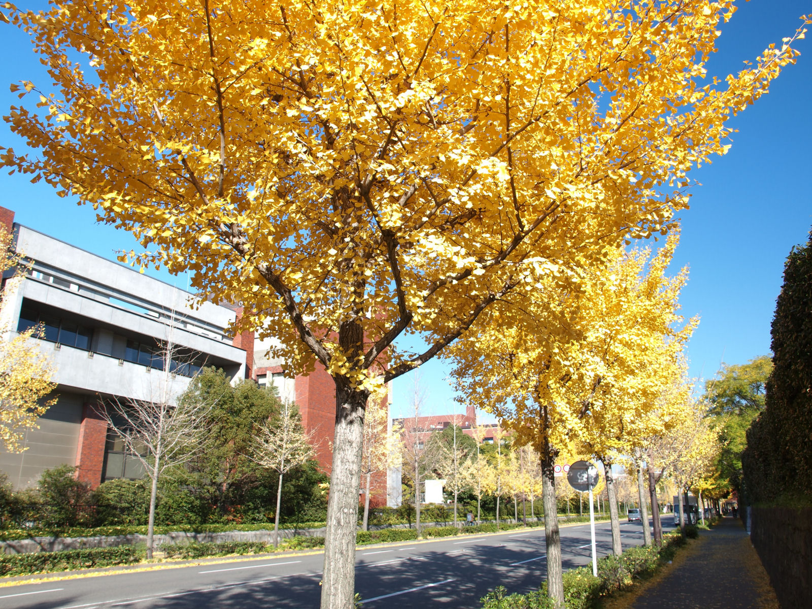 続いて吉田山の方に来ました. あまり有名な寺社はありませんが,ふもとに京大があります. こちらは京大前の道路. 本来の目的は昨年に引き続き吉田寮の見事ないちょう並木だったのですが,今回は工事中で入口が閉鎖されていました(別途入口はあるようです). |