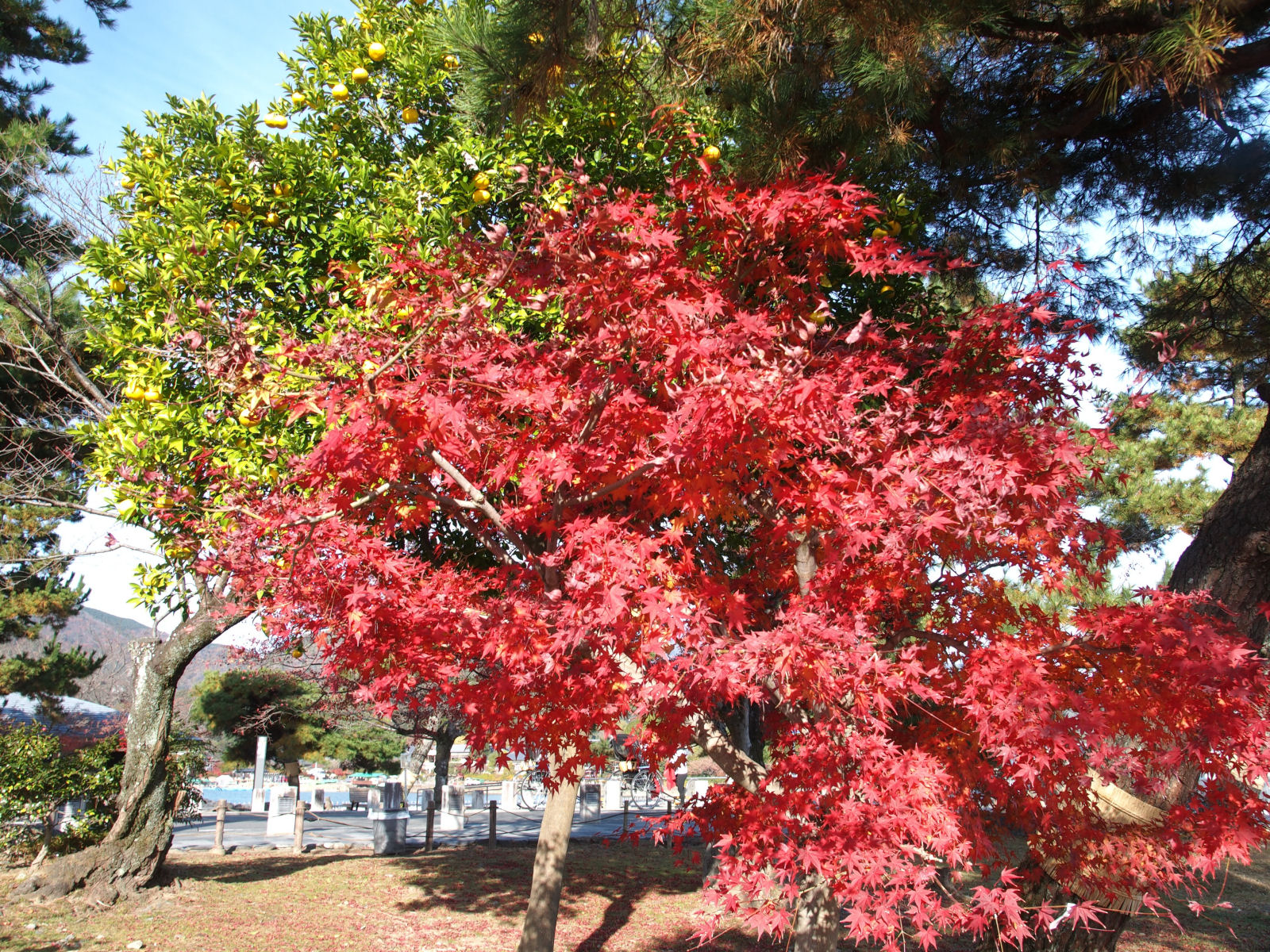 ほとんどのもみじは色あせているか落葉していましたが,渡月橋の近くにひとつだけ鮮やかな紅葉がありました. 隣には何かの柑橘類の実がたくさんなっていました. |