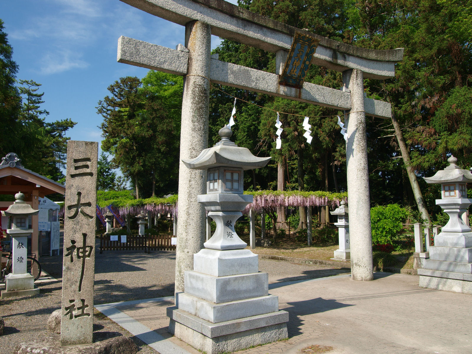 滋賀は草津の三大神社. 樹齢400年になるという藤があるとのことで,やってきました. こちらは鳥居.さっそく藤が見えています. |