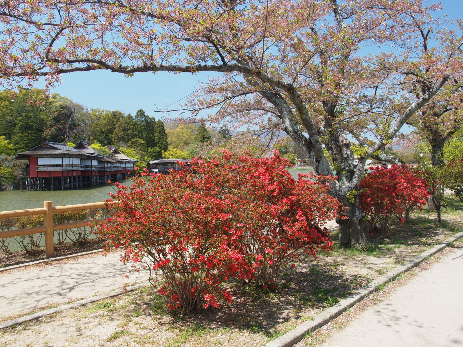 先週の嵐により桜のシーズンがすっかり終わり,長岡京で有名なキリシマツツジ@長岡天満宮)や牡丹@乙訓寺はGW頃なのでそれまで一休みといった感がありますが,まだ咲いている枝垂れ桜があったりサトザクラが咲き始めたり,また高気圧が張り出して天気がとてもよいとのことだったので,近所を回ってみました. 今回行ったのは長岡天満宮,乙訓寺,光明寺へ行きました. 葉も見えたけどまだきれいな枝垂れ桜,咲き始めたサトザクラ,つぼみを付けたキリシマツツジや牡丹,新緑のもみじが見られました. |