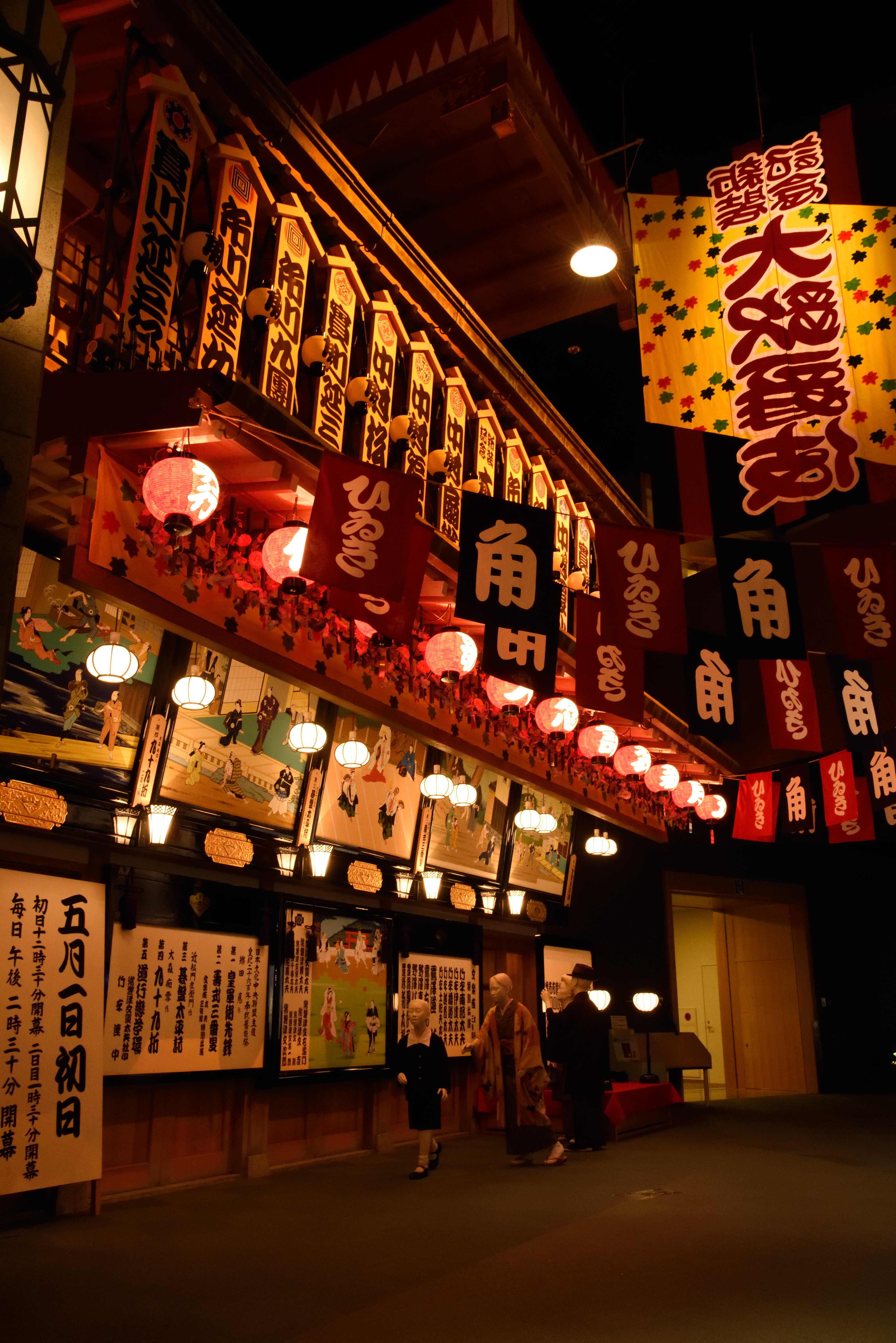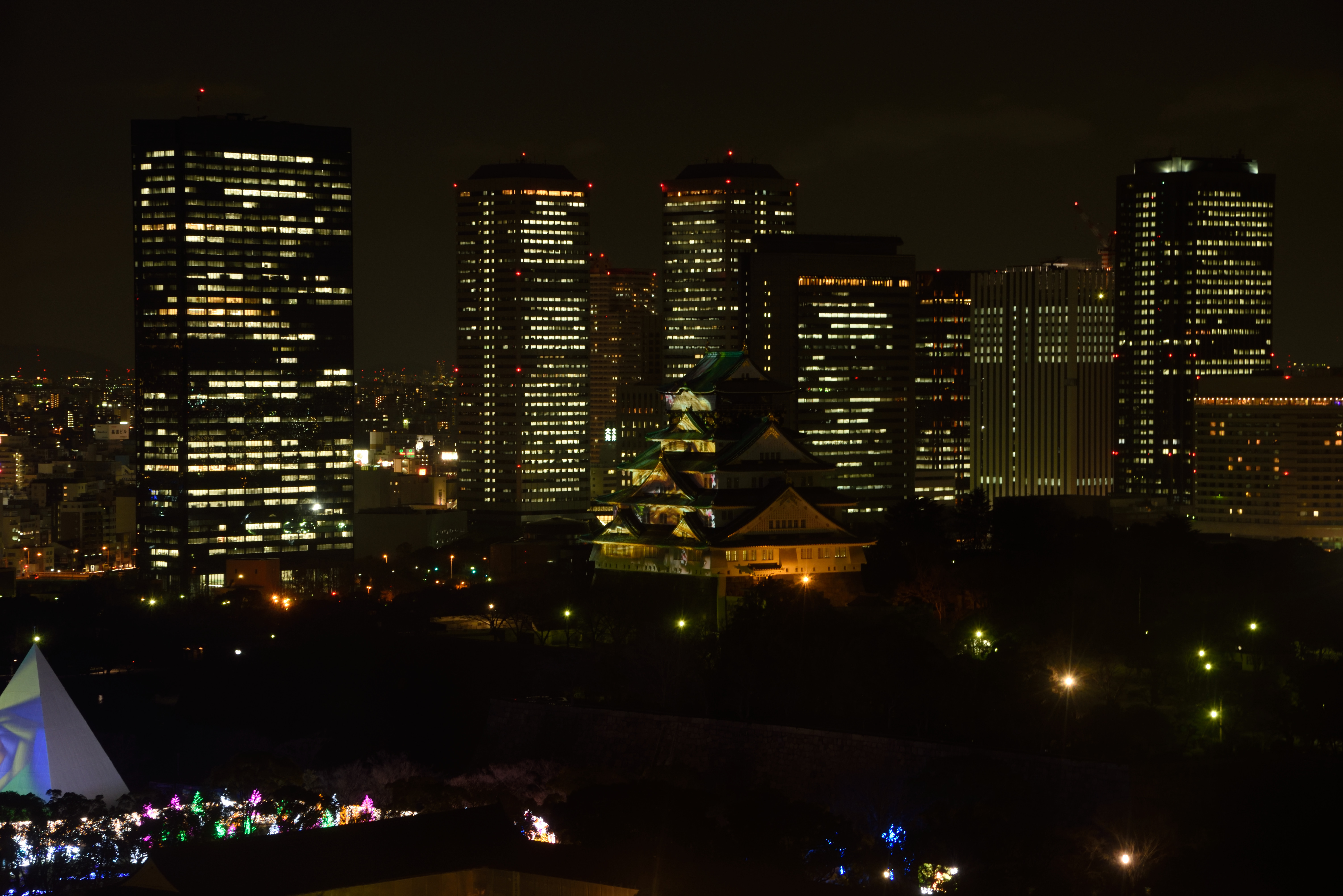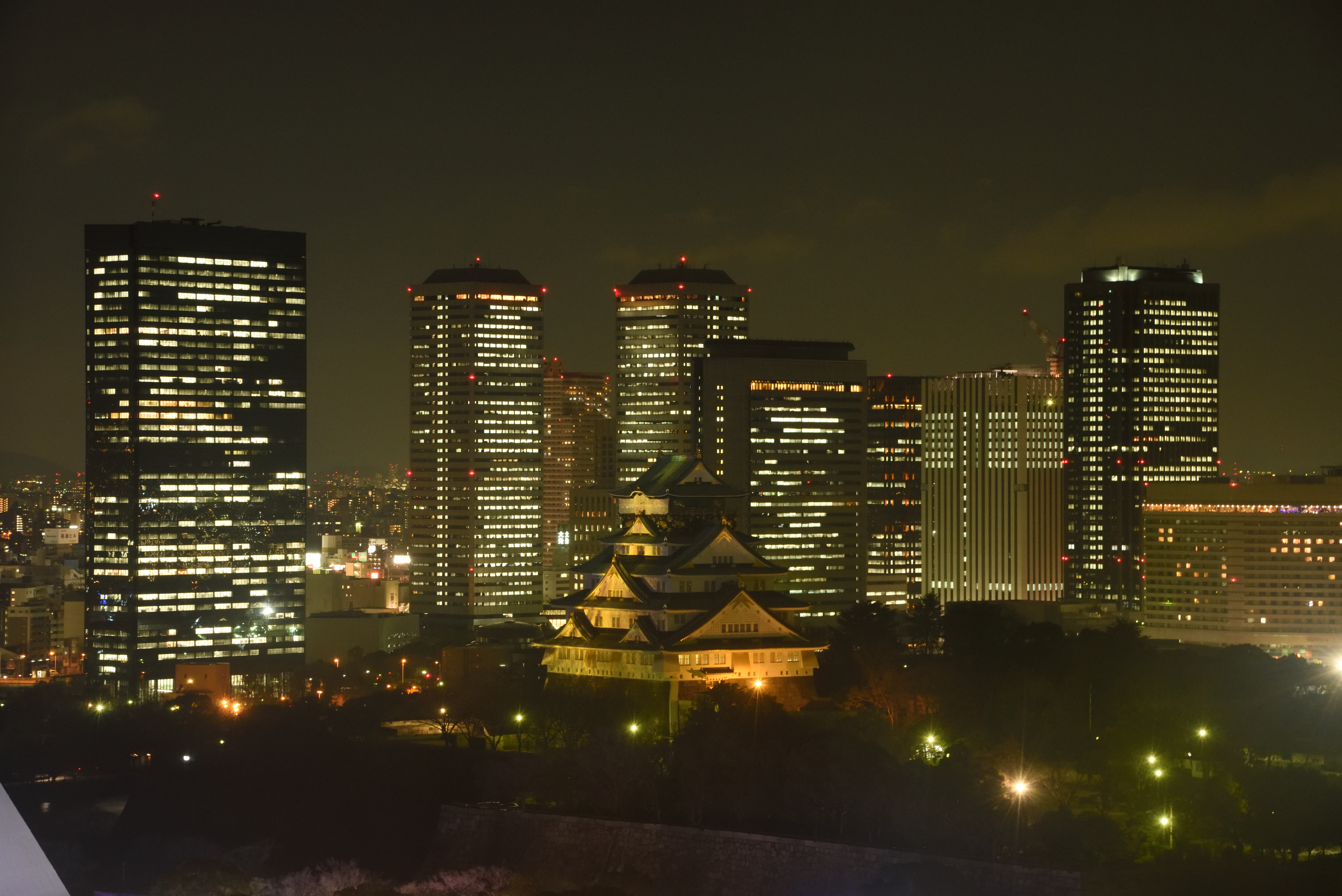 大阪歴史博物館から,高層ビルを背景に大阪城を望むことができます. 普段の閉館時間は17時ですが,金曜日のみ20時となっていて,このとき夜景を見ることができます. 館内の撮影は可能ですが,三脚は禁止です. プロジェクションマッピングをやっていました.大阪城が暗いです. |