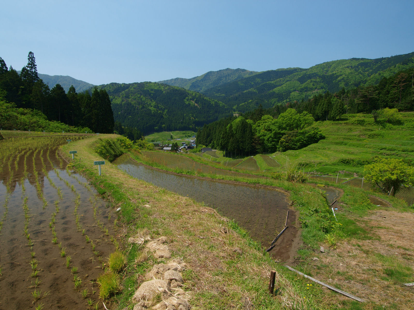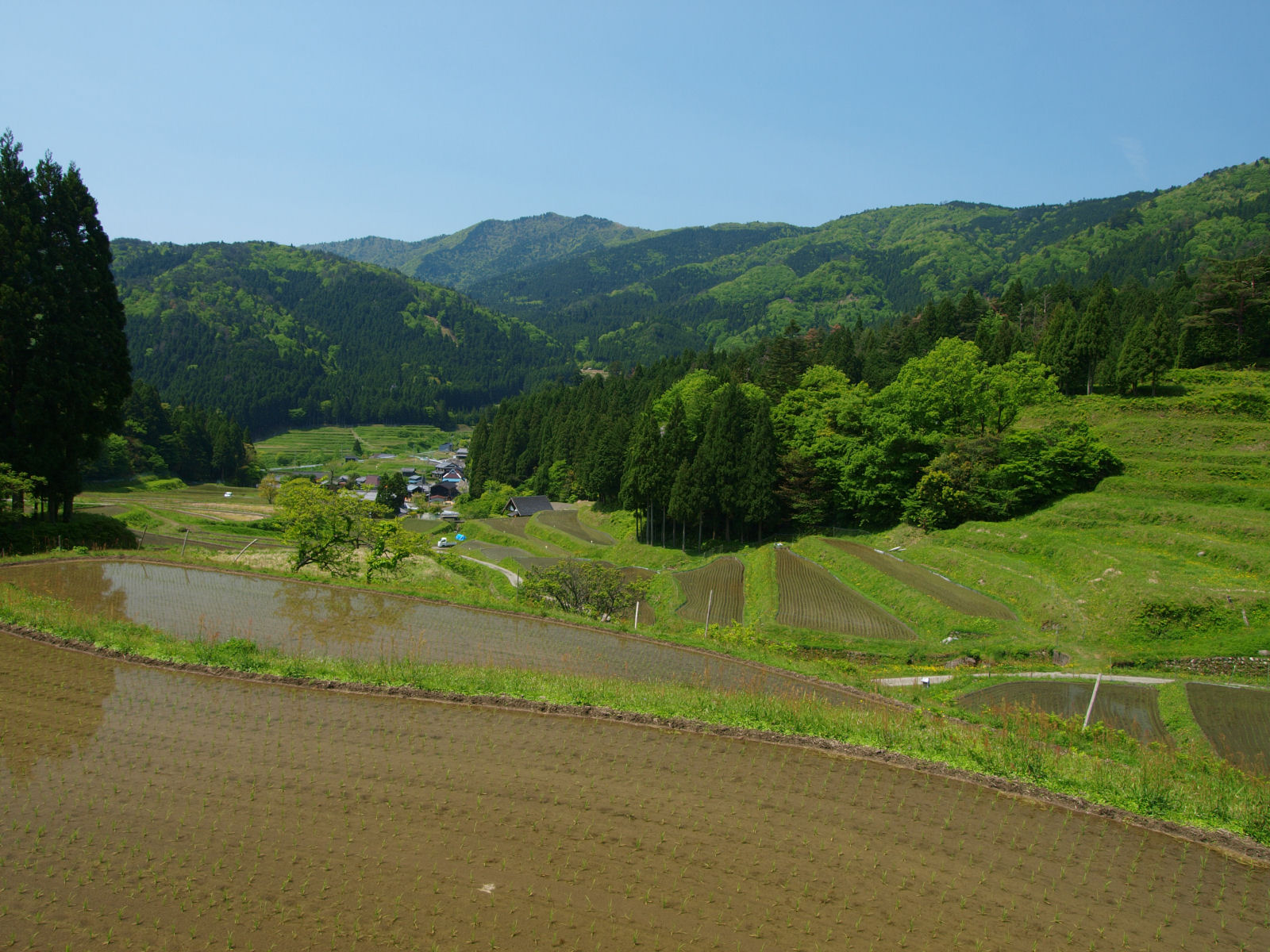 ちょうど水を張って田植えを終えたところのようで,美しく輝く棚田を撮ることができました. |