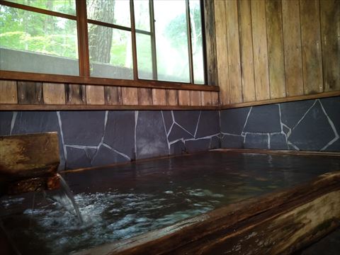 窓いっぱいに広がるもみじを見ながら浸かれる檜風呂です.