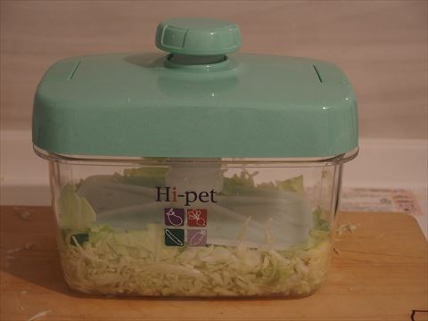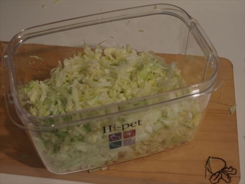 ザワークラウトを仕込む 2020/10/1(6年前) 日記, 食べ物 ザワークラウトを作る動画を見て,自分も作ってみようと思いました. 何でも炒めたり酢を使わなくても,塩を振っておけばキャベツが持っている乳酸菌で発酵するとか. キャベツを半玉刻みました.これで500gです. 2%の塩で揉み込むと水が出てきてきました. ホームセンターで買ってきた漬物器に入れ,圧力をかけるとまな板いっぱいにあったキャベツが大分縮みました. 数日置きます.