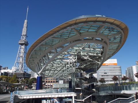 栄駅にある複合施設OASIS21の「水の宇宙船」と名古屋テレビ塔.