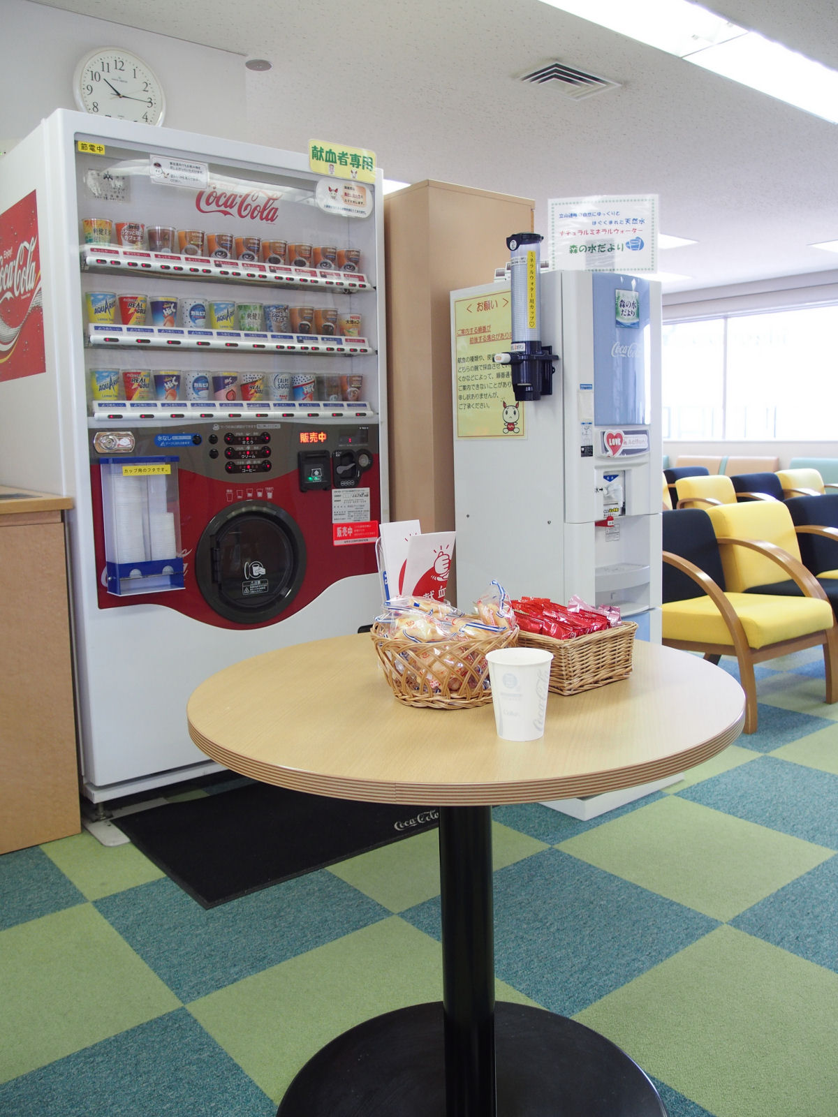こちらが献血ルームに用意されている食べ物と飲み物.