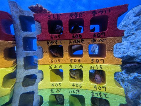 コンクリートブロックを魚のマンションに見立てた水槽.