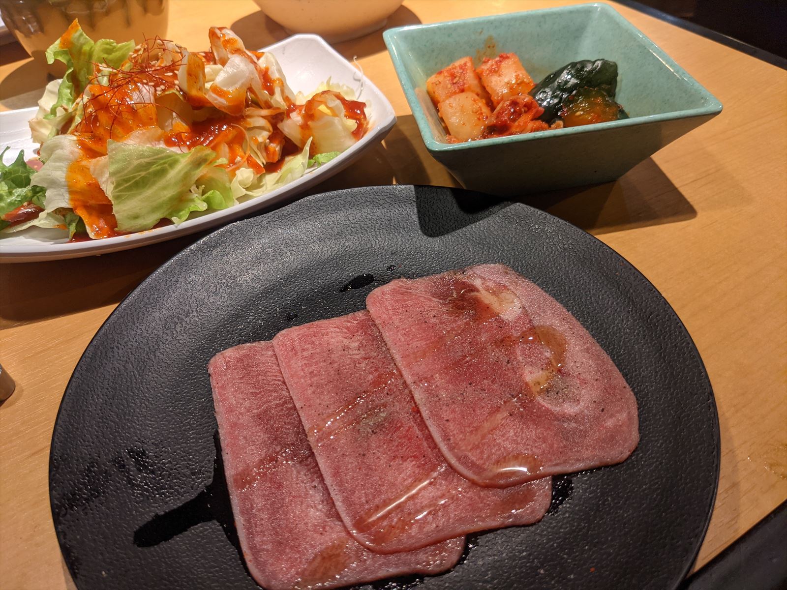 それと塩タン(ポーク),キムチ盛り合わせ,韓国風ピリ辛サラダを注文.