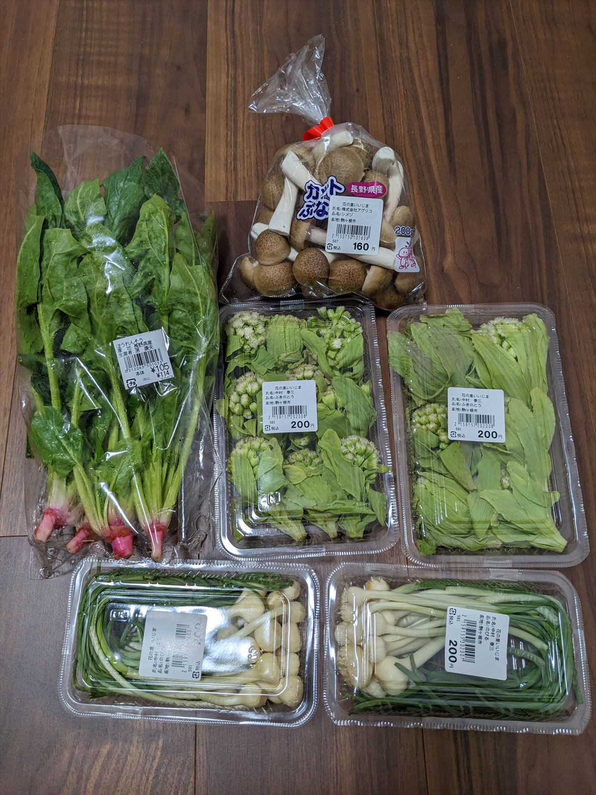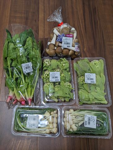 他にもふきのとうやシメジ,昼食用におやきを買いました.