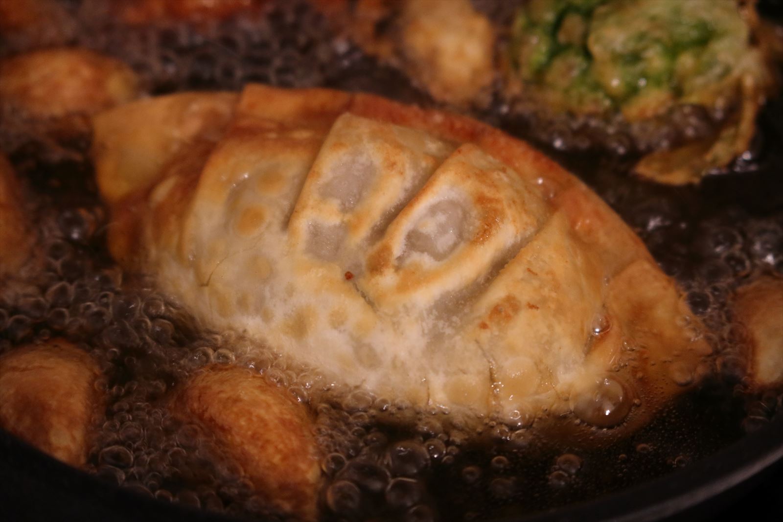 揚げてみると皮に歯ごたえがあり餡もほどよく調和して焼くよりおいしく食べられました.