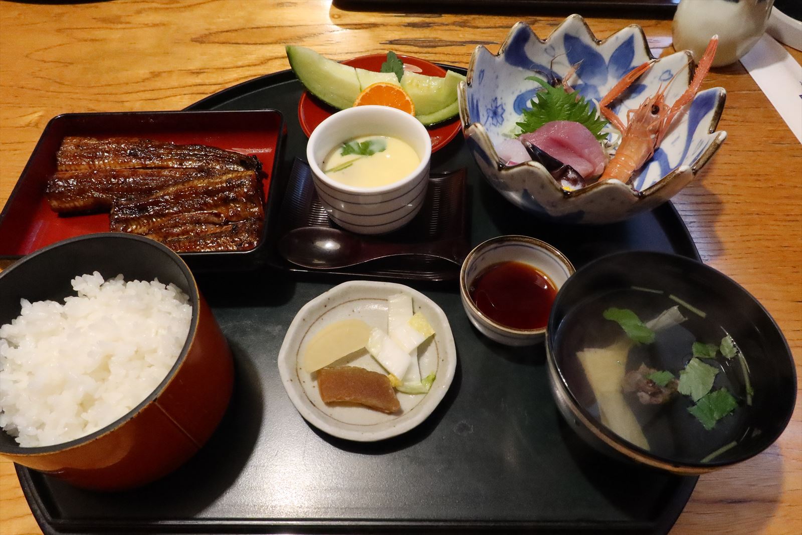 こちらはうなぎ御前.うなぎ,刺身,茶わん蒸し,デザートがあります.