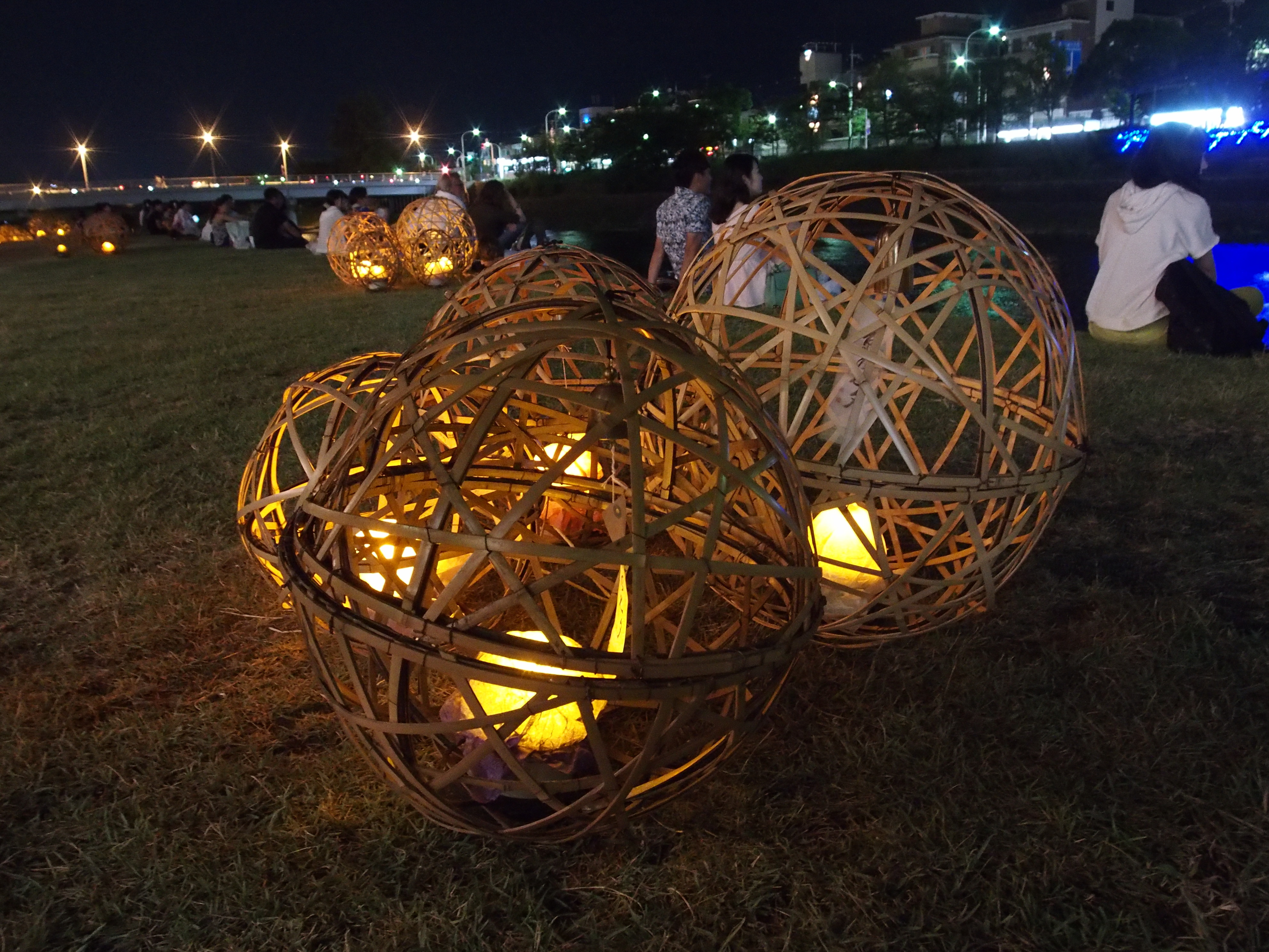 鴨川の岸を背景に灯篭を撮影.カップルやグループが等間隔で座るという「鴨川等間隔の法則」は健在です.
