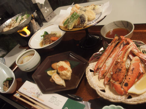 この日の夕飯はこの旅館で.刺身や鶏団子といった懐石プランに,焼きガニを追加しました.