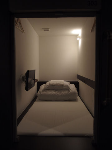 こちらは寝床.カプセルホテルやフェリーのベッドは空間が狭くて暑くなるという経験をしてきましたが,ここは立てる程度に天井が高く,暑い思いをせずに過ごすことができました.