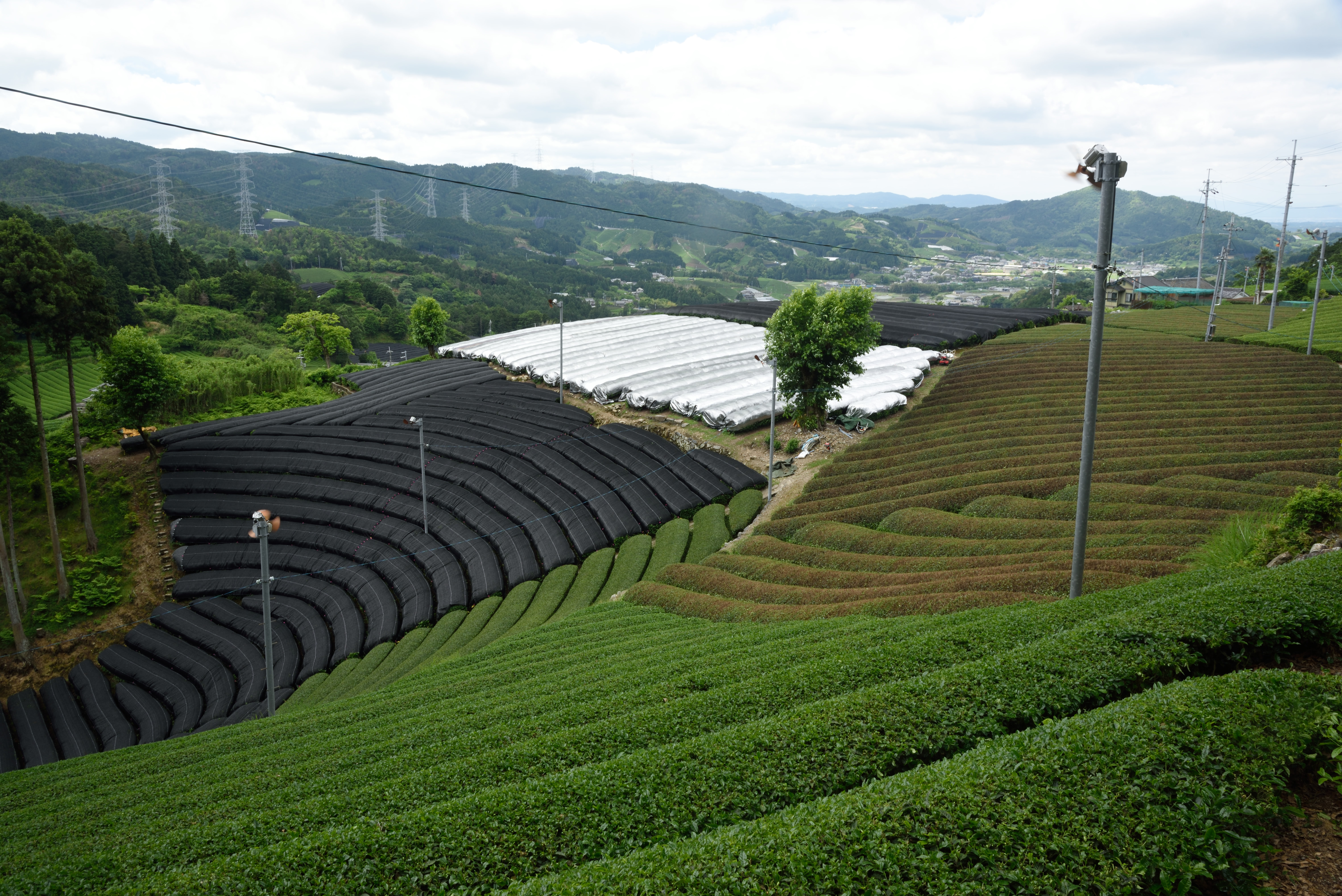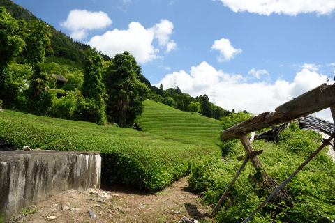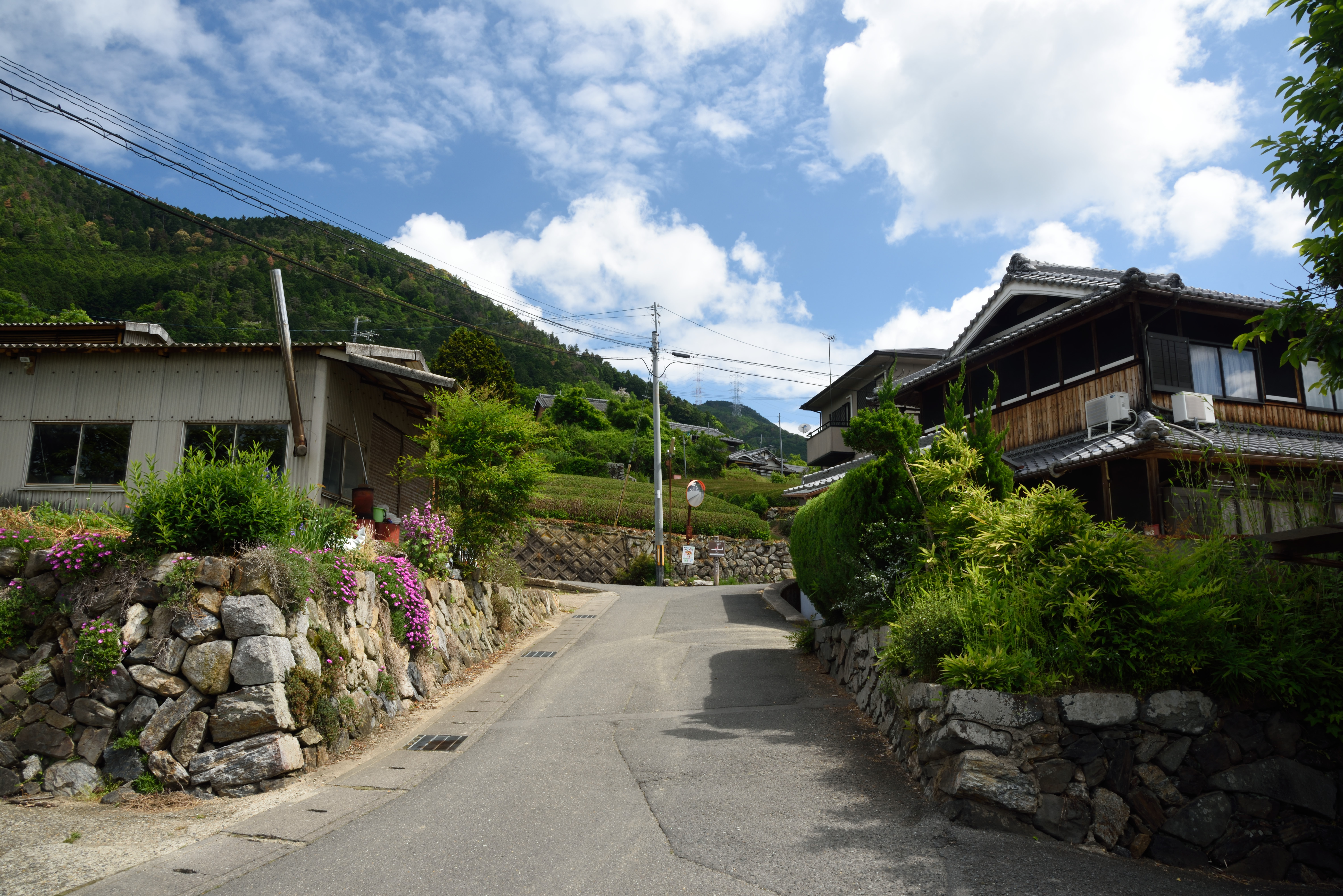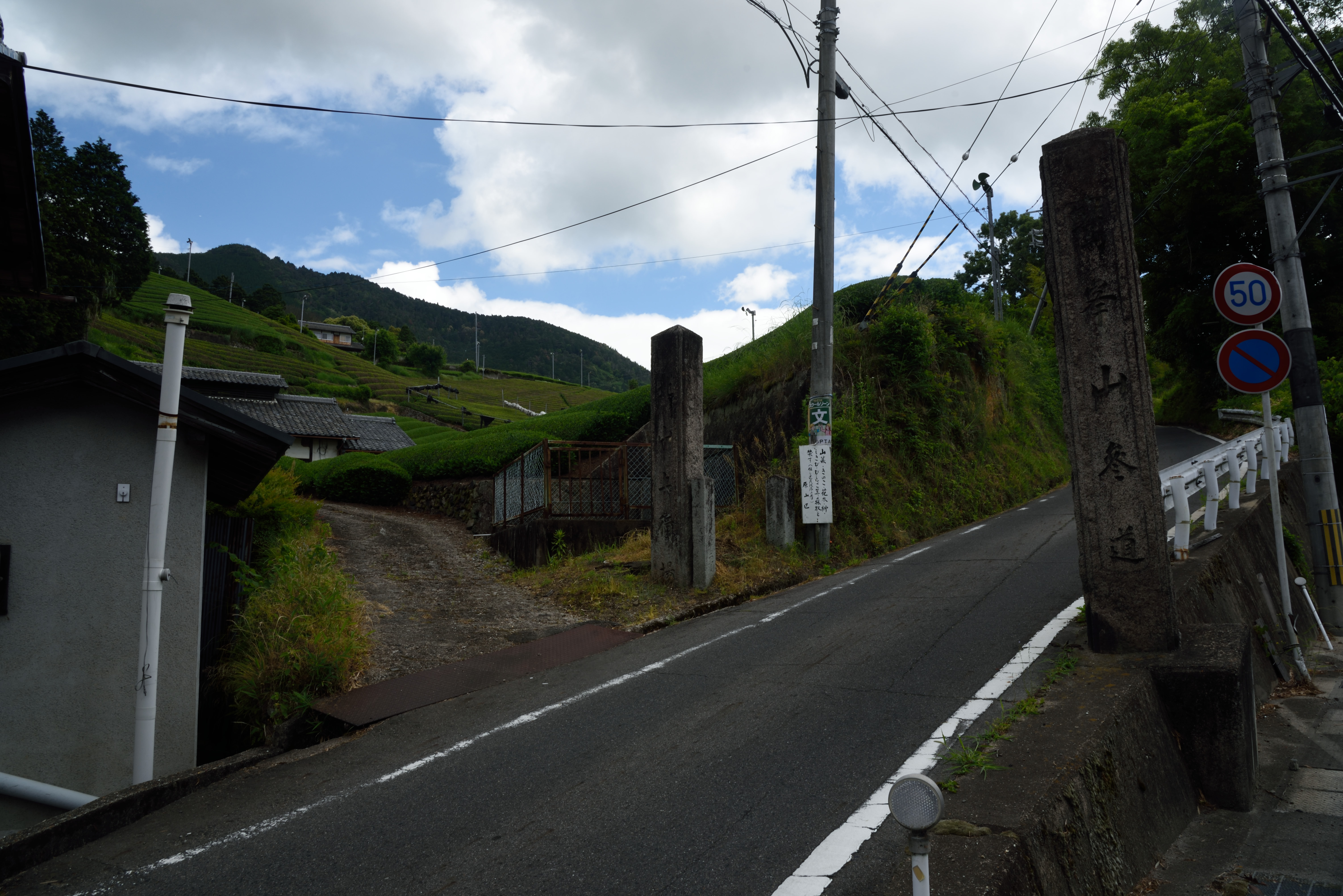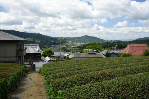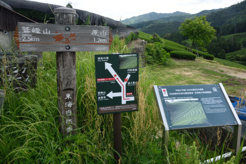 和束の茶畑~原山の円形茶園 2017/5/29(9年前) 京都, 写真, 近畿 (2017年5月28日) 原山というバス停で降りました. 天気のいい日をねらってきたつもりでしたが,バスを降りた時点で空には大分雲が多くなっていました. 東海自然歩道に沿って原山の茶畑を目指しました. 道はきつめの坂道.原山の茶畑は1kmほど先ですが,その前にも茶畑がたくさん見えました. 看板がありました.円形の茶畑はこの辺にあるようです. しばらく探しましたが(実は鷲峰山の方に行ってから戻って来たとき気づきました),どうやらこれのようです. 網がかかっていたり葉が摘み取られていたりで,イマイチな状態でした.