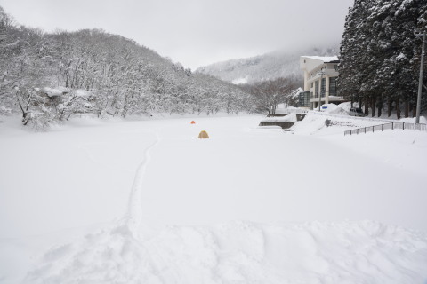バスターミナルの近くにある盃湖.湖のはずですが,雪の積もった敷地にしか見えません.