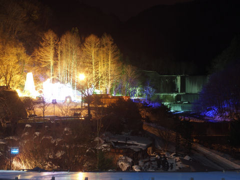 手前は露天風呂,奥は氷像のライトアップ.