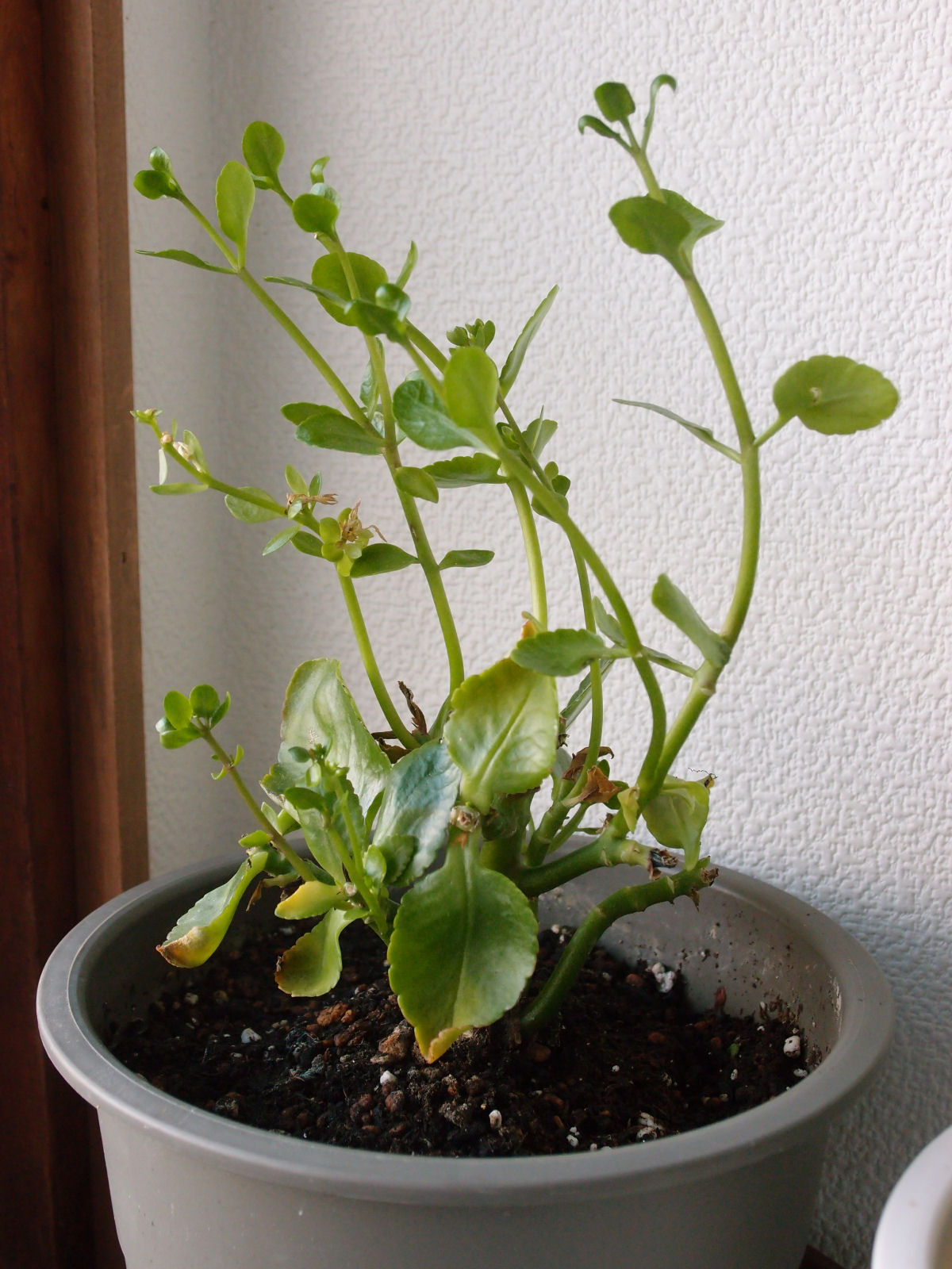 ミリオンスターのその後 2012/7/15(14年前) 日記, 鉢植え 過去にミリオンスターの花が咲き,その後満開になったことを記事にしましたが,その後どうなったかというと,今はこんな感じです. たくさんあった花はどんどん枯れ,葉っぱも黄色くなってきたので,それらを摘んでいったら,新しい茎がひょろひょろ生えてきて,ずいぶん様変わりしました. 挿し芽で増えるそうなので,新しく育てたほうがいいんですかねえ.