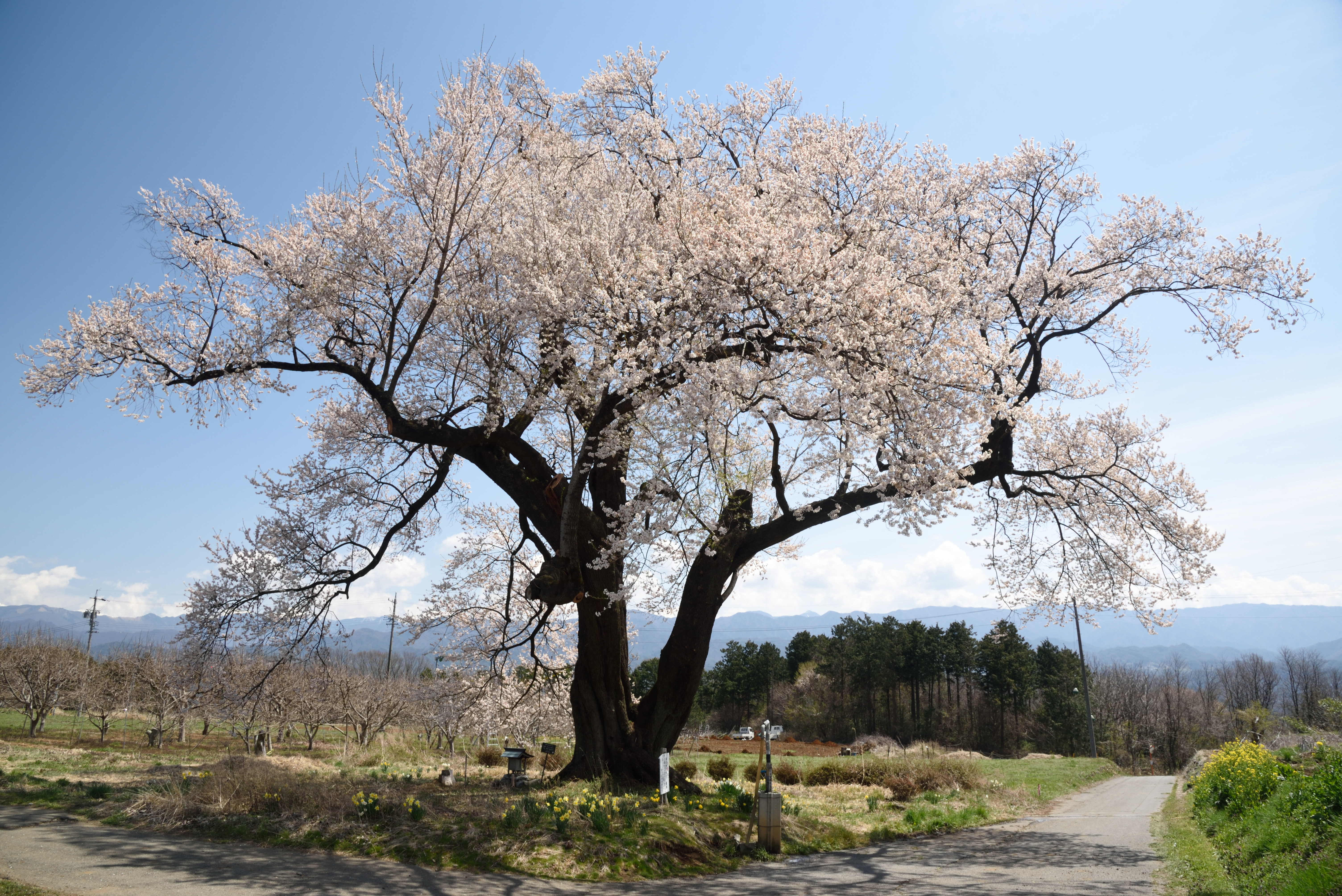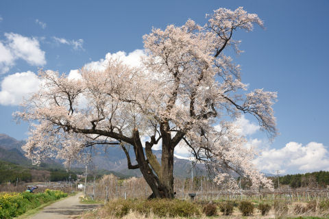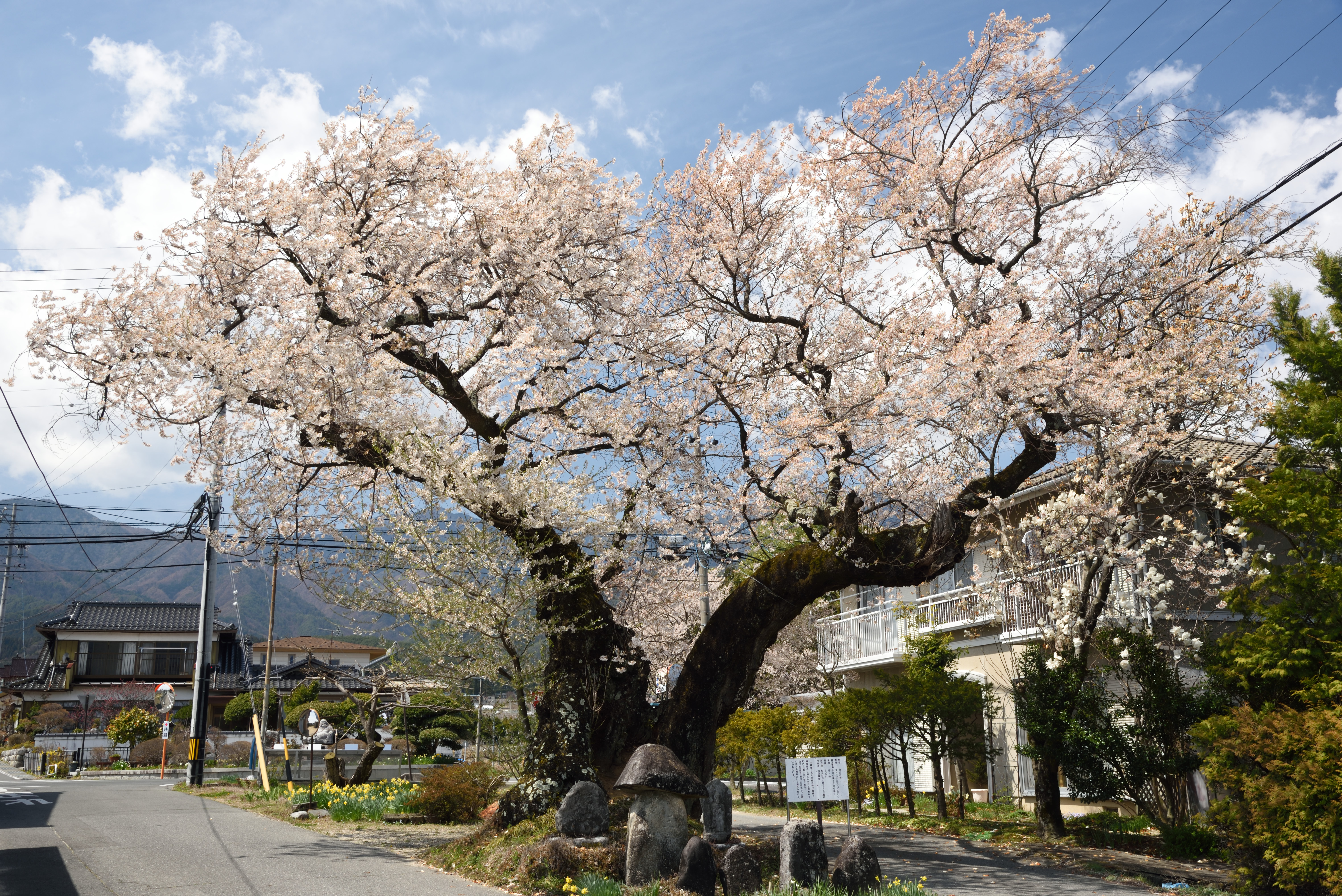 高森町・松川町の桜 2020/4/11(6年前) 写真, 甲信越, 長野 この日は長野県の伊那から飯田の間で桜巡りをしました. まずは飯田市と駒ヶ根市の間にある,高森町と松川町です. こちらは高森町の御帳木・新田原の桜. 畑の中にあります. 東側から見ると雪の残った駒ヶ岳が見えます. 松川町,原田の桜. 桜を避けるように道が分かれています. 桜の下にはお墓と案内板. 鎌倉期に植樹されたそうです. オマケ. 最初は原田の桜は松川町役場周辺にあると思ってうろうろしていたら,隣にある松川中学校で満開の桜と冠雪した駒ヶ岳が見えました. 今回行った高森町・松川町の桜はこのくらいですが,あちこちでソメイヨシノが満開でした.