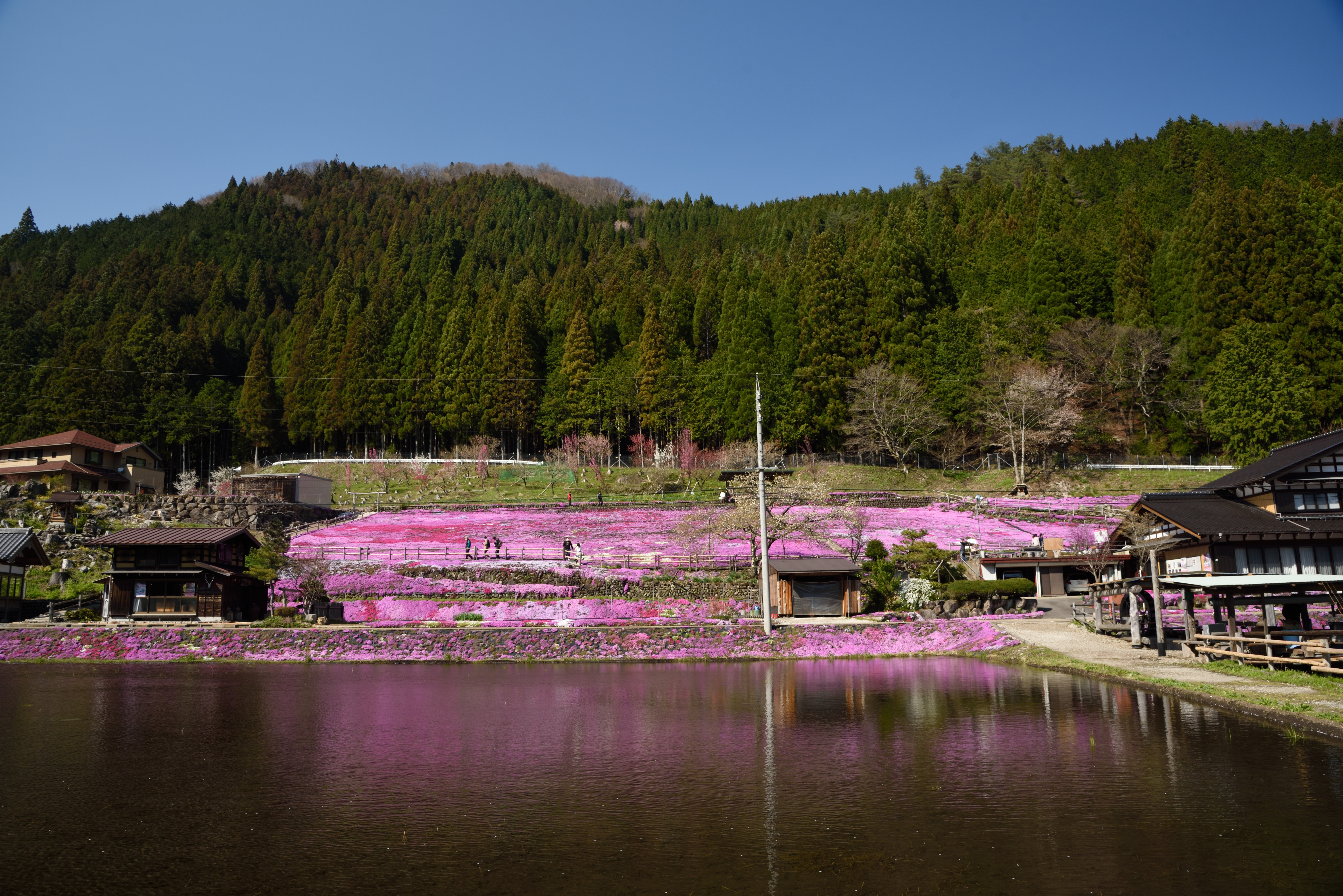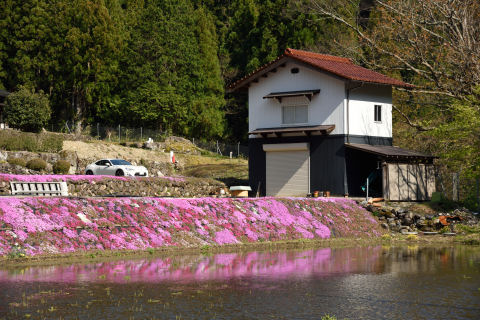 蔵の方を見ると水面にきれいに芝桜が写っていました.