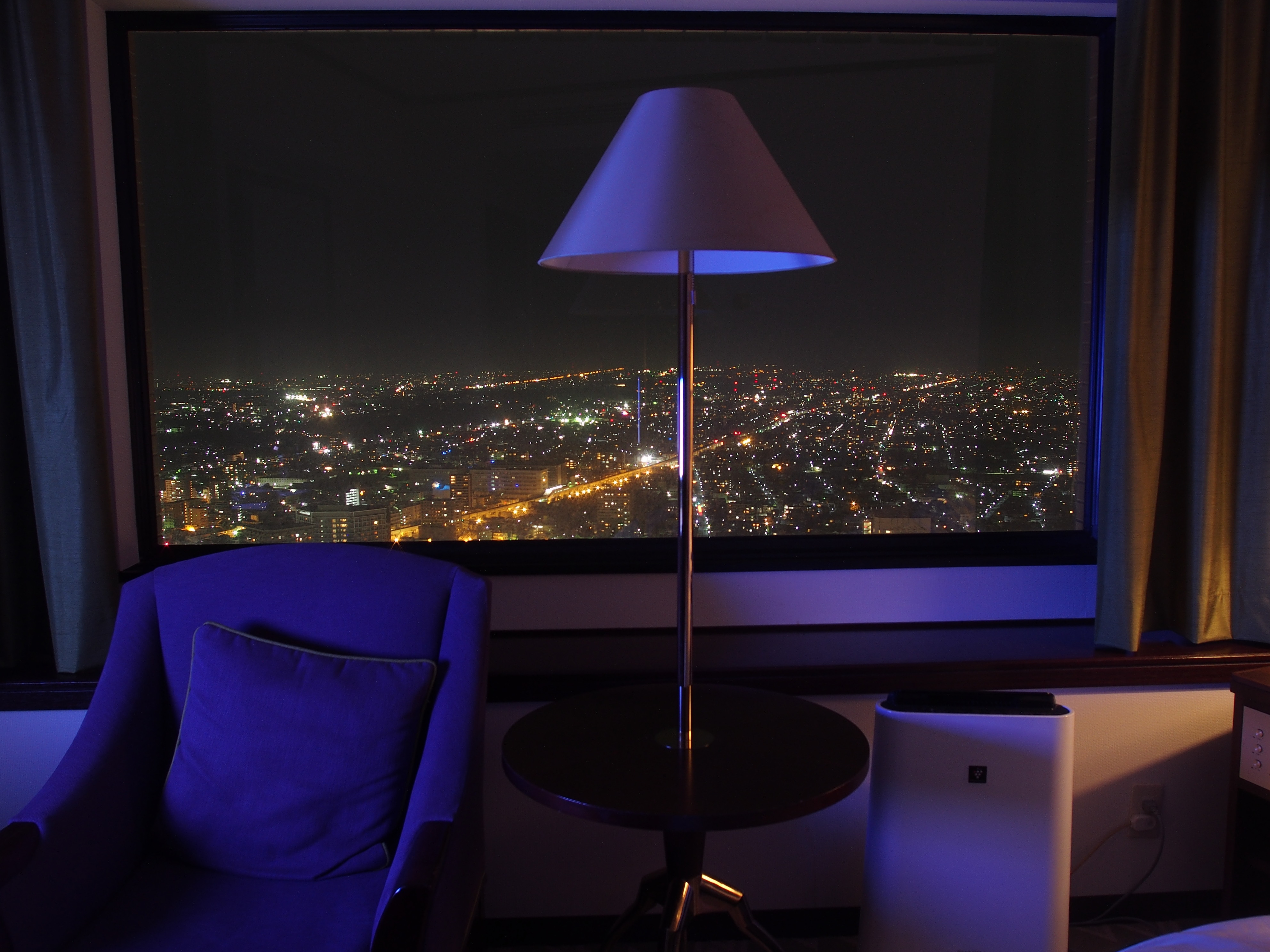 夜景と部屋の両方が写るように,明かりを極わずか点けて撮っています.青いのはテレビからの光です.