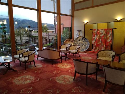 ロビー.着物やらでかい皿やらが飾ってあり豪勢です.