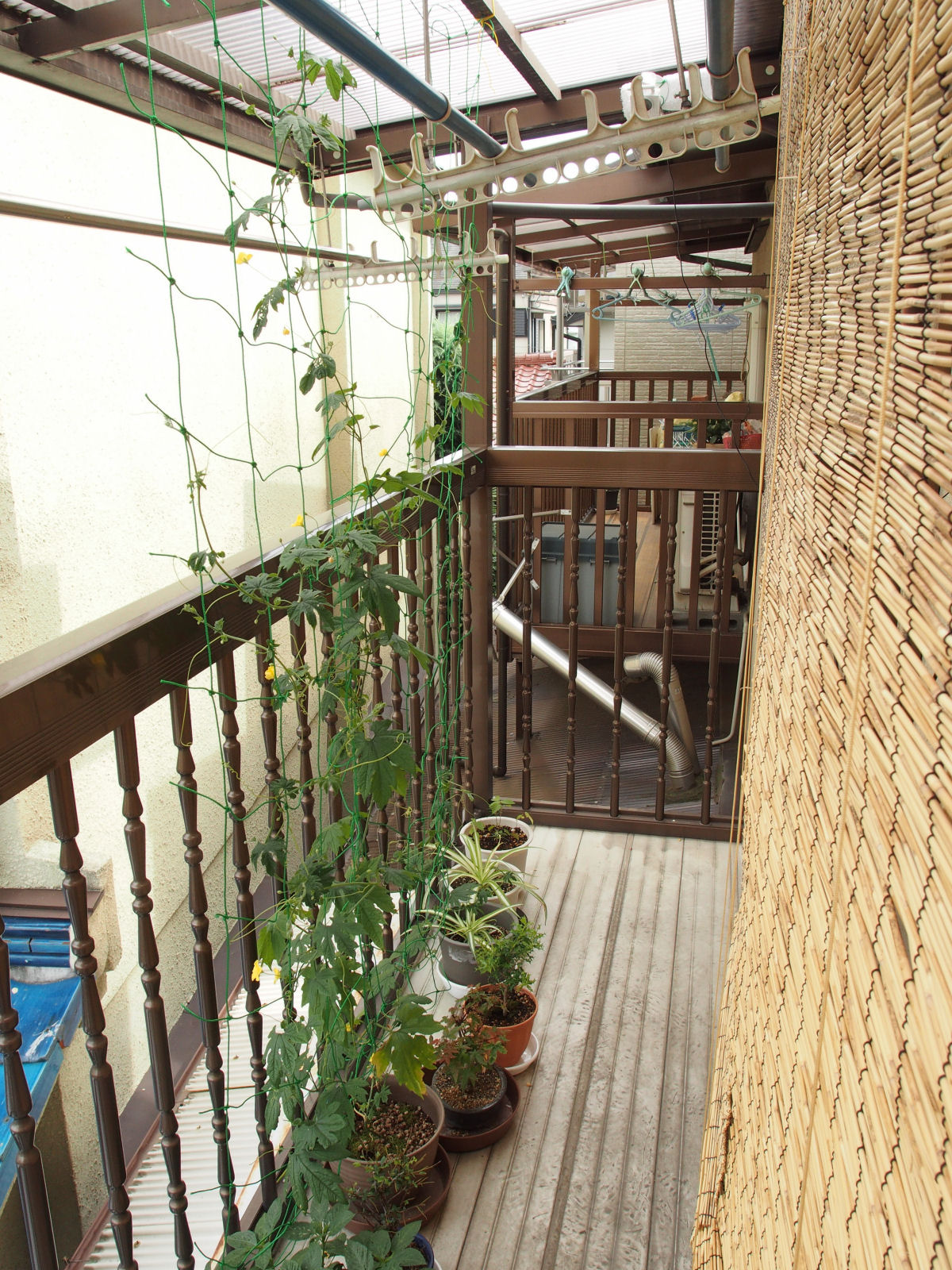 1本の上に伸びるツルが屋根に届いただけなので,緑のカーテンというにはスカスカです.